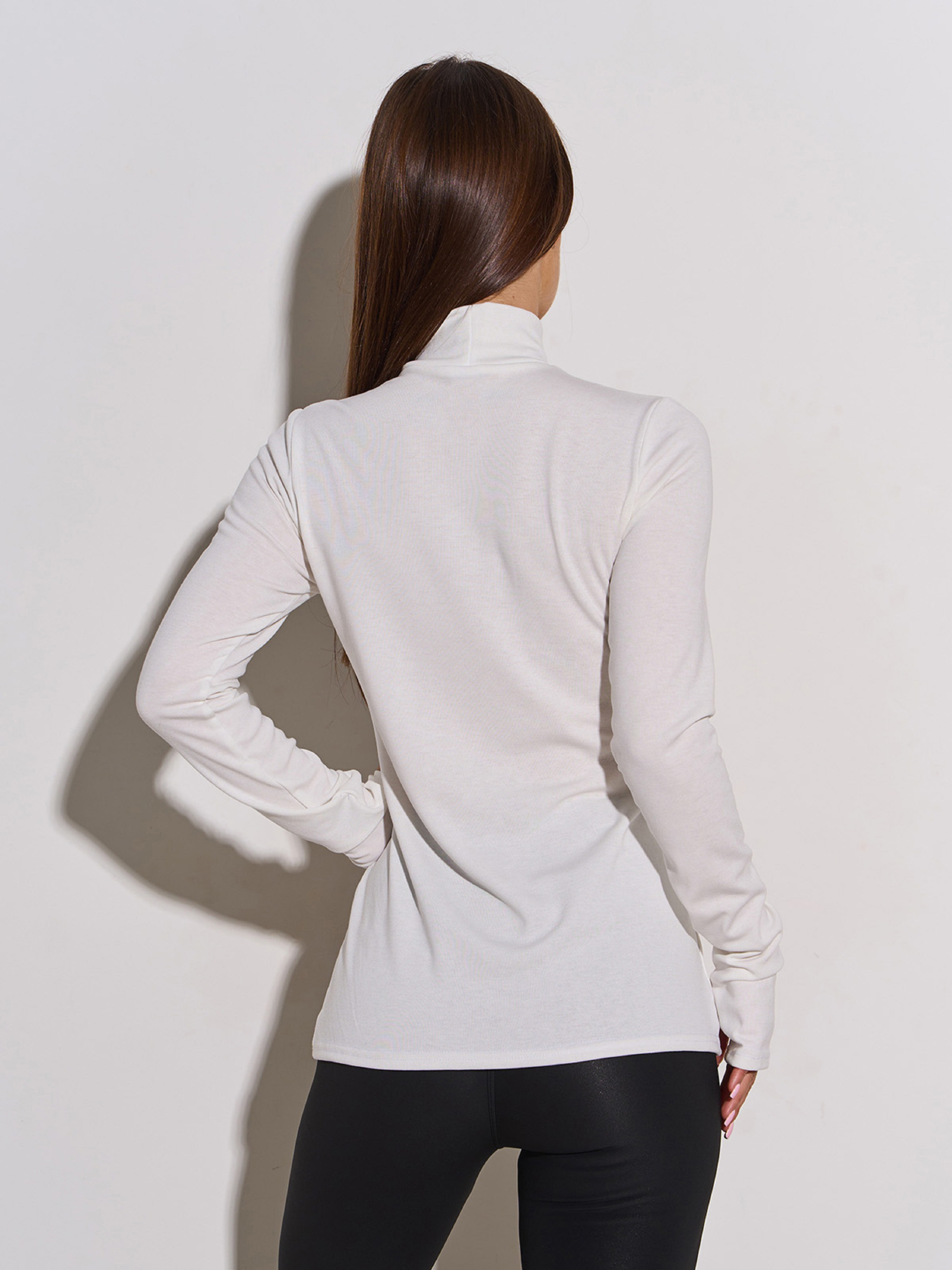 Утепленная водолазка молочного цвета, выполненная из эластичного вискозного трикотажа с начесом. Модель прямого кроя с воротником-стойкой и длинными рукавами, декорированными вырезами для больших пальцев. Полуобхват: Грудь: S (39), M (41), L (43), XL (45), Длина изделия - 65, Рукав - 65, Ткань: Высокой эластичности.