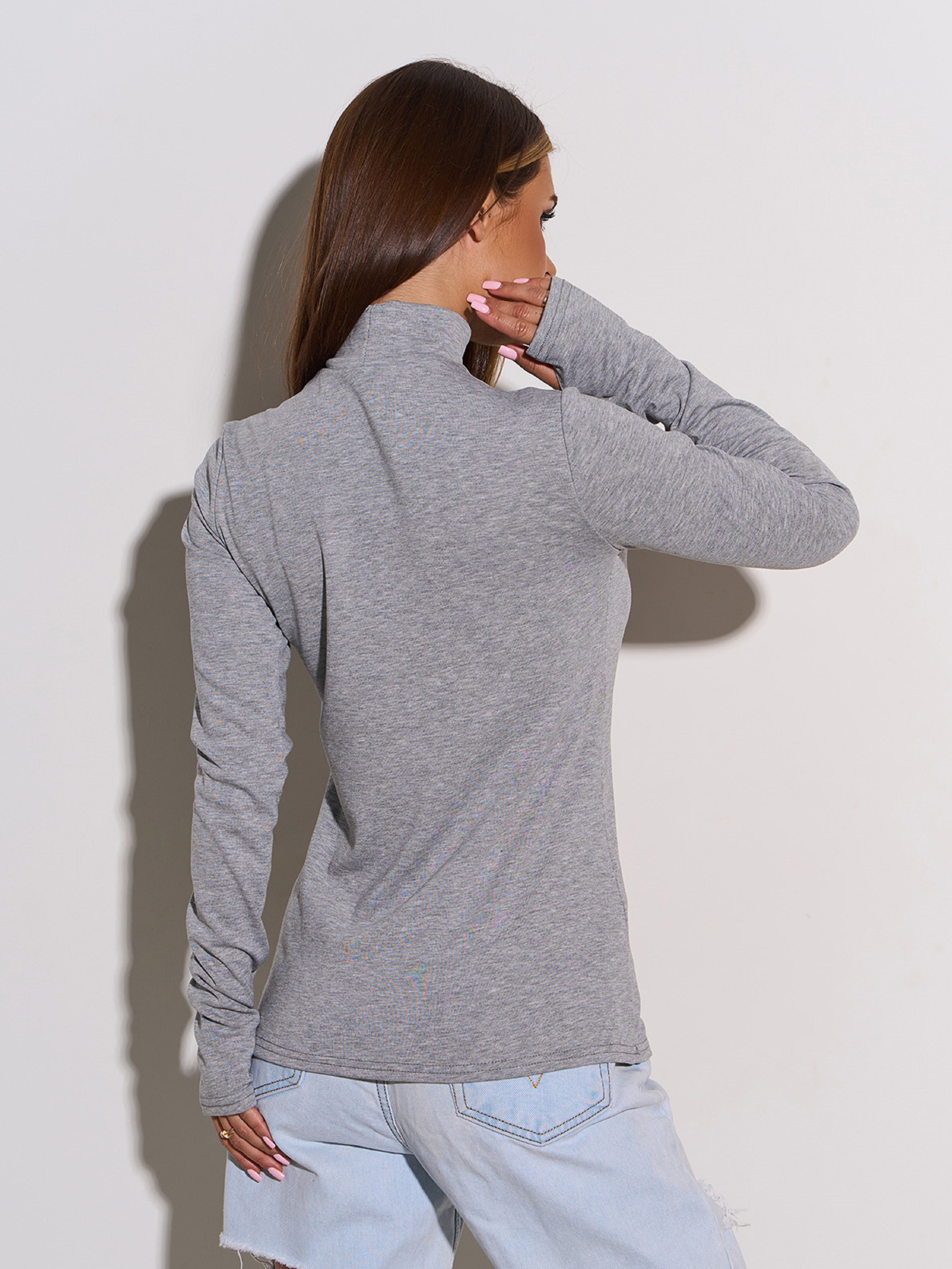 Светло-серая водолазка с воротником-стойкой, выполненная из эластичного вискозного трикотажа с начесом. Модель прямого кроя с длинными рукавами, декорированными вырезами для больших пальцев. Полуобхват: Грудь: S (39), M (41), L (43), XL (45), XXL (47), 3XL (49), 4XL (51), 5XL (53), Длина изделия - 65, Рукав - 65, Ткань: Высокой эластичности.