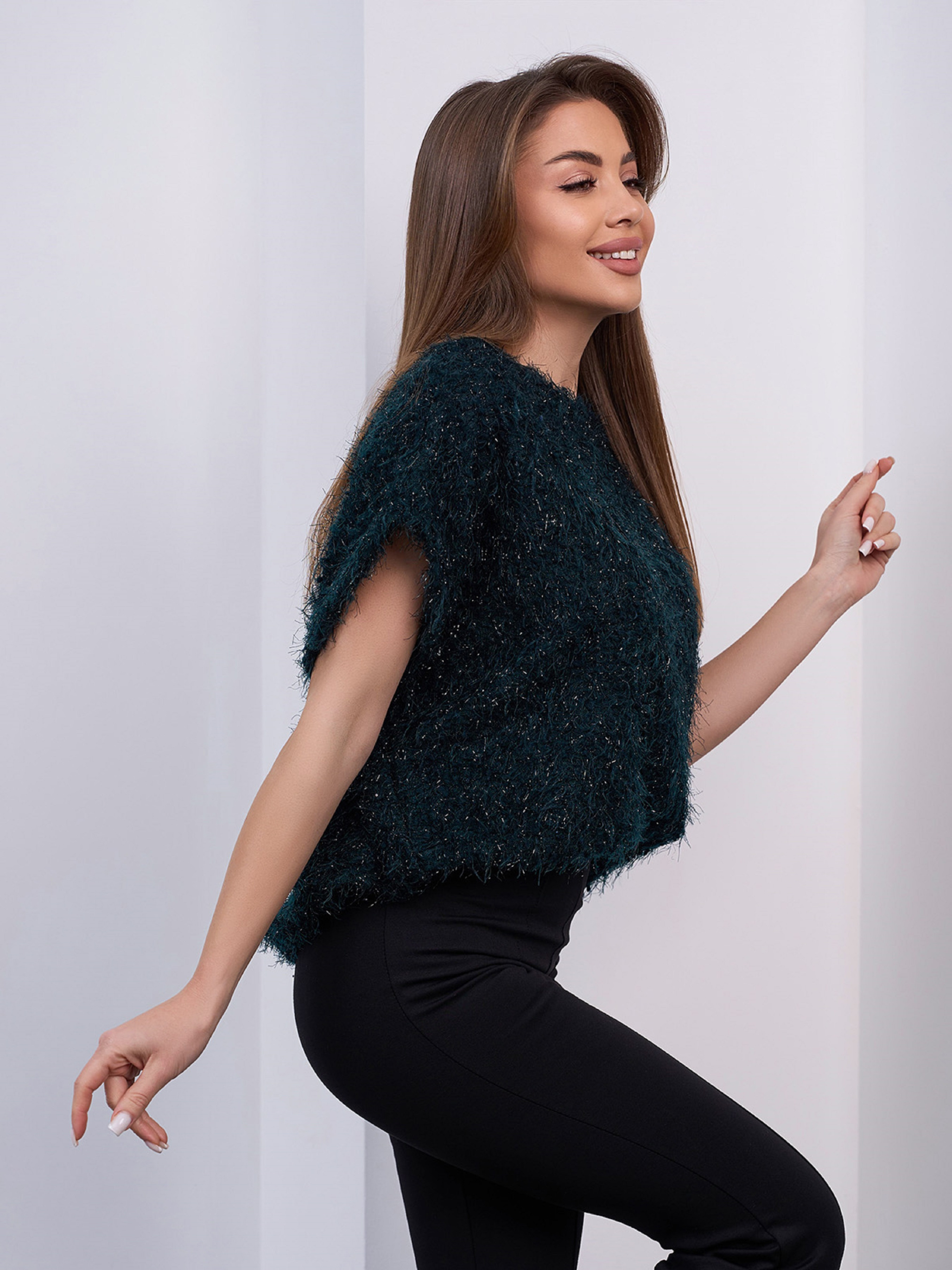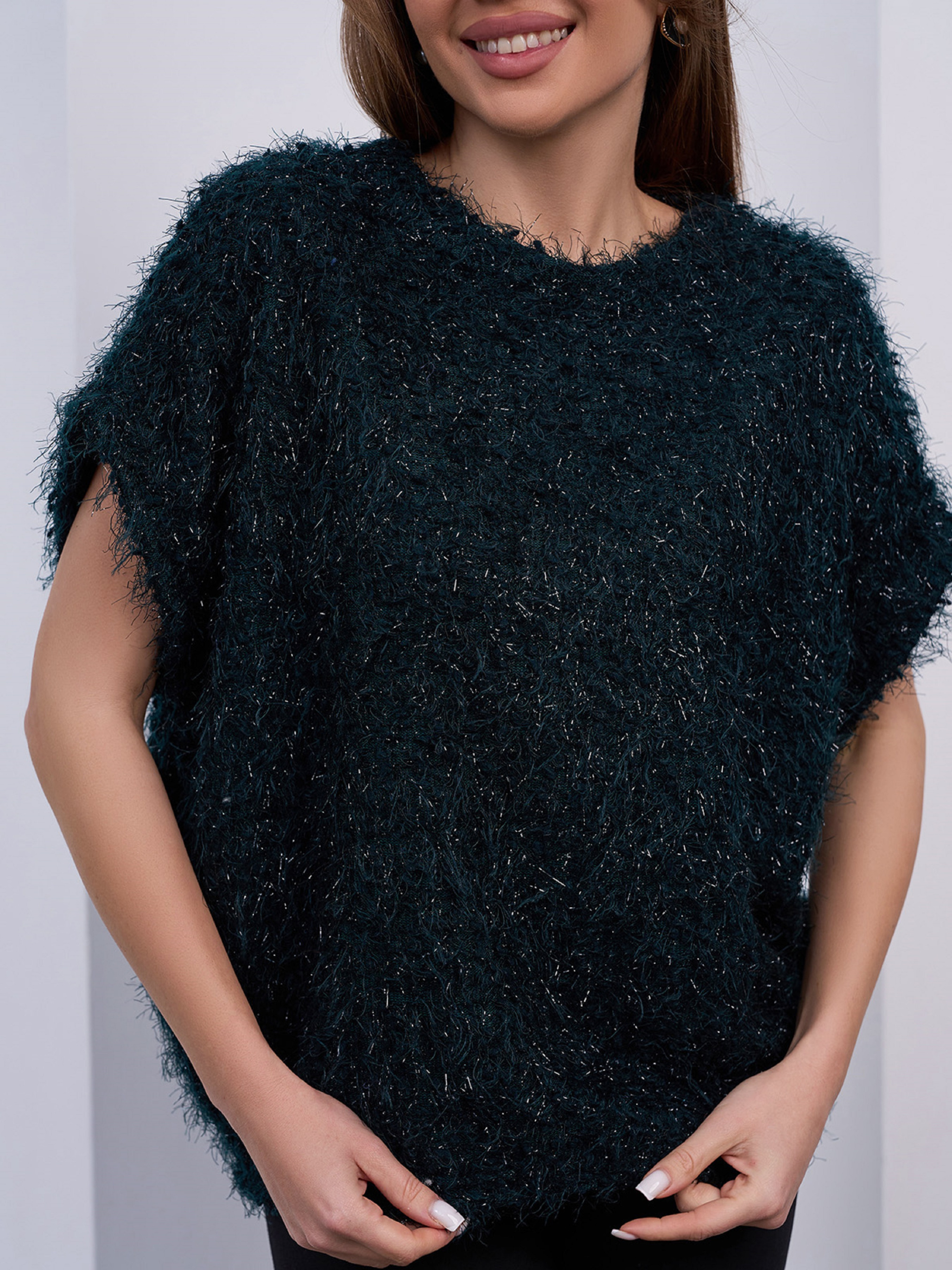 Темно-зеленый свитер свободного кроя с короткими приспущенными с плеч рукавами. Модель из фактурного объемного трикотажа-травки с люрексом. Свитер с полукруглой горловиной. Полуобхват: Грудь: S (66), M (68), L (70), XL (72), Длина изделия - 62, Рукав - 12, Ткань: Высокой эластичности.