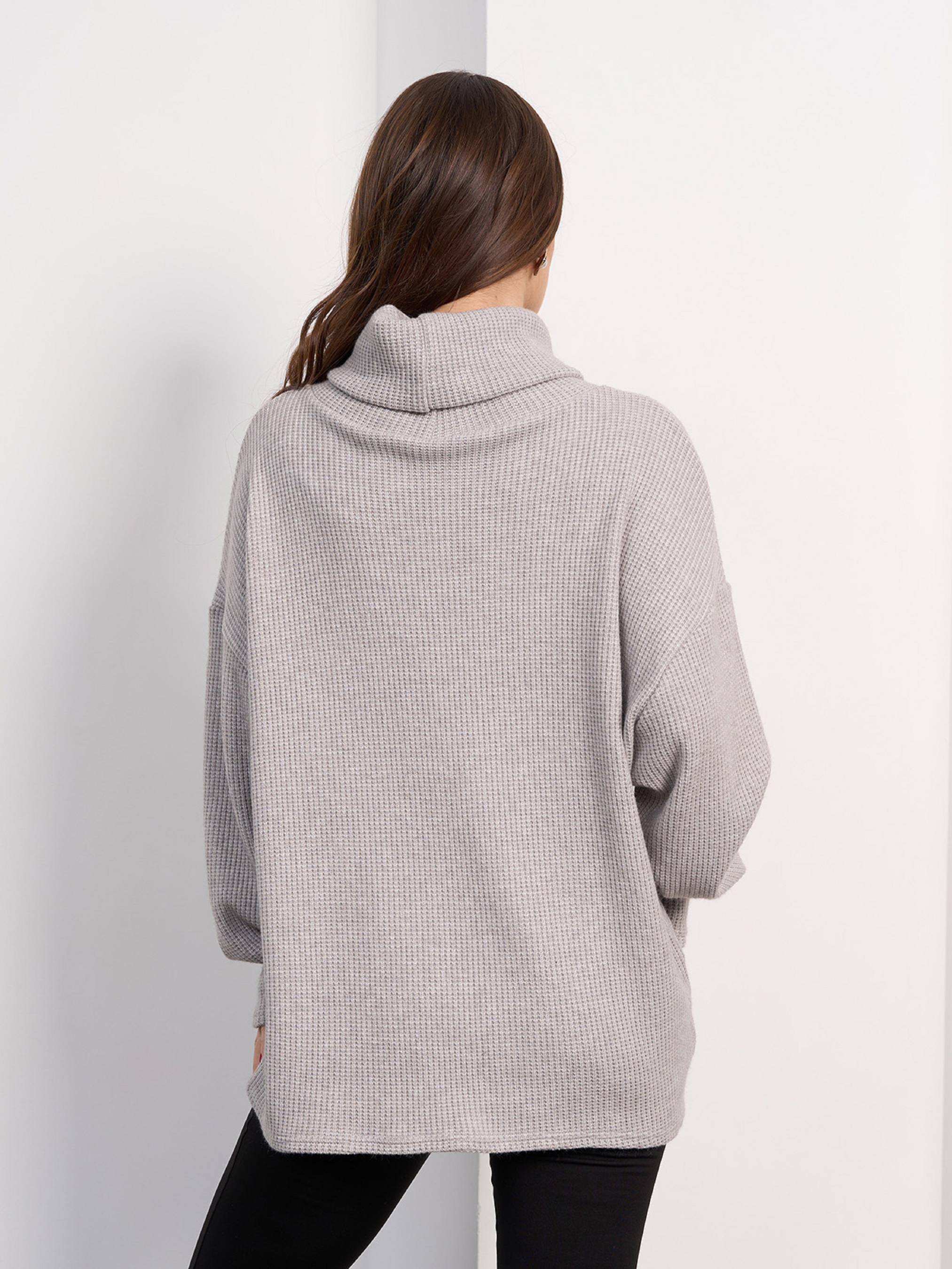 Серый свитер трикотажной вязки с объемным высоким воротником. Модель с длинными приспущенными в плеч рукавами и свободным удлиненным кроем. Полуобхват: Грудь: S (58), M (60), L (62), XL (64), XXL (66), 3XL (68), Длина изделия - 68, Рукав - 59, Ткань: Высокой эластичности