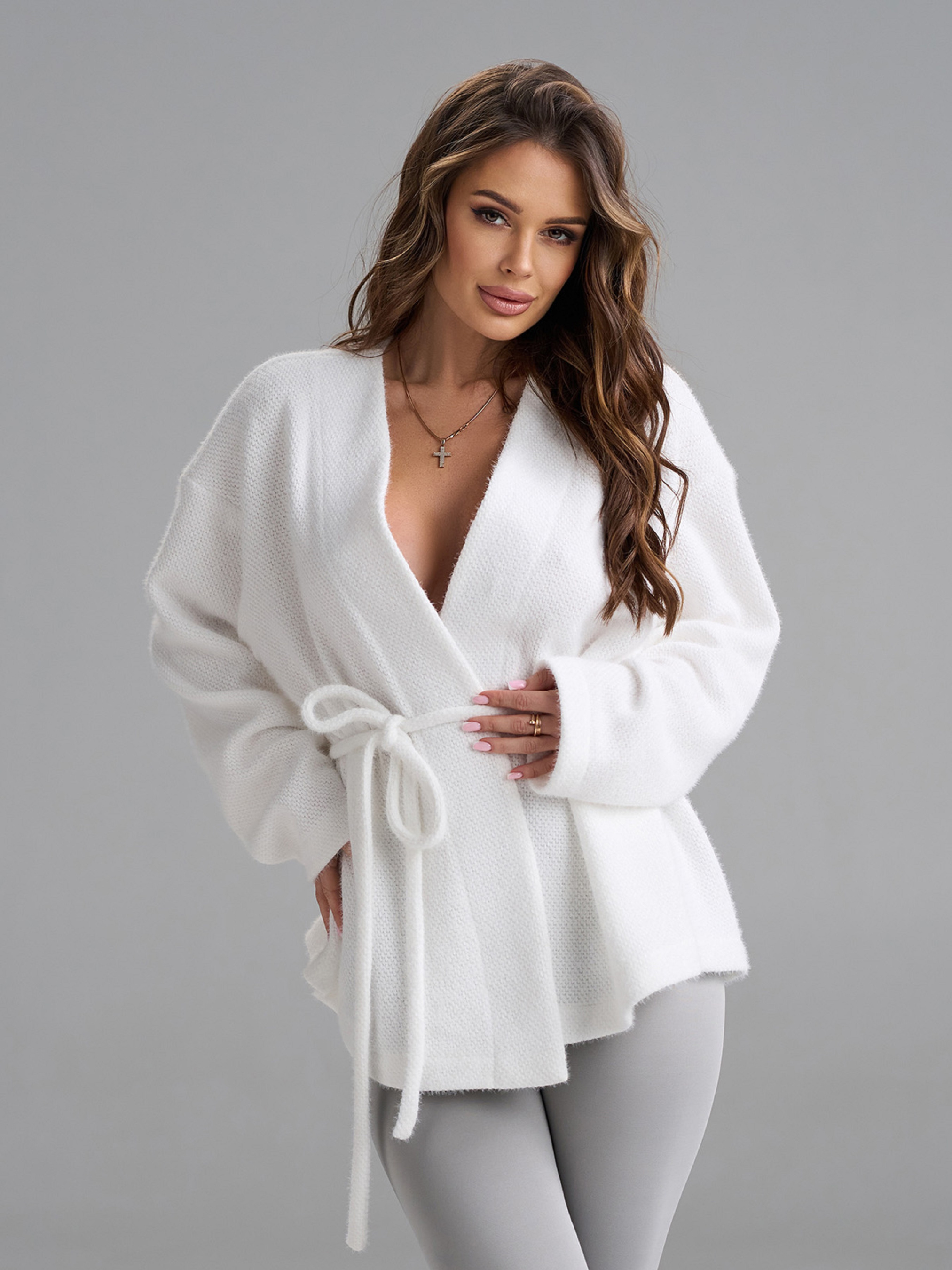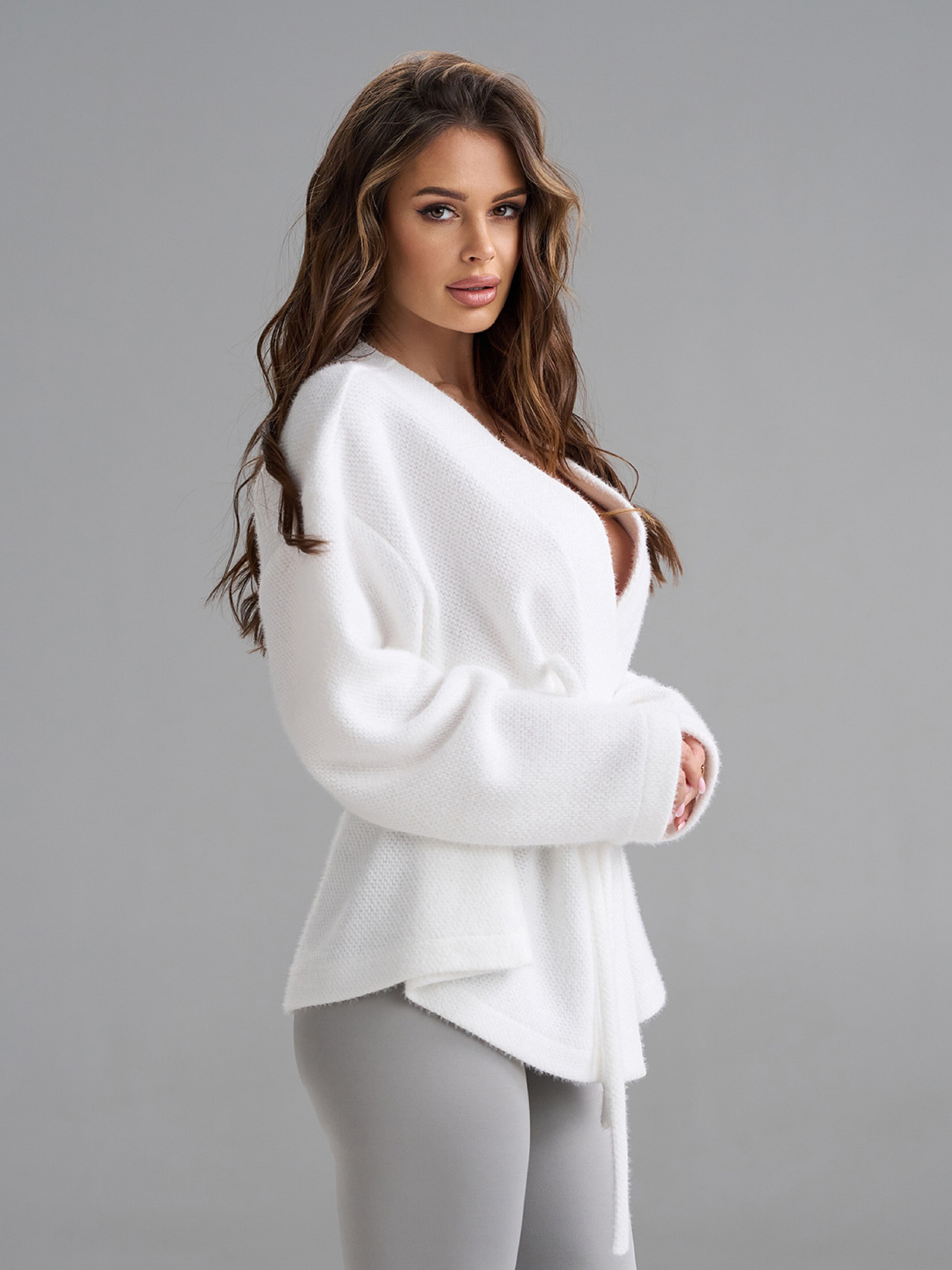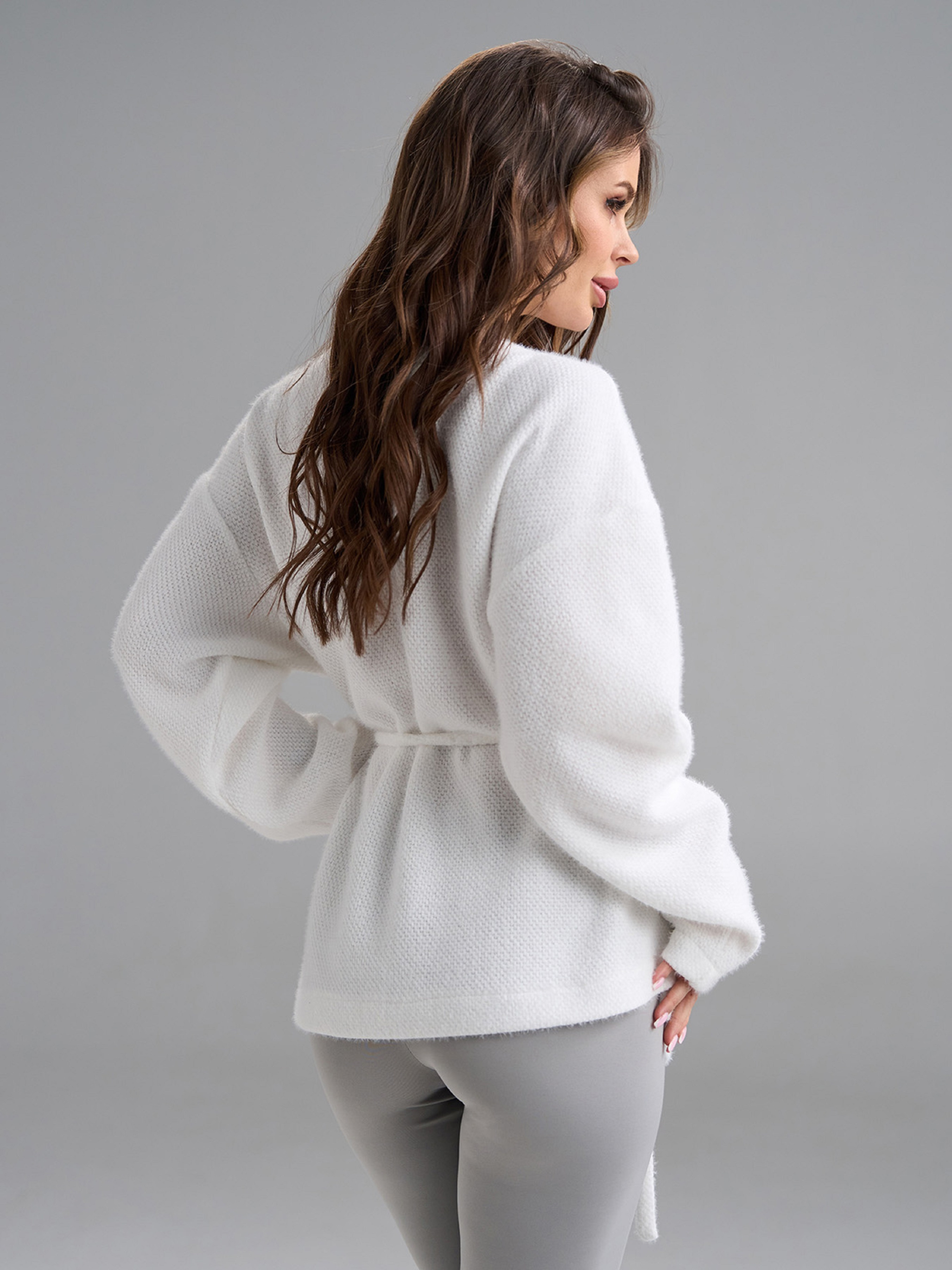 Демисезонный приталенный кардиган с запахом, выполненный из однотонной белой эко-альпаки. Модель с V-образной горловиной и длинными рукавами. Модель на поясе. Полуобхват: Грудь: S (63), M (65), L (67), XL (69), Длина изделия - 66, Рукав - 52, Ткань: Низкой эластичности.
