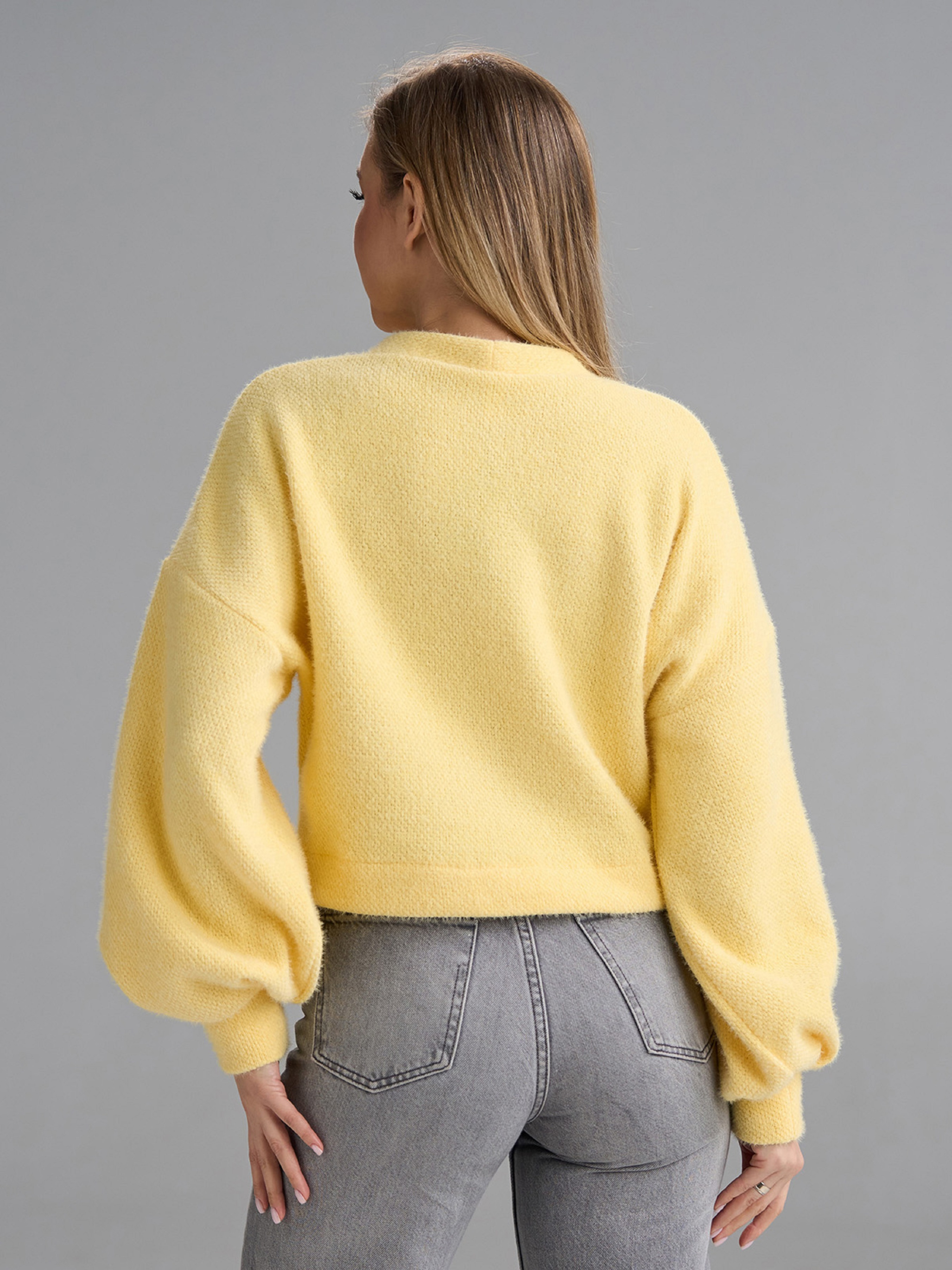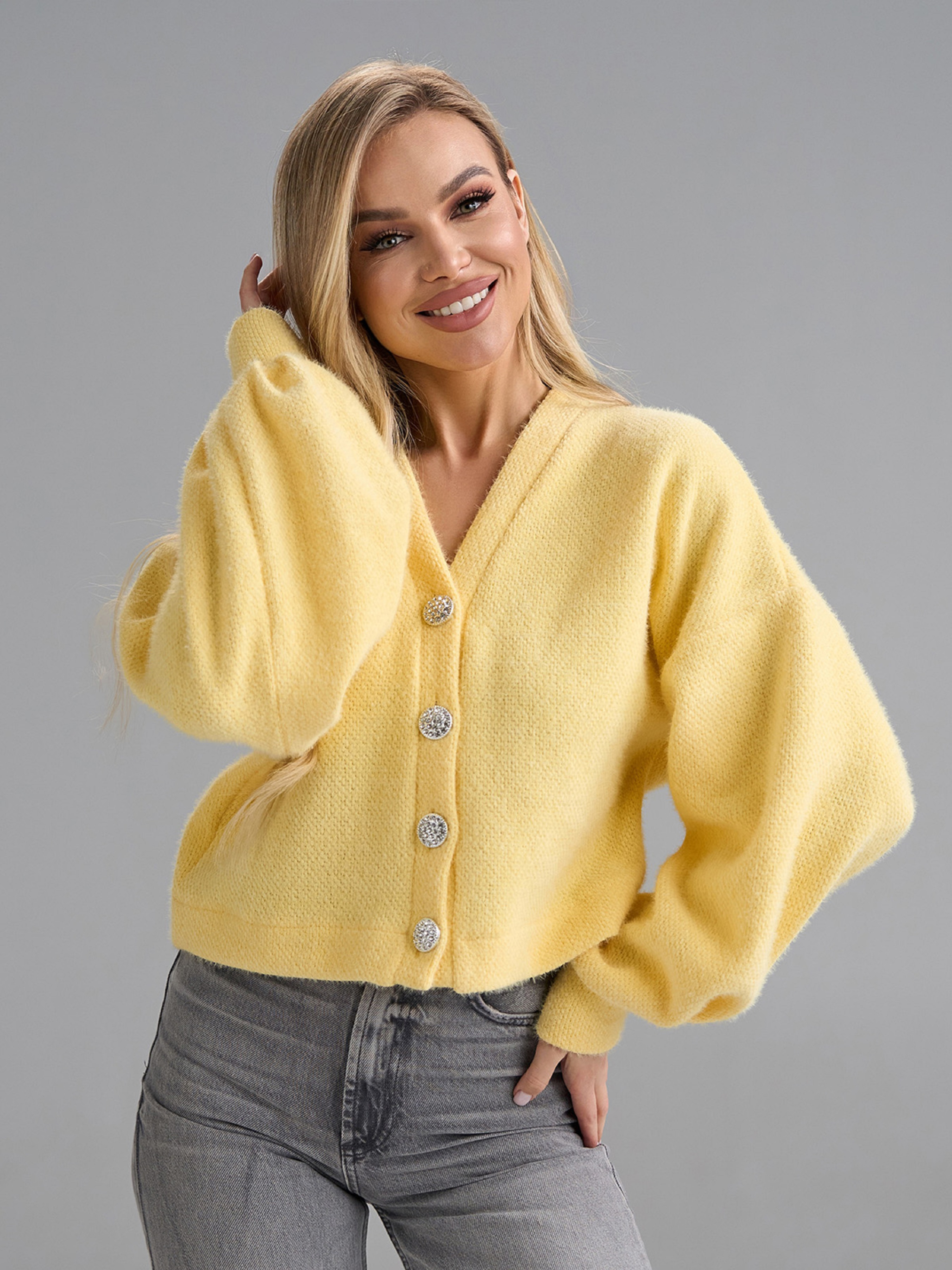 Молодежный кардиган из альпаки (эко) яркого желтого цвета. Кардиган на пуговицах с V-образной горловиной и длинными рукавами на манжетах. Модель укороченного свободного кроя. Полуобхват: Грудь: S (55), M (57), L (59), XL (61), Длина изделия - 48, Рукав - 57, Ткань: Низкой эластичности.