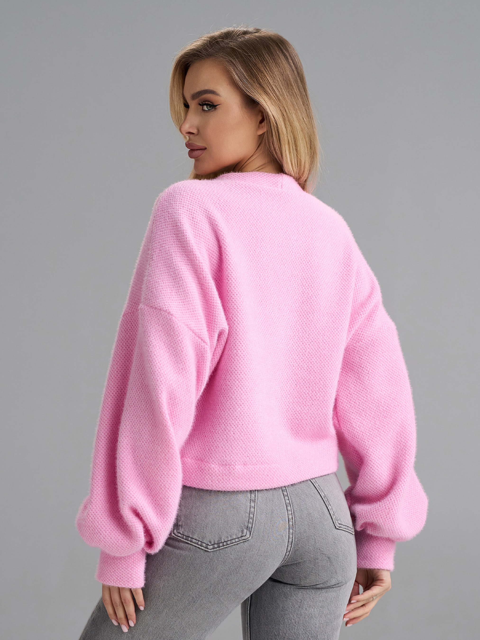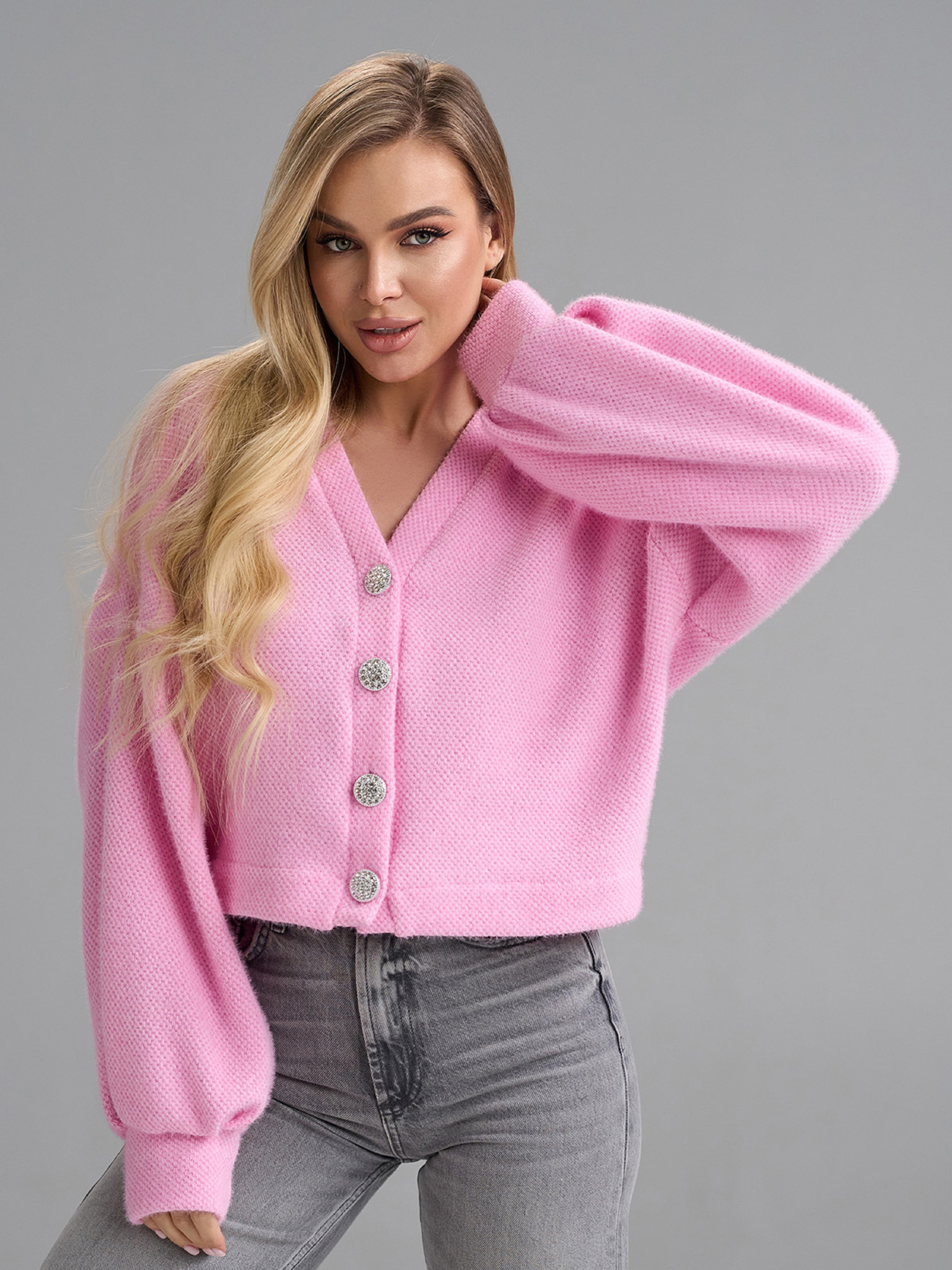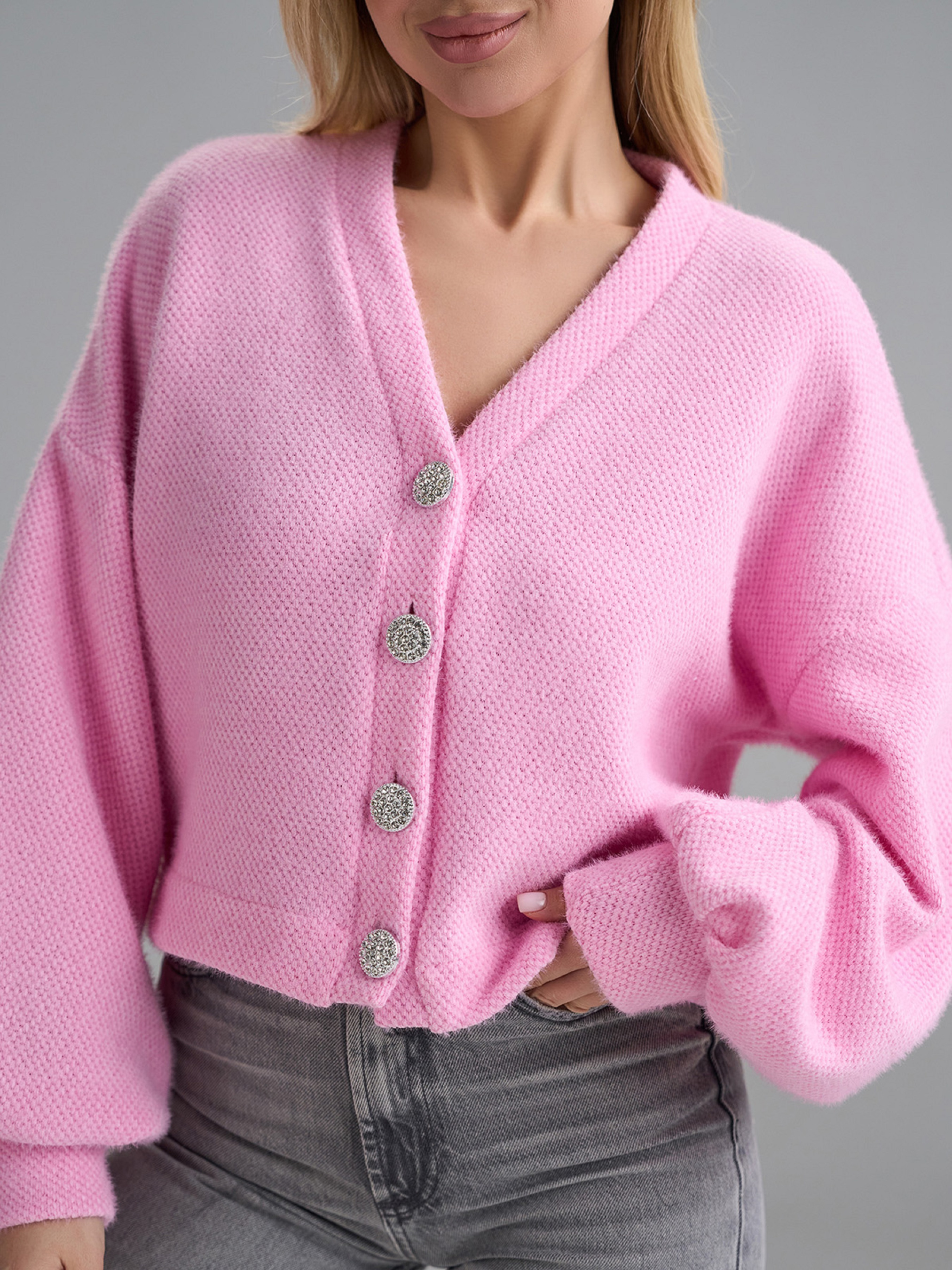 Рожевий оверсайз кардиган укороченого крою, виконаний з альпаки (еко). Кардиган на ґудзиках з V-подібною горловиною та довгими рукавами-ліхтариками на манжетах. Напівобхват: Грудь: S (55), M (57), L (59), XL (61), Довжина виробу - 48, Рукав - 57, Тканина: Низької еластичності.