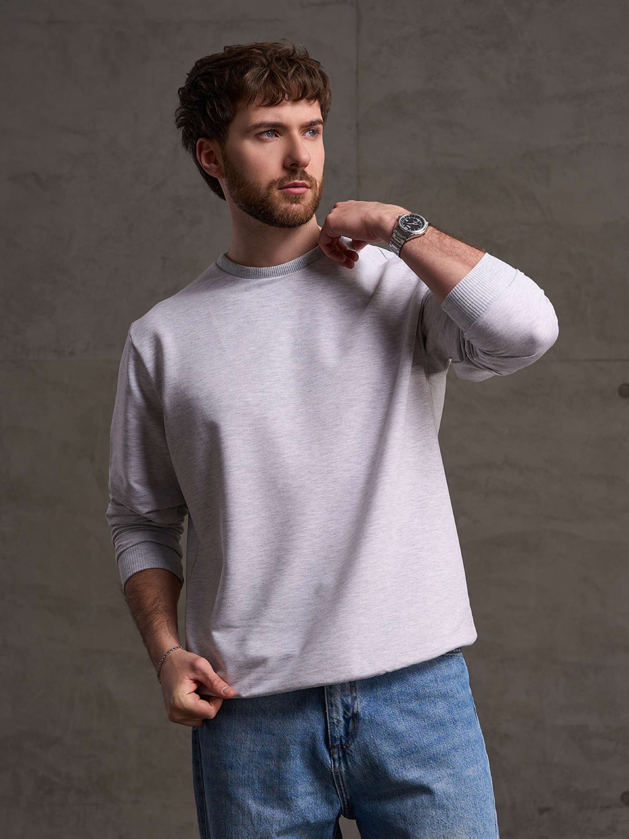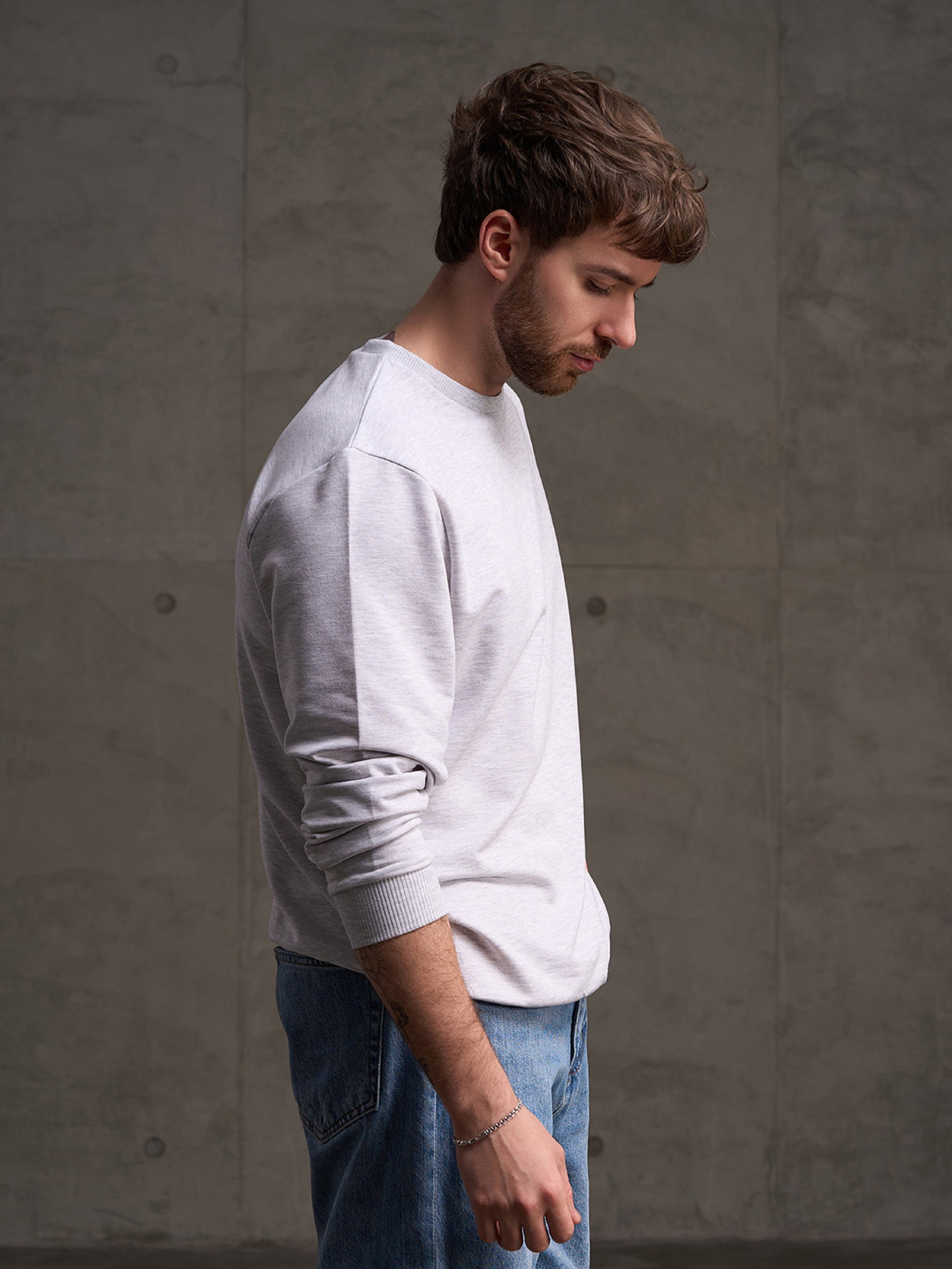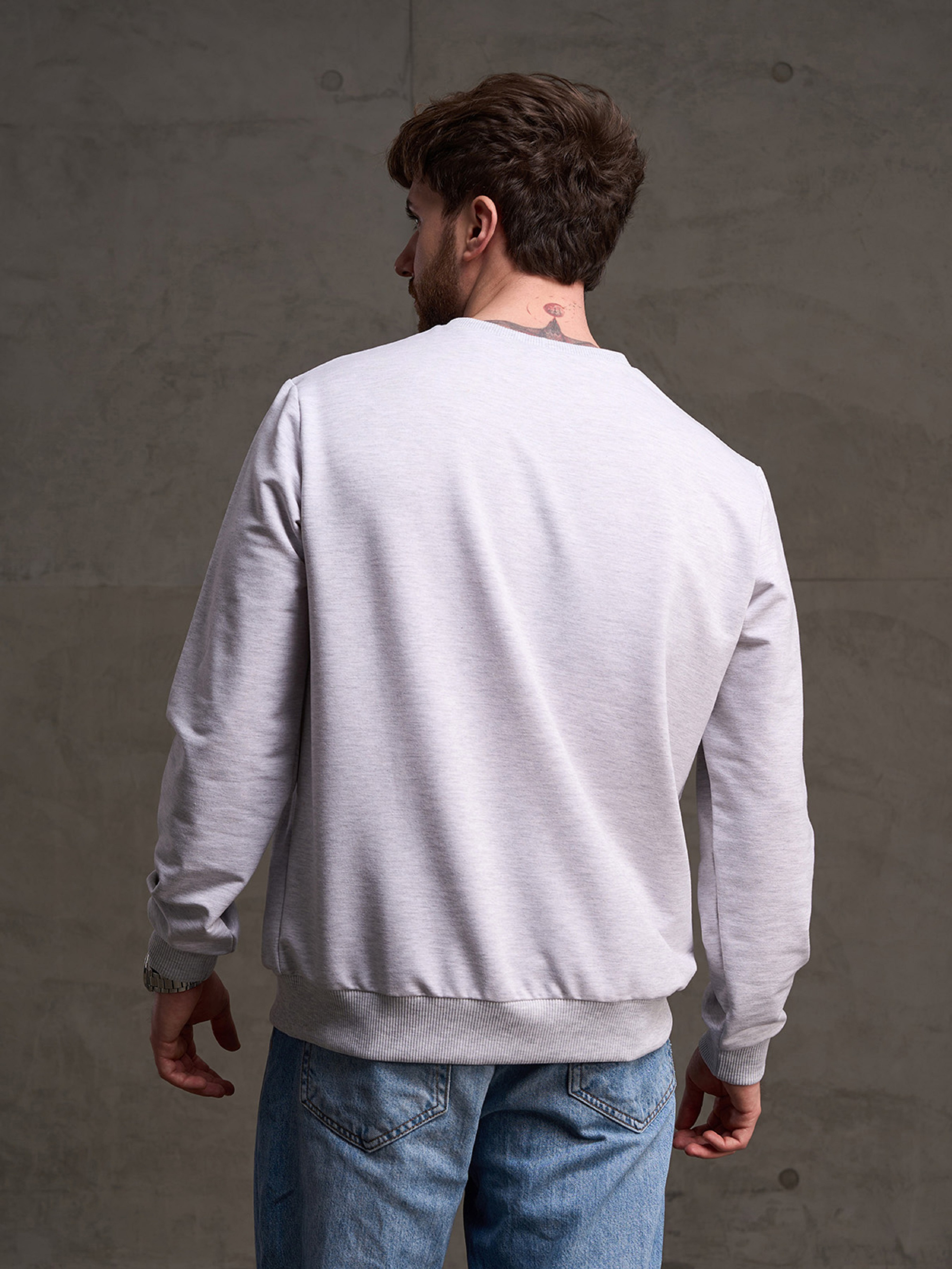 Светло-серый демисезонный свитшот, выполненный из однотонного двухнитного трикотажа пенье с фактурными манжетами. Модель с длинными рукавами, свободным кроем и О-образной горловиной. Полуобхват: Грудь: S (56), M (58), L (60), XL (62), XXL (64), 3XL (66), Длина изделия - 72, Рукав - 65, Ткань: Низкой эластичности