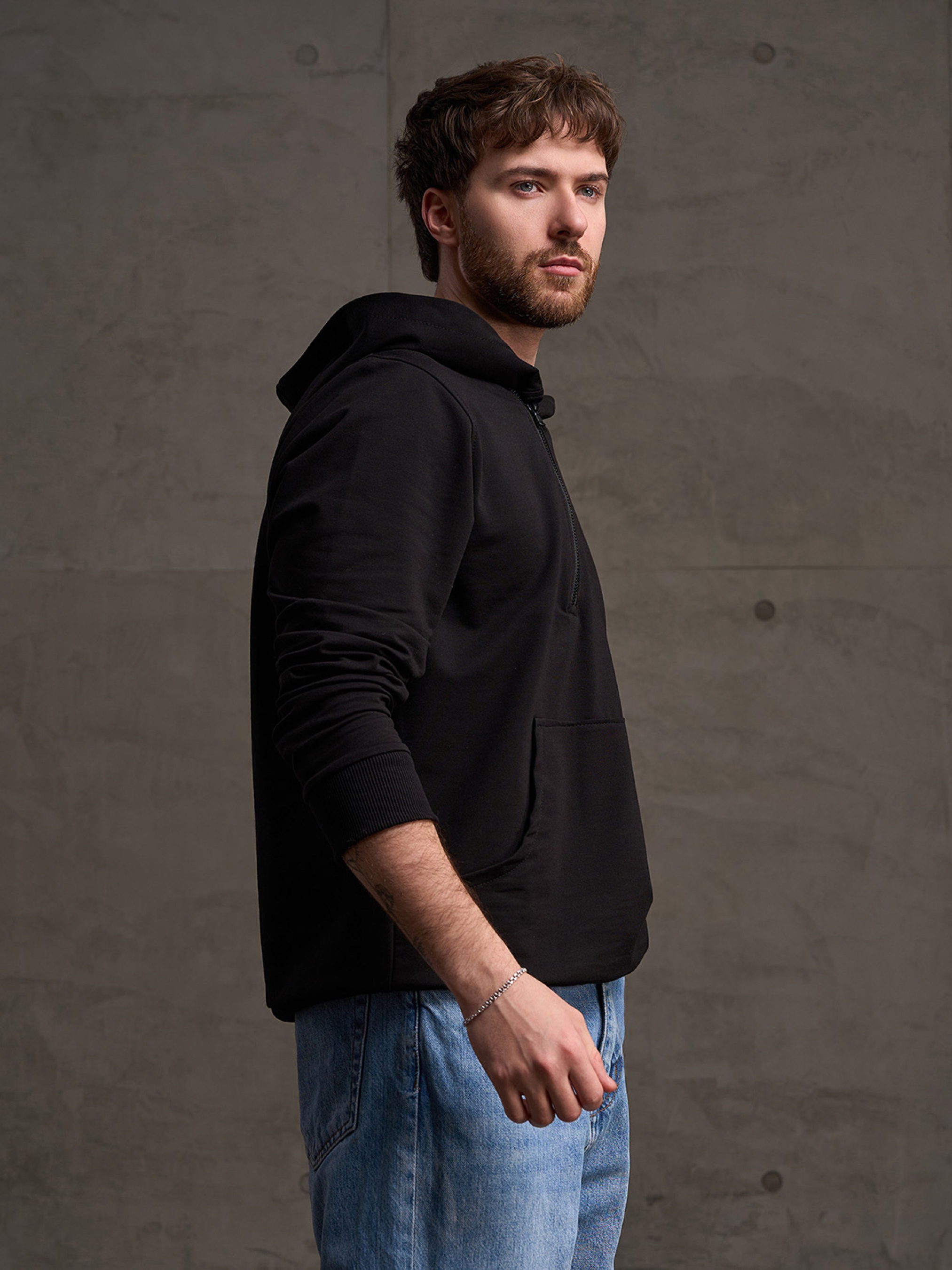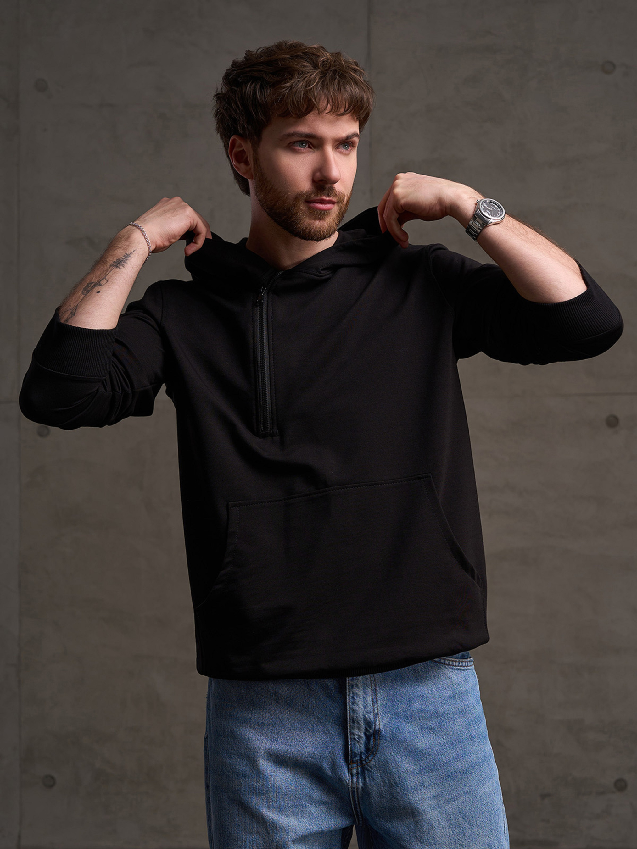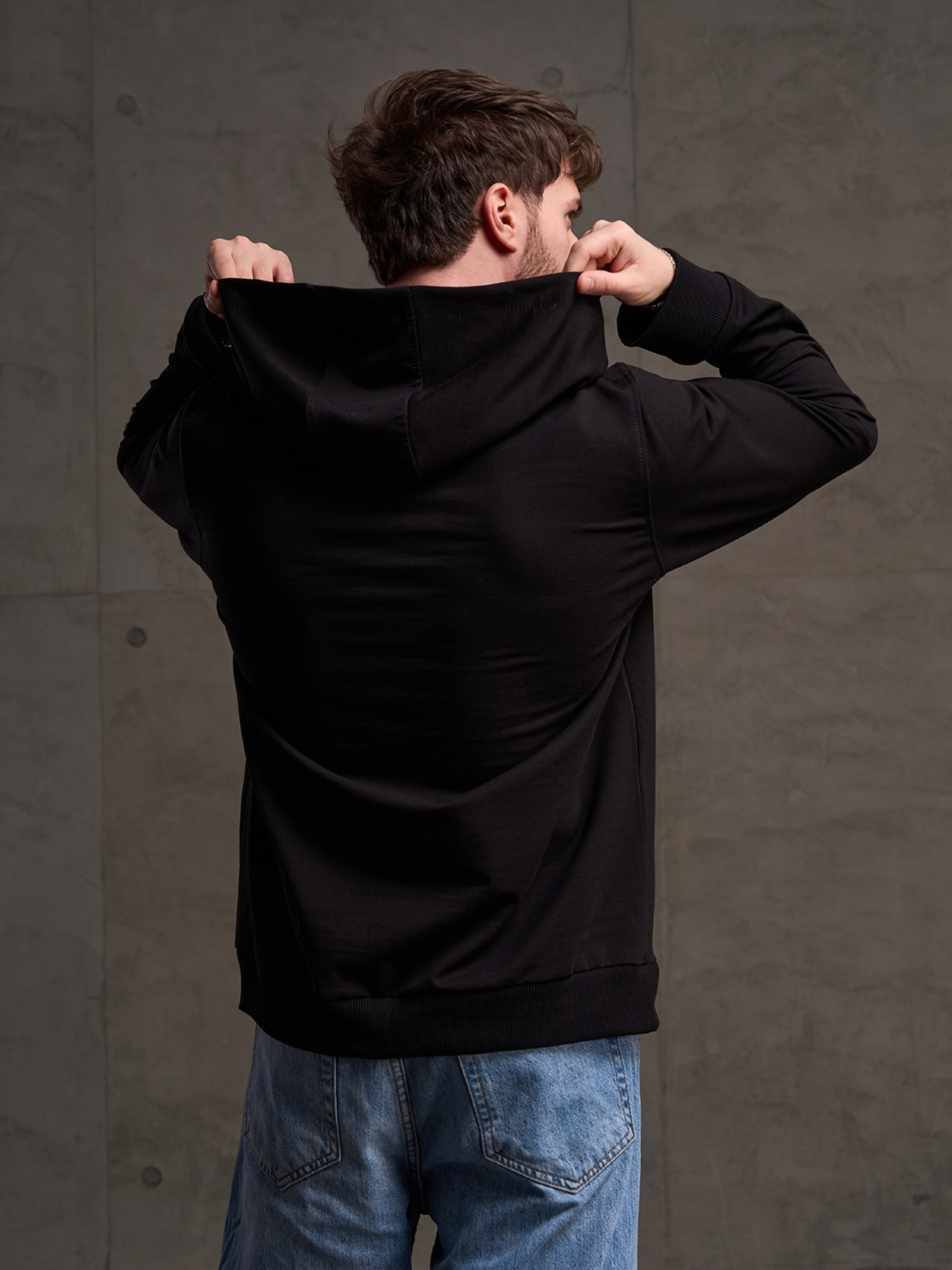 Черное худи на манжетах с длинными рукавами и передним карманом. Модель с капюшоном и боковой укороченной молнией выполнена из трикотажной двухнити пенье. Полуобхват: Грудь: S (55), M (57), L (59), XL (61), XXL (63), 3XL (65), Длина изделия - 68, Рукав - 64, Ткань: Низкой эластичности