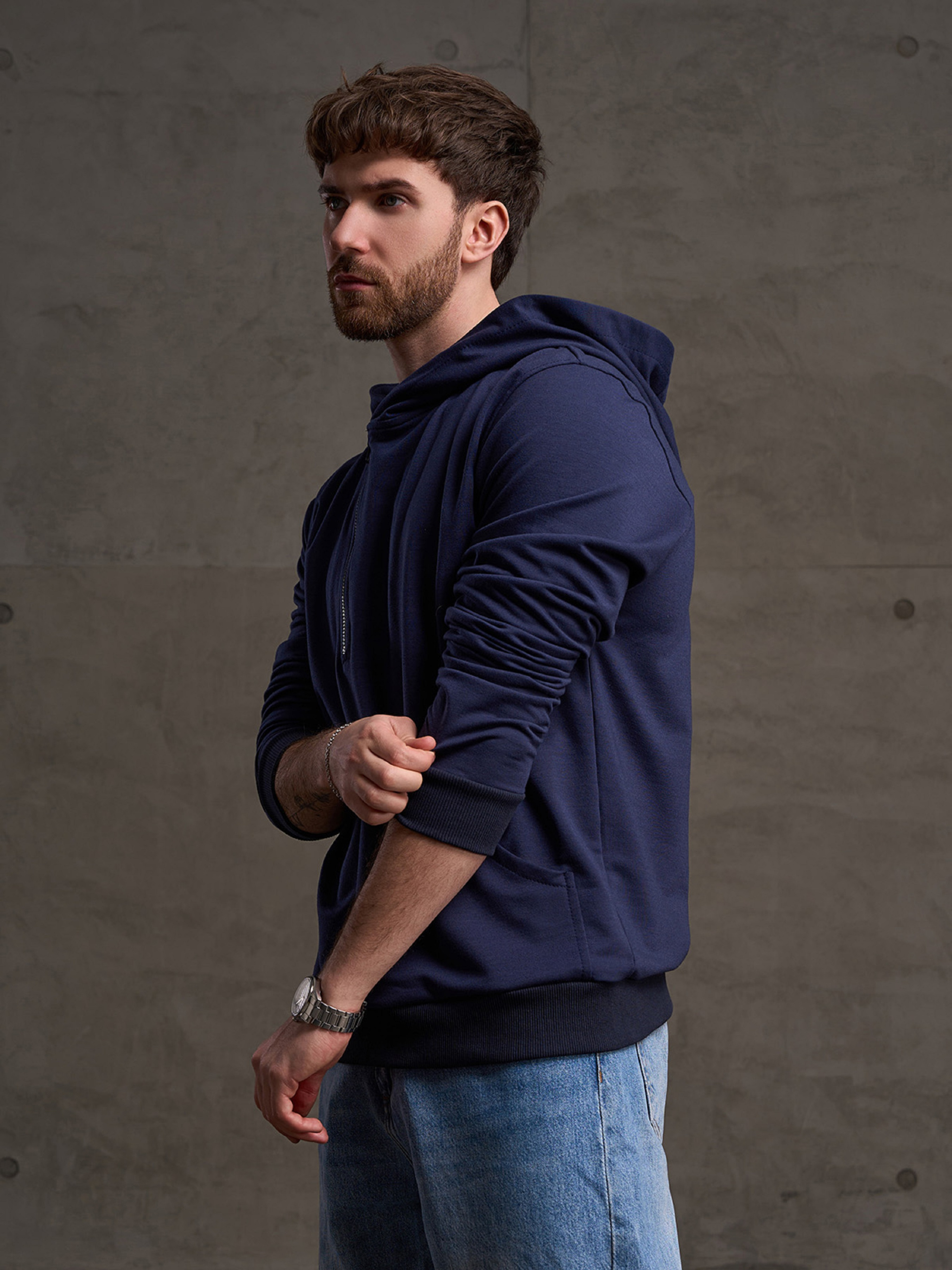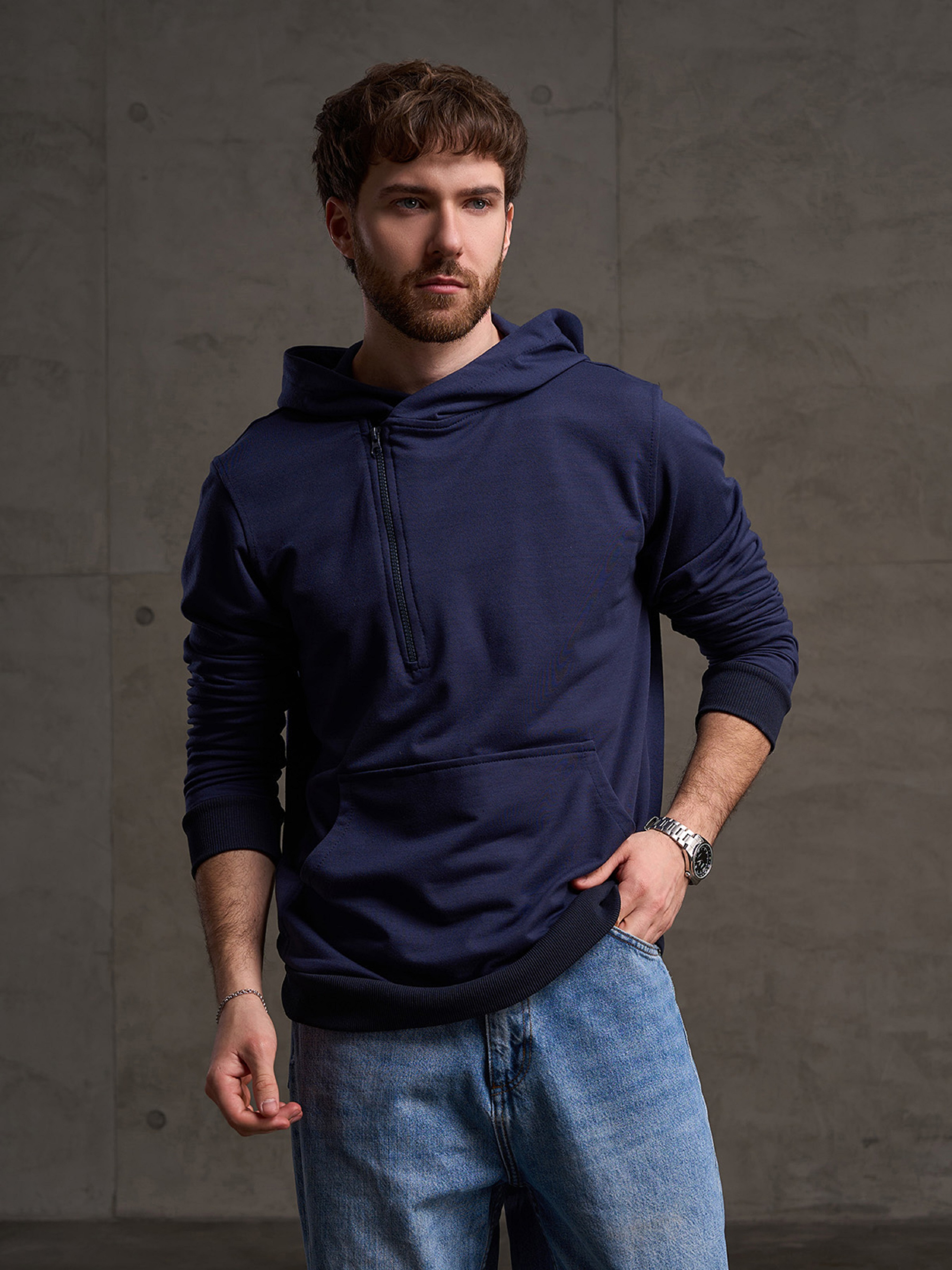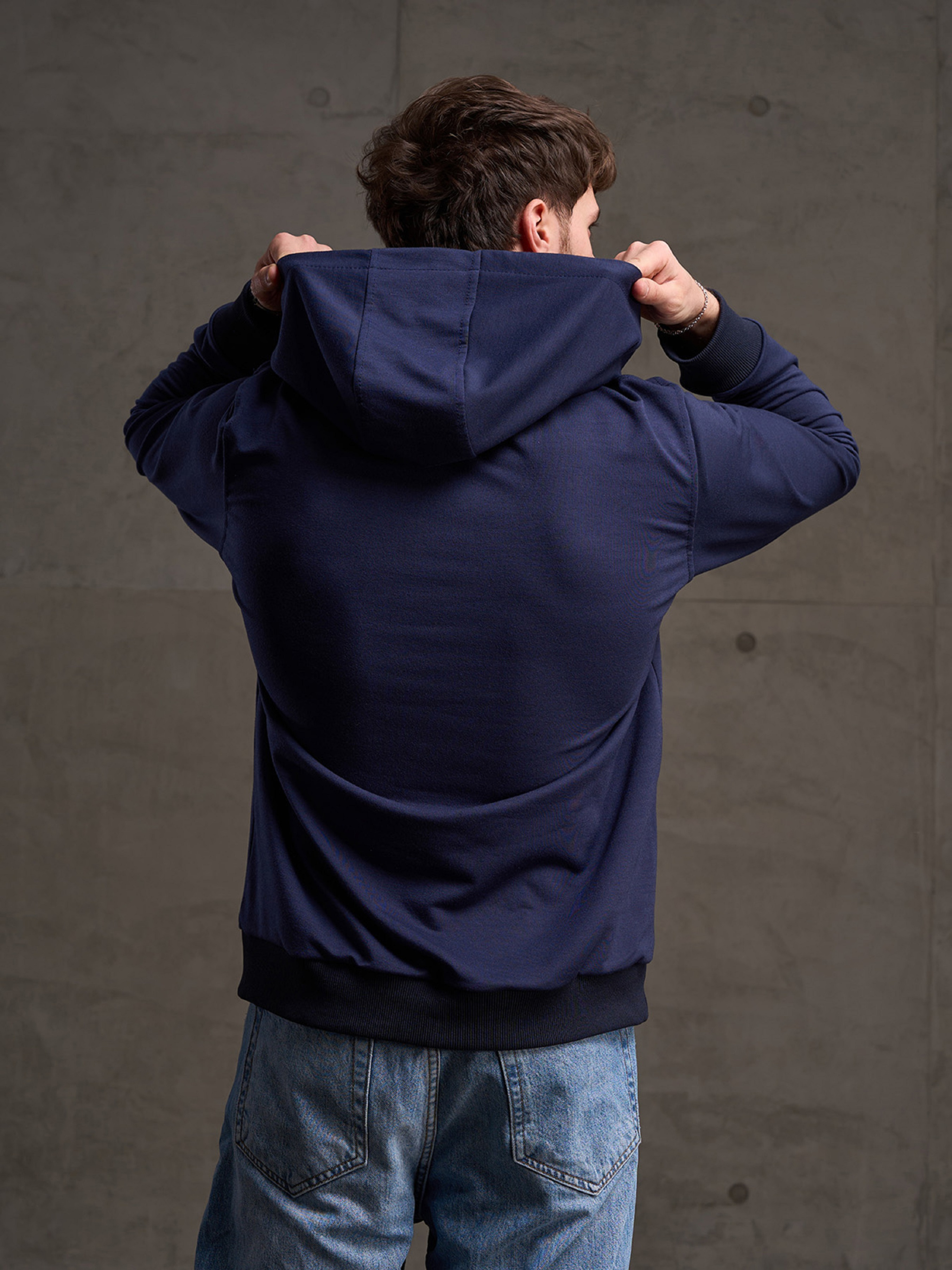 Темно-синее спортивное худи из однотонной двухнити с манжетами и свободным кроем. Худи с длинными рукавами, капюшоном и передним карманом-кенгуру. Худи декорировано укороченной боковой молнией. Полуобхват: Грудь: S (55), M (57), L (59), XL (61), XXL (63), 3XL (66), Длина изделия - 68, Рукав - 64, Ткань: Низкой эластичности