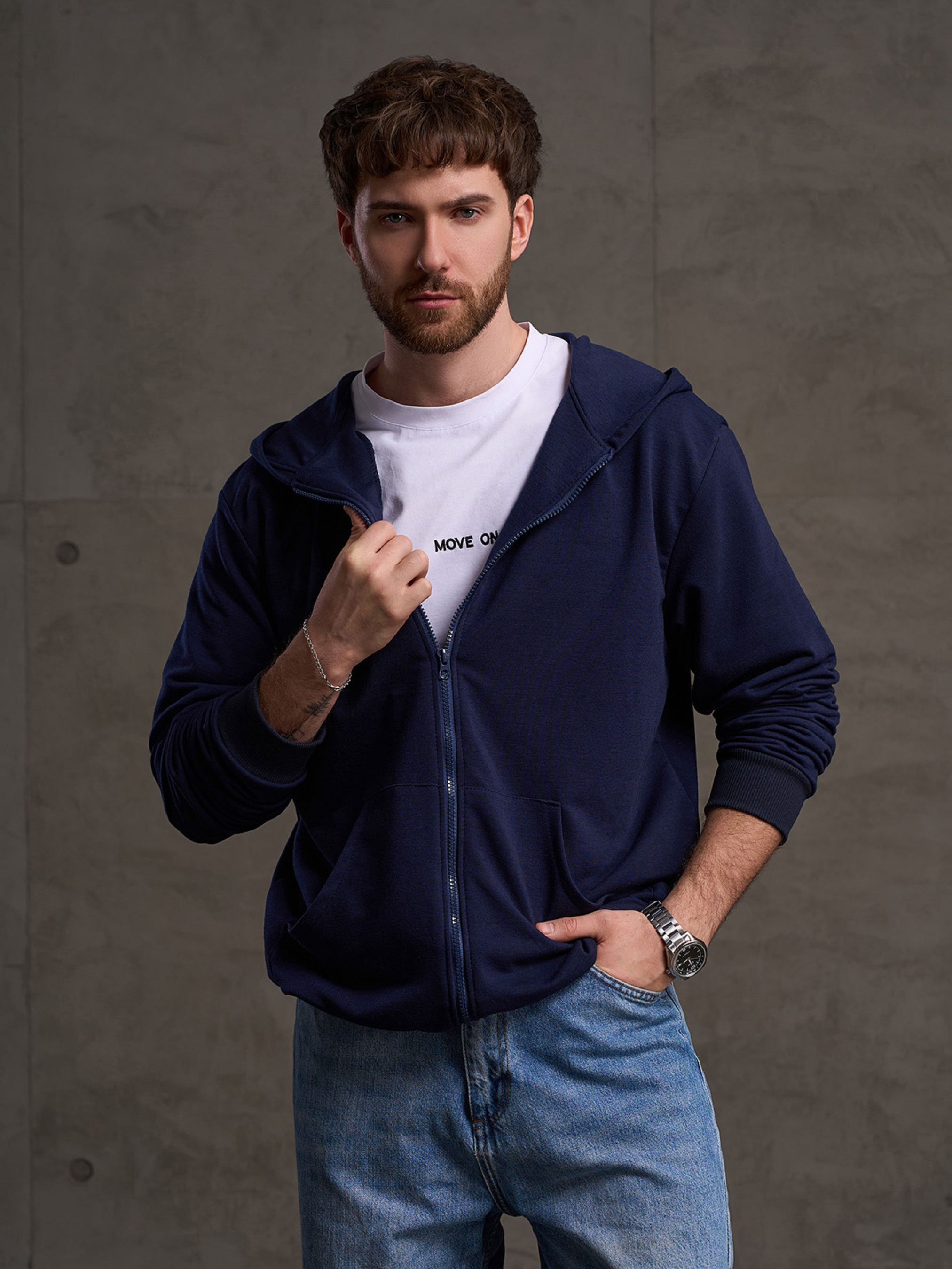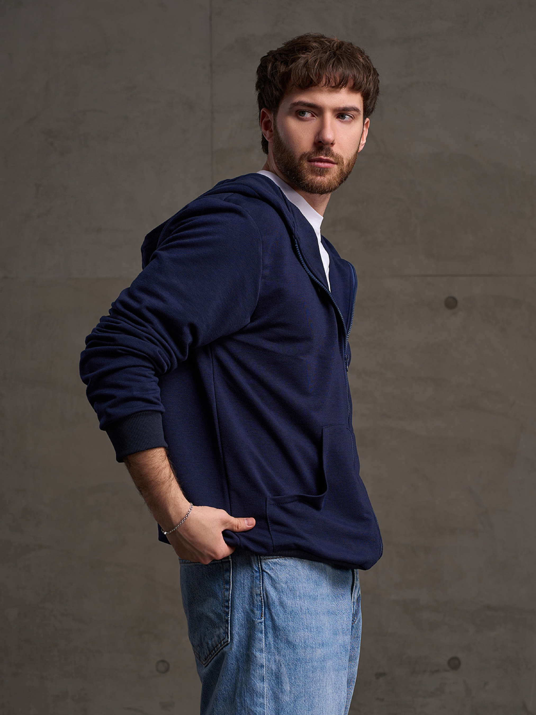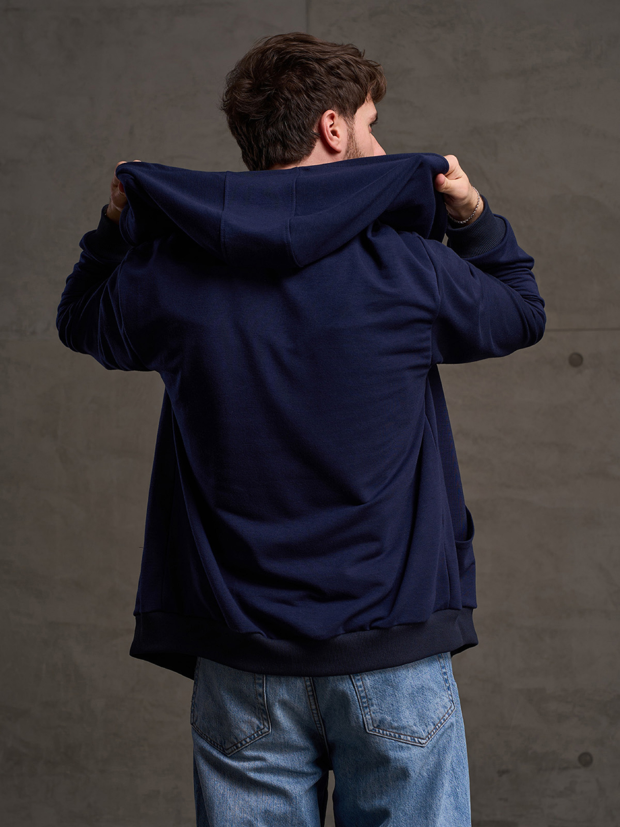 Темно-синее демисезонное трикотажное худи на молнии с фактурными манжетами. Модель прямого свободного кроя с длинными рукавами, передними карманами и капюшоном. Полуобхват: Грудь: S (53), M (55), L (57), XL (59), XXL (61), 3XL (63), Длина изделия - 71, Рукав - 67, Ткань: Низкой эластичности