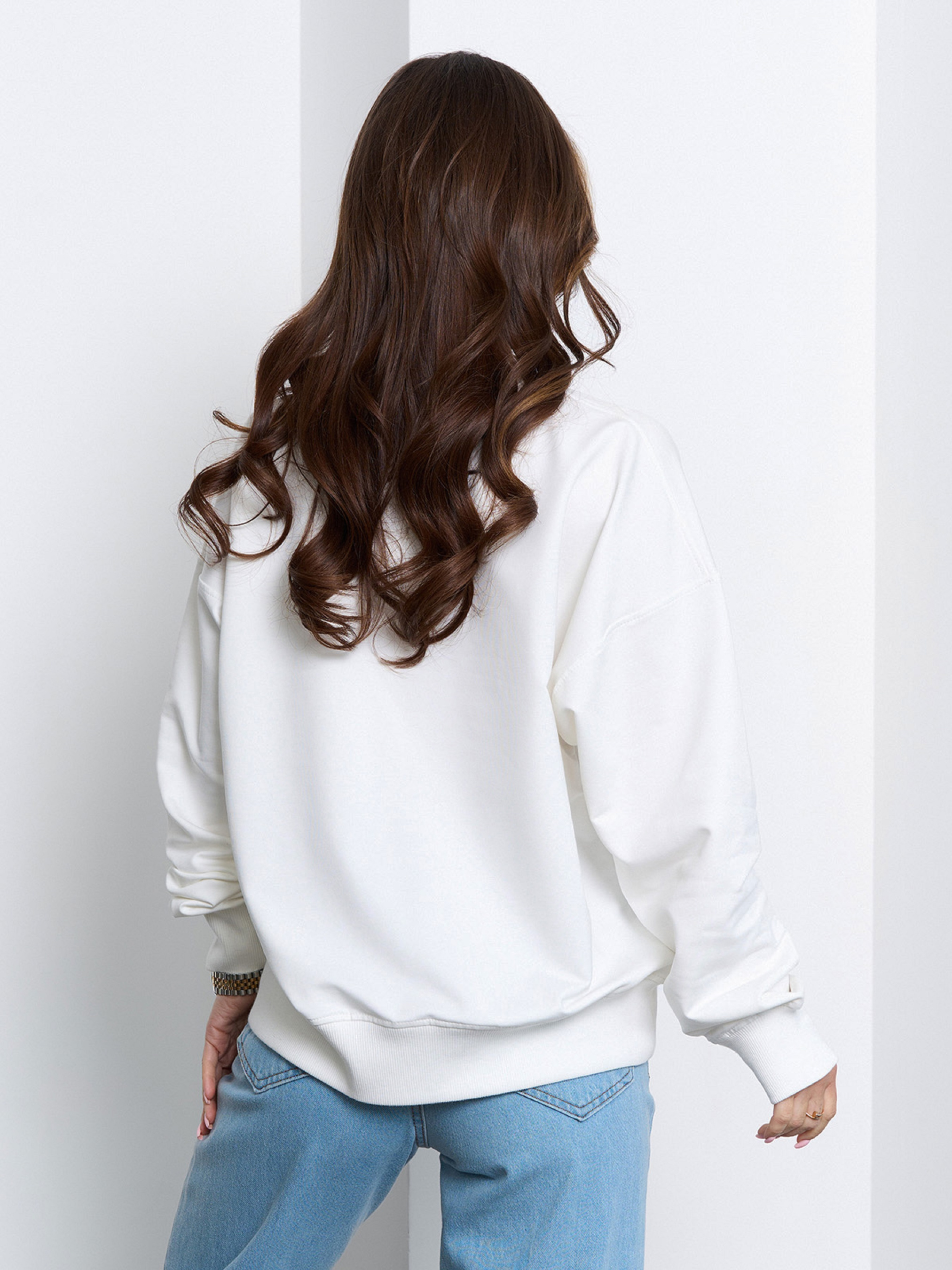 Молочно-белая оверсайз толстовка-свитшот с фактурными манжетами, выполненная из двухнитного трикотажа пенье. Толстовка свободного кроя с длинными рукавами и полукруглой горловиной. Полуобхват: Грудь: S (59), M (61), L (63), XL (65), Длина изделия - 64, Рукав - 58, Ткань: Низкой эластичности