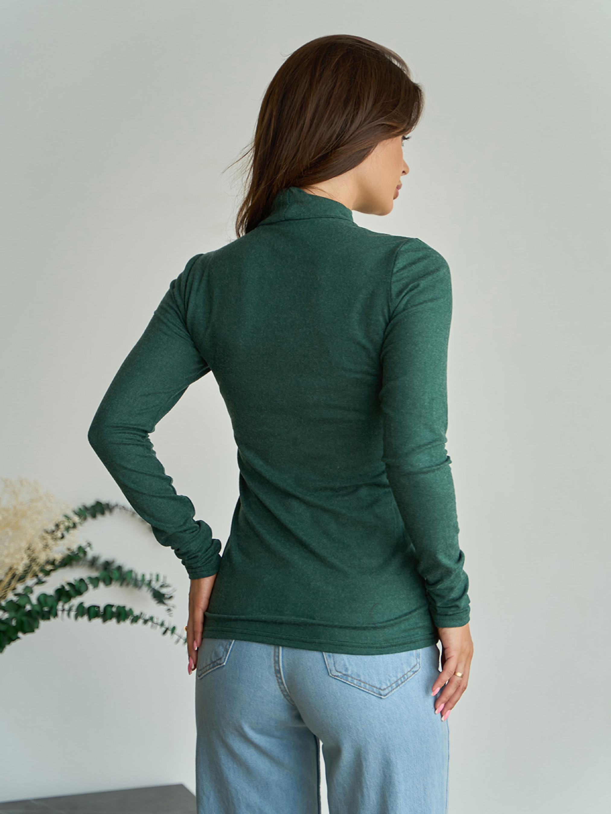 Эластичный повседневный гольф с воротником-стойкой, выполненный из меланжевой зеленой ангоры. Модель прямого облегающего кроя с длинными рукавами. Гольф обладает высокой растяжимостью. Полуобхват: Грудь: S (39-45), M (41-47), L (43-49), XL (45-51), Длина изделия - 60, Рукав - 57, Ткань: Высокой эластичности.