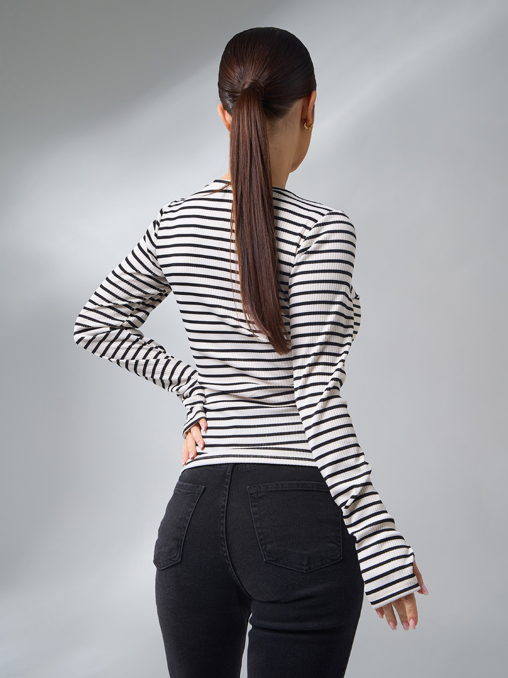 Бело-черный облегающий лонгслив из трикотажного рубчика в полоску. Модель прямого кроя с длинными рукавами и полукруглой горловиной. Лонг декорирован вырезами для больших пальцев. Полуобхват: Грудь: S (36), M (38), L (39), XL (42), Длина изделия - 55, Рукав - 64, Ткань: Высокой эластичности.