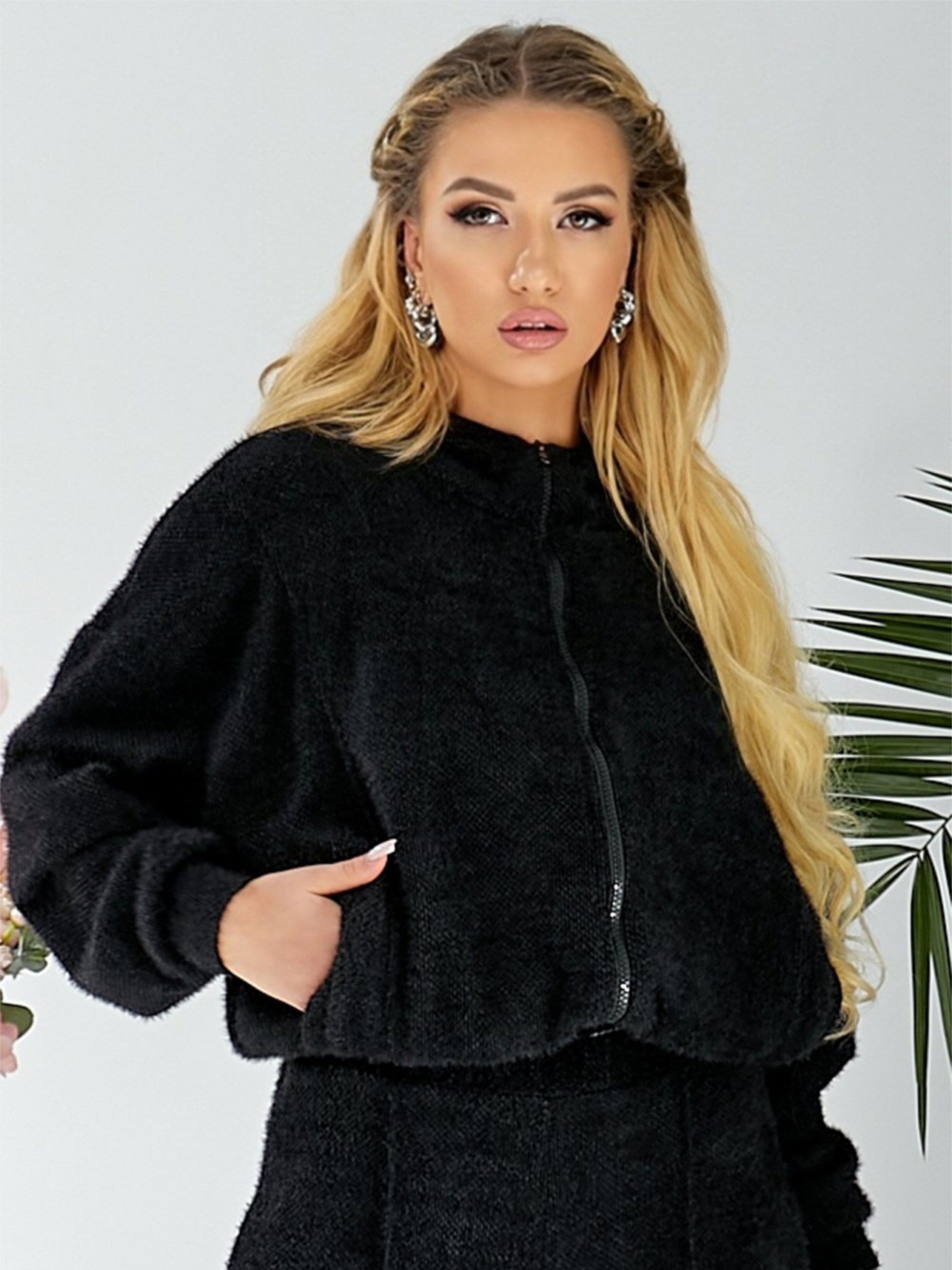 Жіноча тепла кофта із ангори на блискавці — це універсальний елемент гардероба, який поєднує в собі практичність спортивного стилю та ніжність преміального трикотажу. Глибокий чорний колір робить модель візуально стрункішою та дозволяє легко комбінувати її з будь-яким низом. Завдяки вільному крою оверсайз, кофта не сковує рухів, даруючи відчуття абсолютної свободи та затишку. Це ідеальний вибір для багатошарових образів у холодну пору року, прогулянок на свіжому повітрі або активного відпочинку. Матеріал: Утеплений трикотаж ангора (Luxury Soft) Натуральний комфорт (60% бавовна): Високий вміст бавовни забезпечує чудову терморегуляцію та дозволяє шкірі «дихати», що особливо важливо для утеплених речей. Шовковистість віскози (37%): Додавання віскози надає тканині характерну м'якість ангори, роблячи виріб надзвичайно приємним до тіла та стійким до ковтунців. Ідеальна еластичність (3% еластан): Матеріал добре тягнеться, зберігаючи форму виробу навіть після тривалого носіння та частих прань. Функціональні деталі: Надійна блискавка спереду, глибокий капюшон для захисту від вітру та зручні бокові кишені роблять кофту максимально практичною. Виробництво Україна: Професійне пошиття, якісна обробка швів та надійна фурнітура. Характеристики Колір: Чорний (Classic Black) Матеріал: Трикотаж ангора (утеплений) Склад: 60% Бавовна, 37% Віскоза, 3% Еластан Довжина: 60 см Фасон: Прямий, оверсайз (широкий крій) Особливості: Капюшон, бокові кишені, манжети на рукавах Застібка: Блискавка спереду Еластичність: Добре тягнеться Країна виробник: Україна З чим поєднувати чорну кофту оверсайз? Чорний колір та фактура ангори дозволяють створювати безліч стильних комбінацій: Street Style: Поєднуйте з синіми джинсами Corona Skinny та масивними черевиками. Total Black Look: Одягайте разом із чорною шкіряною міді спідницею — контраст пухнастої ангори та гладкої екошкіри виглядає дуже ефектно. Sport Chic: Створіть комфортний комплект із трикотажними джогерами та нашим білим трикотажним боді як нижнім шаром. Затишний мікс: Комбінуйте з спідницею міді в складку для створення сучасного еклектичного образу. Рекомендації з догляду Прання: Тільки делікатний режим при температурі не вище 30°C. Використовуйте спеціальні мішки для прання трикотажу. Засоби: Рекомендовано рідкі гелі для темних делікатних тканин. Не використовуйте відбілювачі. Сушіння: Сушити тільки в розправленому вигляді на горизонтальній поверхні. Не вішайте на плічки у вологому стані, щоб уникнути витягування тканини. Прасування: Використовуйте вертикальний відпарювач. Прасування праскою можливе лише з виворітного боку на мінімальній температурі.