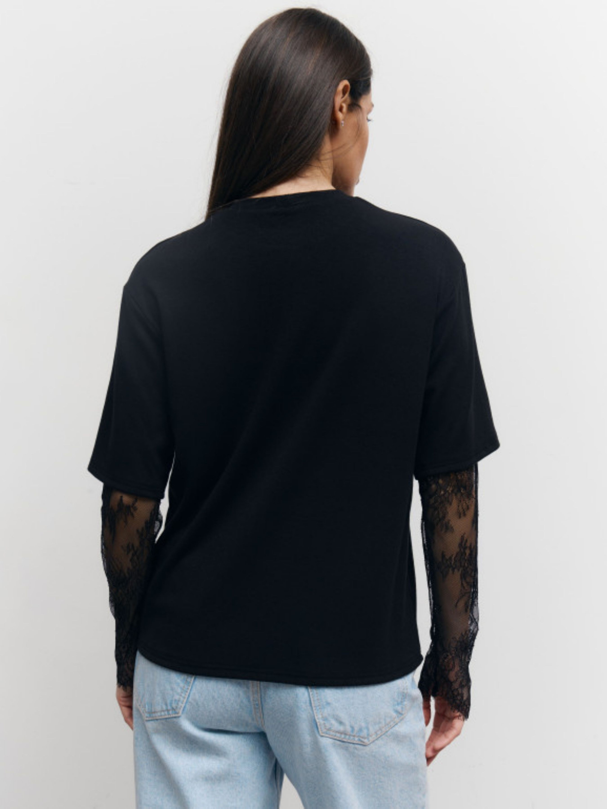 Базовая вещь с деликатным акцентом, делающим образ особенным. Лаконичный силуэт футболки сочетается с нежными гипюровыми рукавами, создавая баланс между минимализмом и женственностью. Мягкий трикотаж приятен к телу и красиво держит форму, а прозрачный гипюр придает образу легкости и утонченности. Благодаря свободному крою, модель легко сочетается с джинсами, юбками или классическими брюками, создавая стильные ежедневные образы. Это та самая вещь, которая выглядит просто – но запоминается деталями.