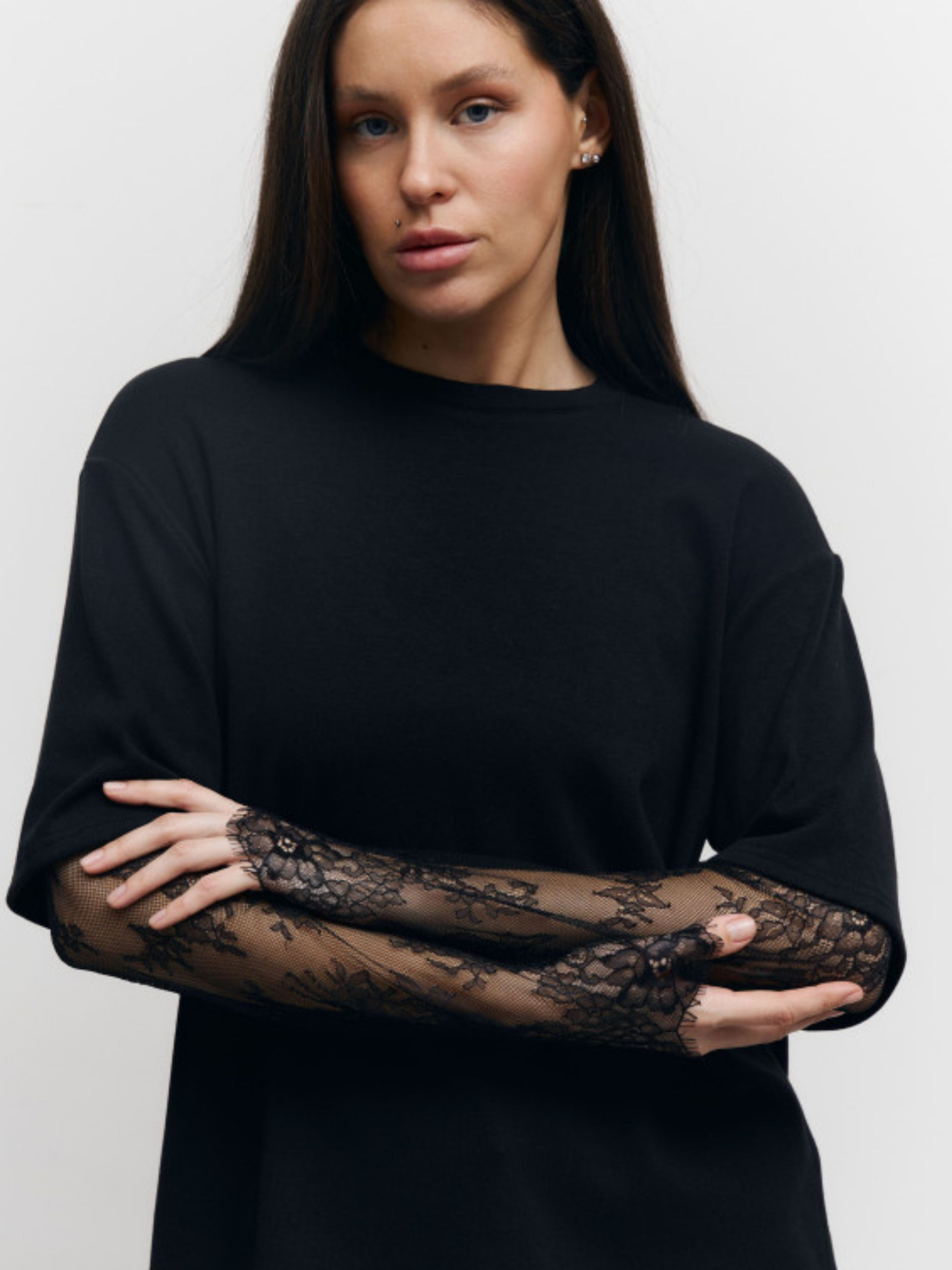 Черный лонг с гипюровыми рукавами Lace Touch модель 414