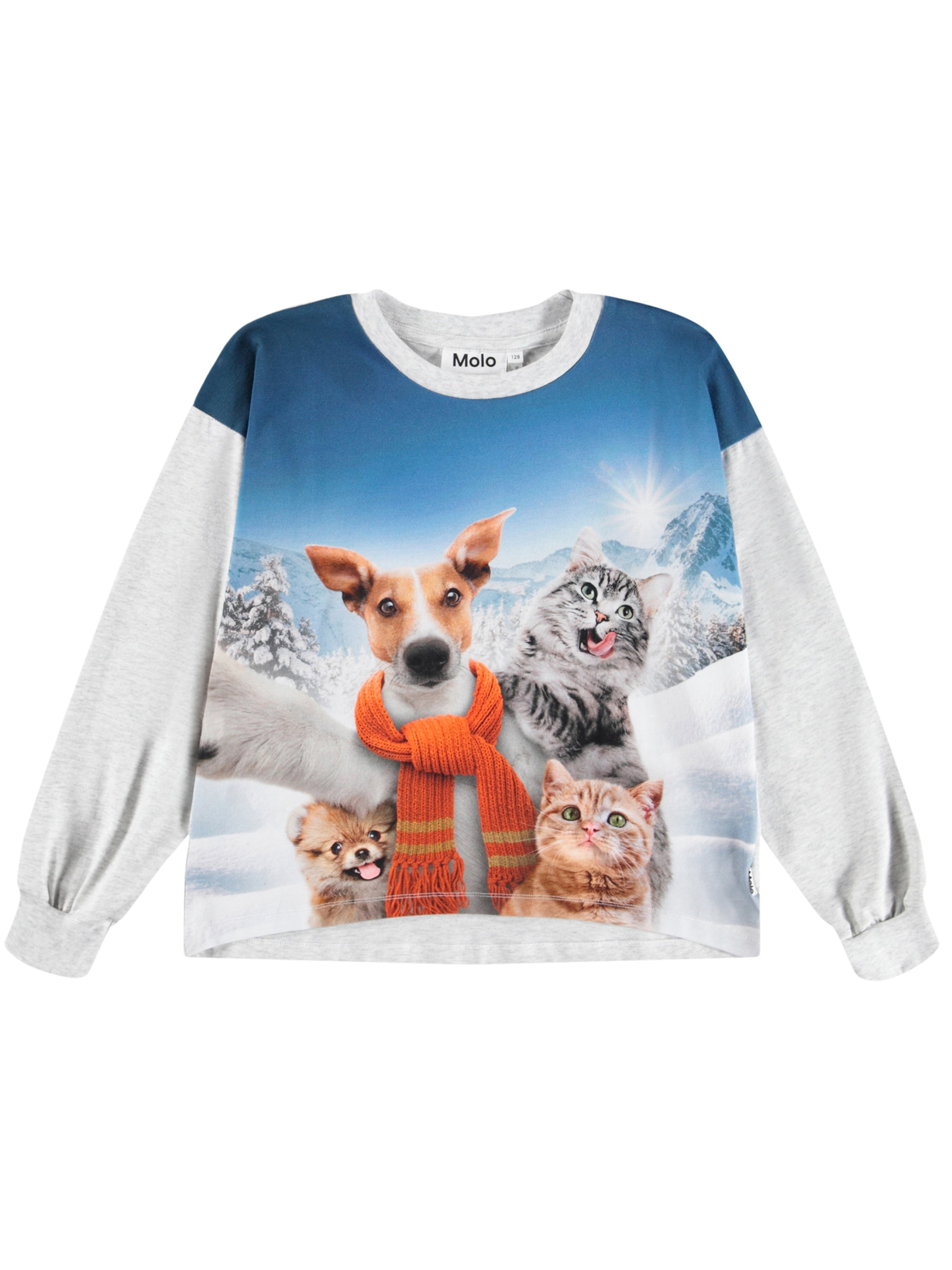 Реглан Molo "Reniza Selfie" для девочки.Особенности: материал – organic cotton*; Сертифицировано GOTS** – изготовлено из сертифицированных органических материалов; декорирован принтом с изображением котиков и песиков на фоне заснеженных гор; круглый вырез горловины; сзади слегка удлинён; на рукавах эластичные манжеты. *Organic cotton (органический хлопок) – хлопок, выращенный без использования вредных химических веществ и негативного воздействия на природные ресурсы планеты. **Сертификация GOTS гарантирует, что продукт не содержит опасных химикатов (сертификат GOTS Ecocert Greenlife, №197496). Изделие производится в соответствии с самыми строгими социальными и экологическими стандартами на п