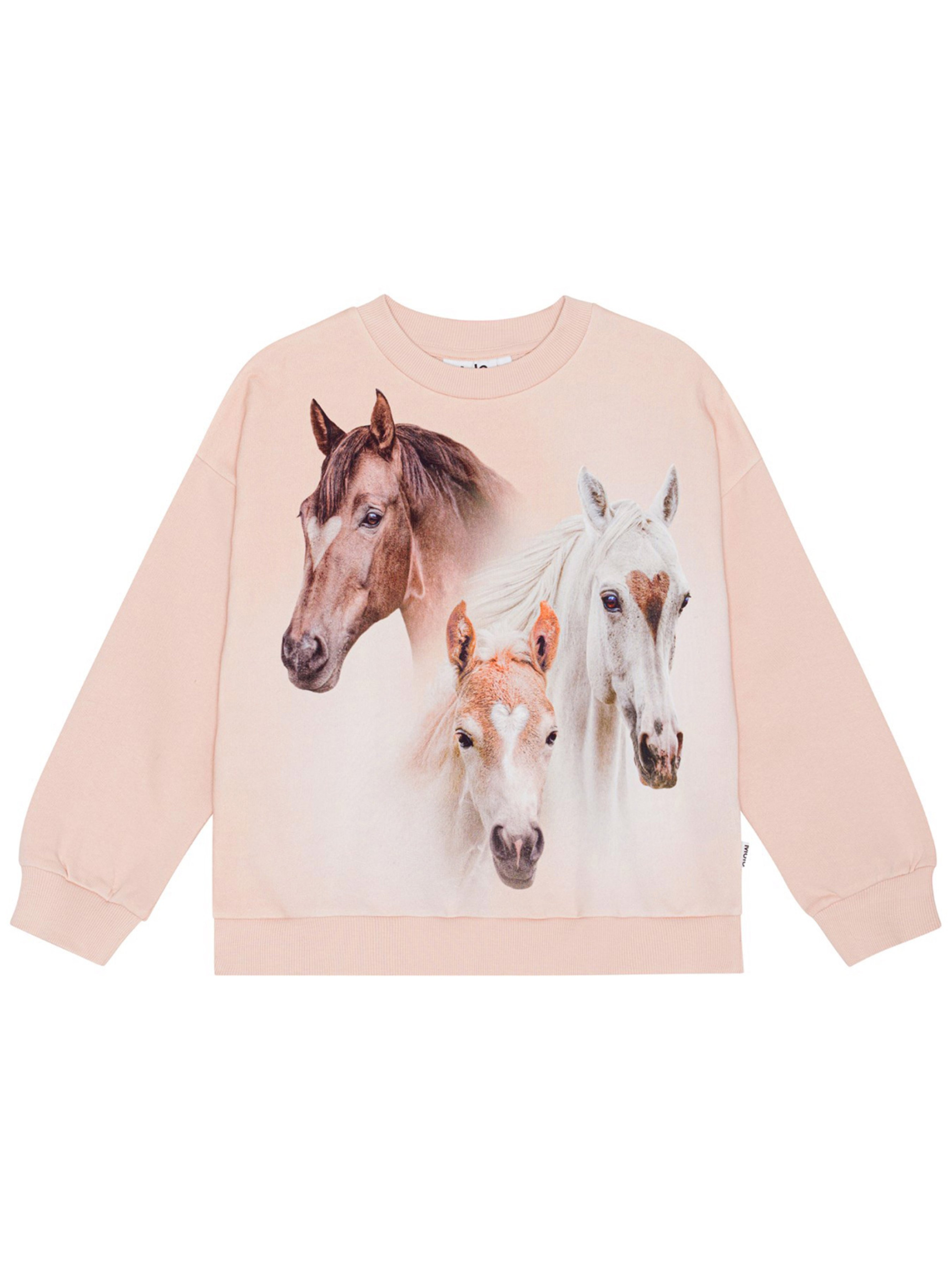 Свитшот Molo "Maxi Three Friends" для девочки. Особенности: материал – 100% organic cotton*; сертифицировано GOTS** – изготовлено из сертифицированных органических материалов; декорировано принтом с тремя лошадьми с отметкой в виде сердца на лбу; круглый вырез горловины с укрепляющей тесьмой; на рукавах и по низу эластичные манжеты. *Organic cotton (органический хлопок) – хлопок, выращиваемый без использования вредных химикатов и губительного воздействия на природные ресурсы планеты. **Сертификация GOTS гарантирует, что продукт не содержит опасных химикатов (сертификат GOTS Ecocert Greenlife, №197496). Продукция производится в соответствии с самыми строгими социальными и экологическими станда