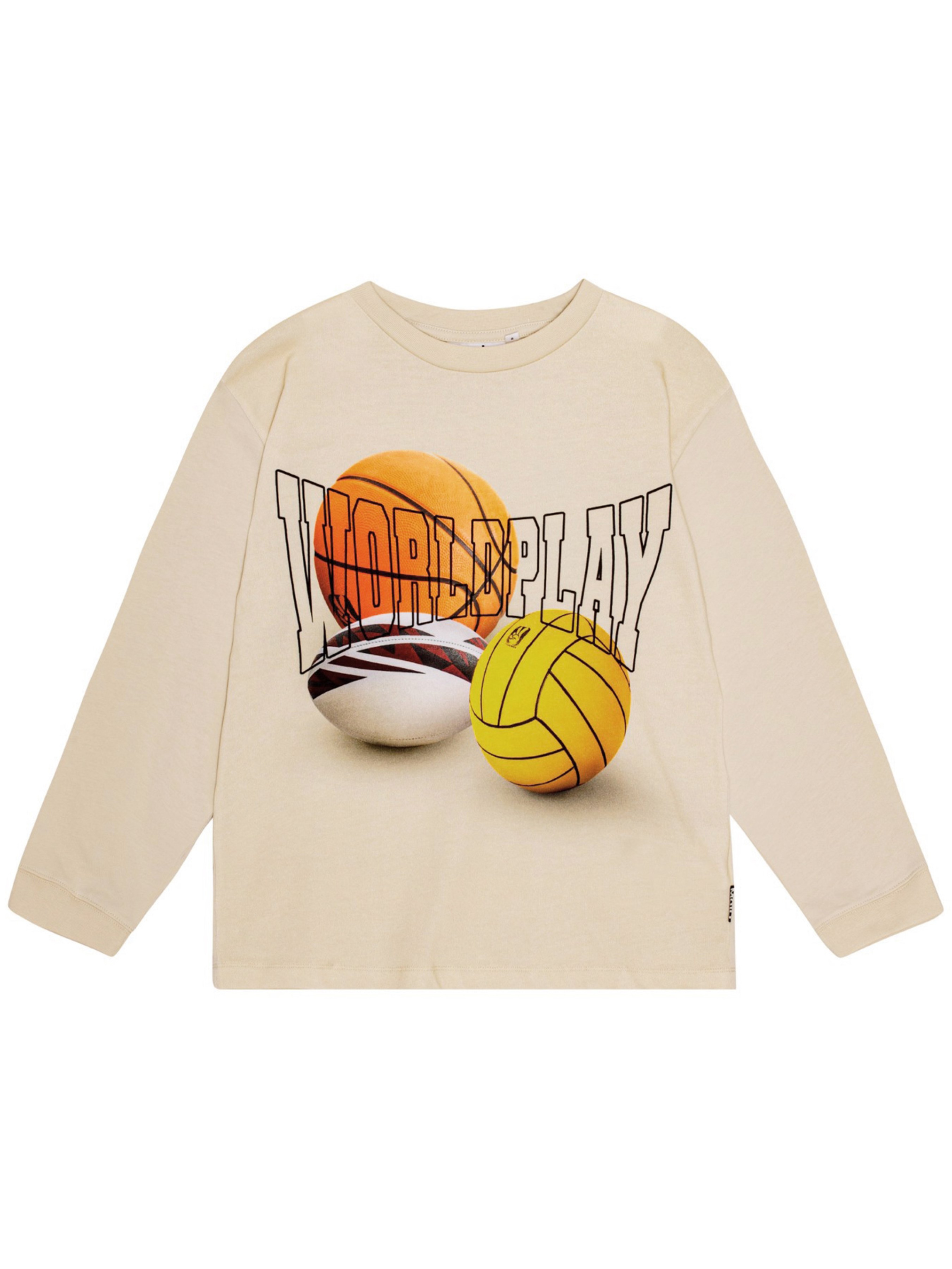 Реглан Molo "Rube Three Balls". Особенности: материал – 100% organic cotton*; сертифицировано GOTS** – изготовлено из сертифицированных органических материалов; декорировано принтом с мячами и надписью "World Play"***; круглый вырез горловины с укрепляющей тесьмой; на рукавах эластичные манжеты. *Organic cotton (органический хлопок) – хлопок, выращиваемый без использования вредных химикатов и губительного воздействия на природные ресурсы планеты. **Сертификация GOTS гарантирует, что продукт не содержит опасных химикатов (сертификат GOTS Ecocert Greenlife, №197496).