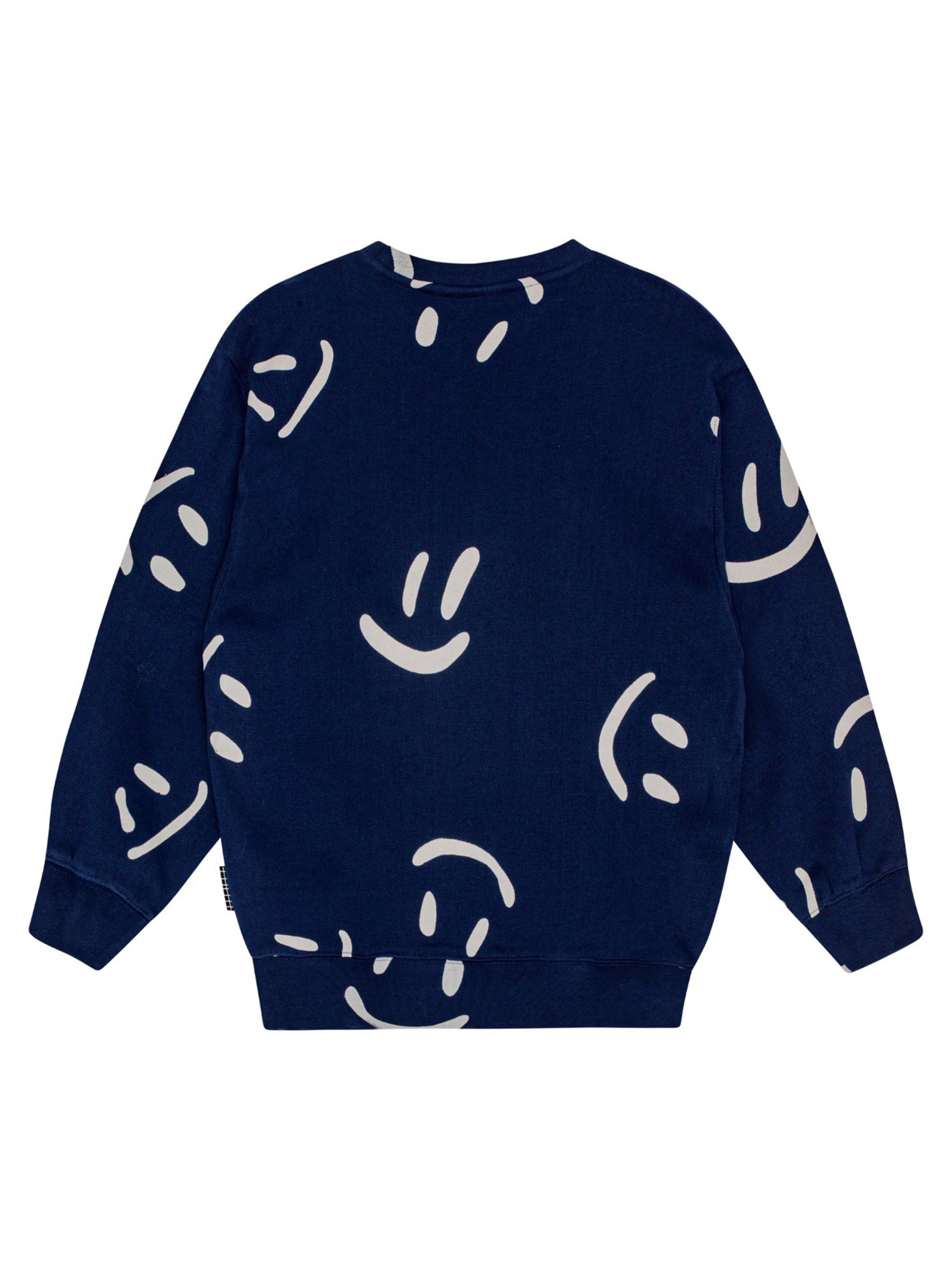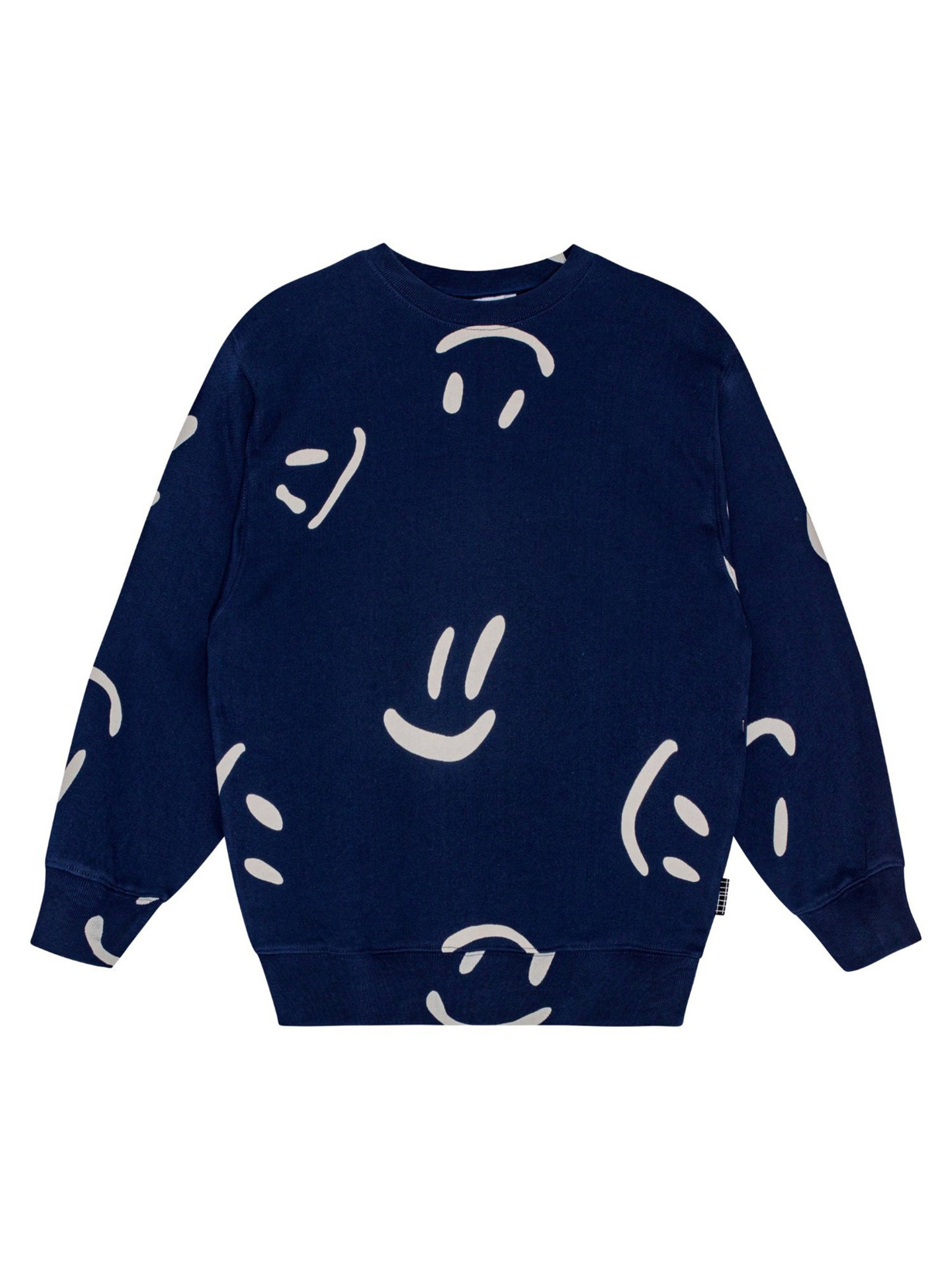 Утепленный свитшот Molo "Monti Big Smiles Navy". Особенности: материал – 100% organic cotton*; сертифицировано GOTS** – изготовлено из сертифицированных органических материалов; внутри – мягкий микрофлис; декорировано сплошным принтом в смайлики; круглый вырез горловины с укрепляющей тесьмой; на рукавах и по низу эластичные манжеты; идеально сочетается с брюками Molo "Adan Big Smiles Navy". *Organic cotton (органический хлопок) – хлопок, выращиваемый без использования вредных химикатов и губительного воздействия на природные ресурсы планеты. **Сертификация GOTS гарантирует, что продукт не содержит опасных химикатов (сертификат GOTS Ecocert Greenlife, №197496). Продукция производится в соответ