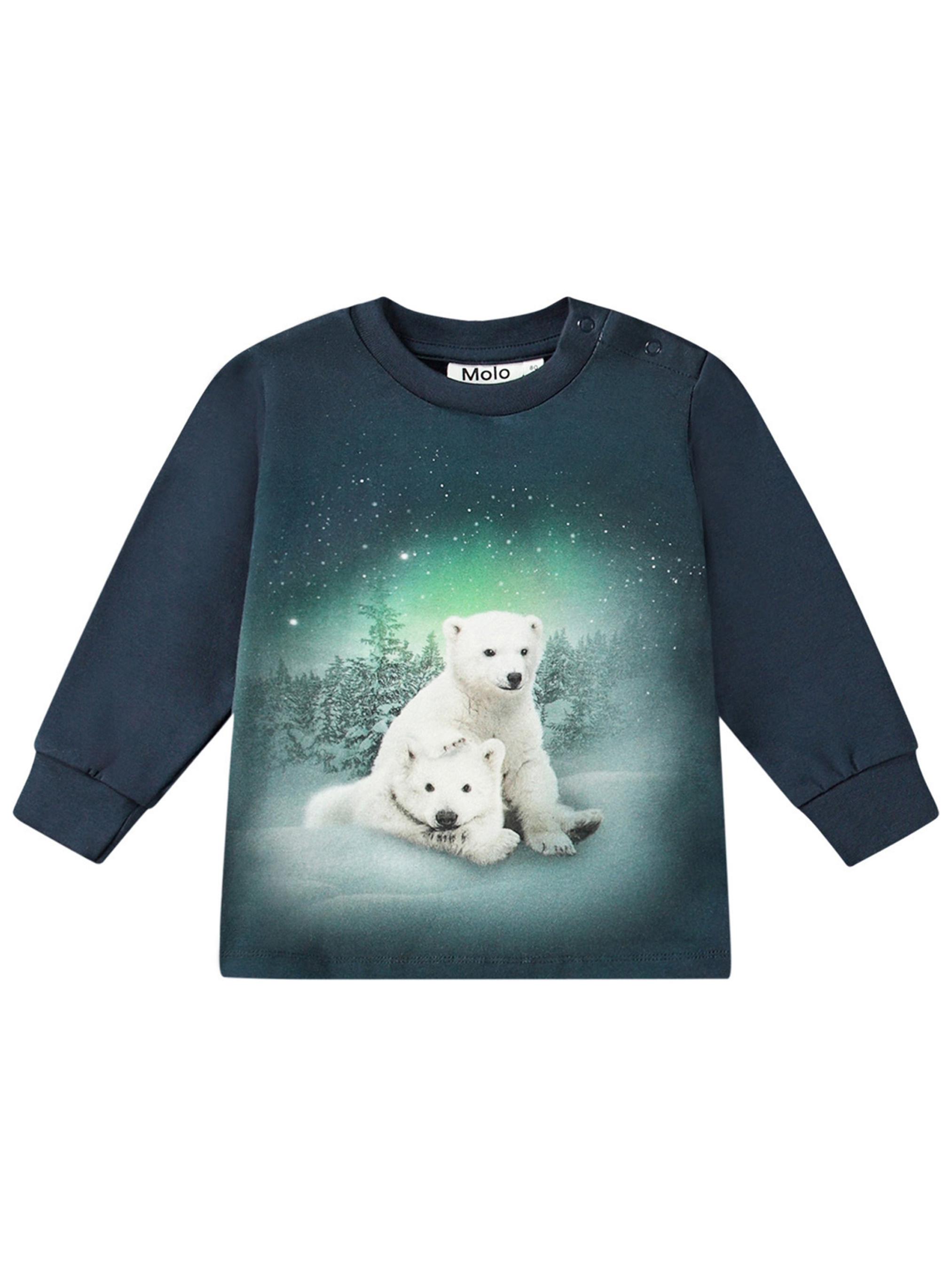 Реглан Molo "Eloy Polar Bear Cubs". Особенности: материал – 100% organic cotton*; сертифицировано GOTS** – изготовлено из сертифицированных органических материалов; декорирован принт с изображением двух белых медведей на фоне полярного сияния; круглый вырез горловины с укрепляющей тесьмой; на плече застегивается на кнопки; эластичные манжеты на рукавах; свободный крой. *Organic cotton (органический хлопок) – хлопок, выращиваемый без использования вредных химикатов и губительного воздействия на природные ресурсы планеты. **Сертификация GOTS гарантирует, что продукт не содержит опасных химикатов (сертификат GOTS Ecocert Greenlife, №197496). Продукция производится в соответствии с самыми строгим