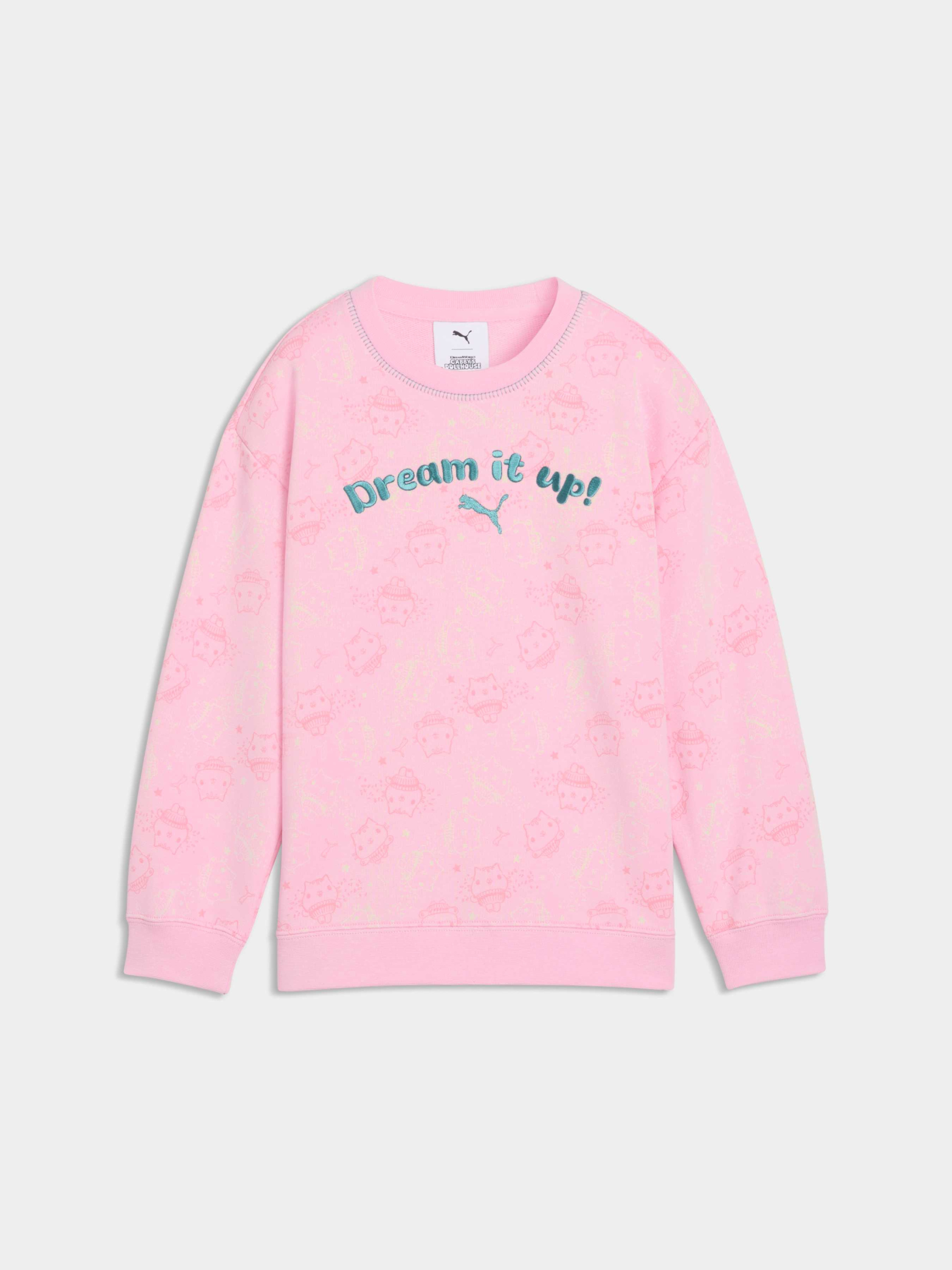 Каждый день — это настоящее кото-наслаждение с коллекцией PUMA x GABBY'S DOLLHOUSE. Юным поклонникам сериала понравится эта версия повседневной одежды в стиле Габби, с ручными рисунками, яркими пастельными тонами и эстетикой DIY. Идеально для любителей кошек — этот свитшот имеет игривый принт с изображением Cakey Cat из Gabby’s Dollhouse и логотип PUMA Cat.