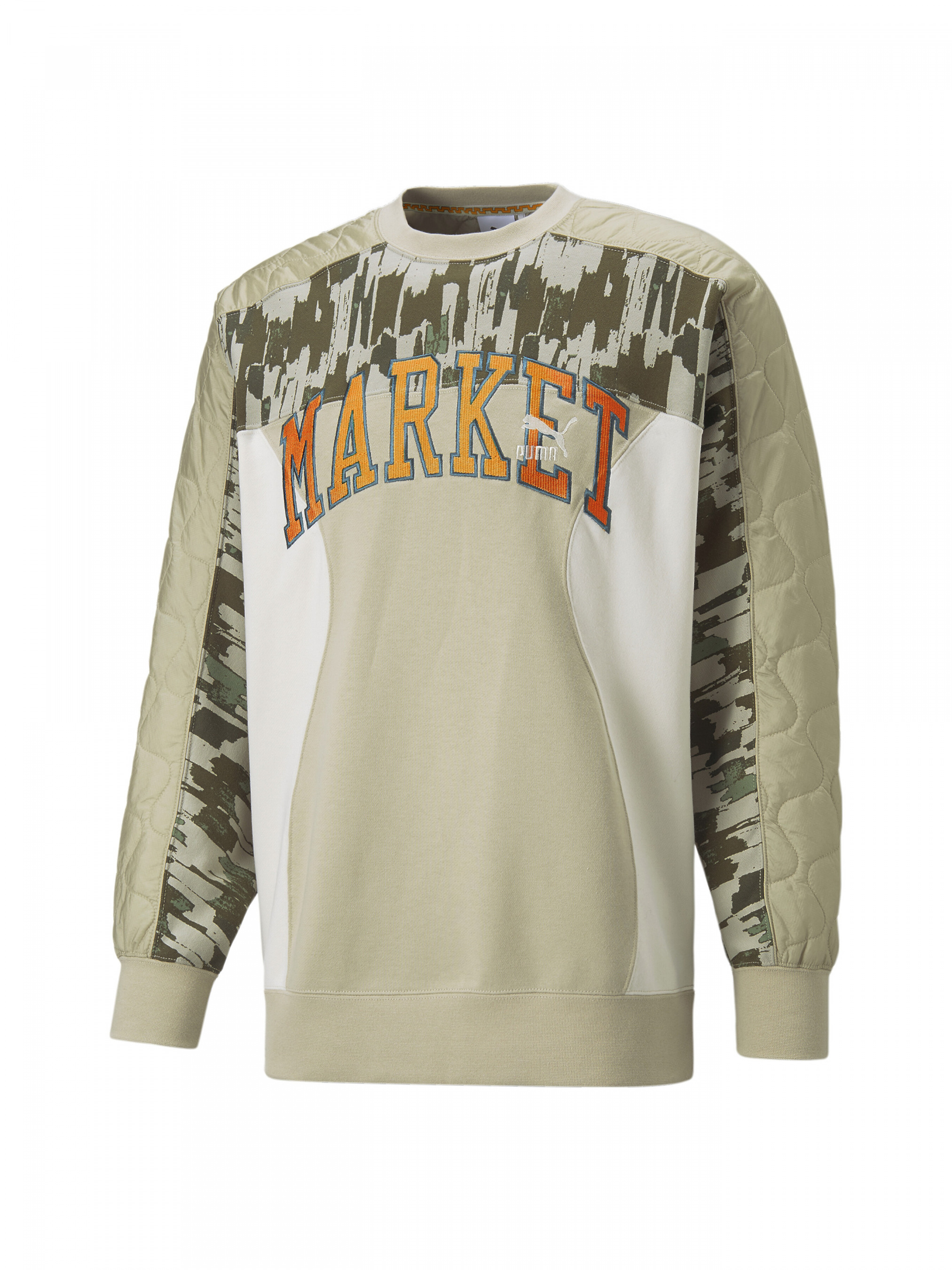 PUMA x MARKET сочетает в себе чувственность Восточного и Западного побережья, объединяя непринужденный стиль с инновациями. Добавьте в свой гардероб яркие цвета и узоры с этим топом свободной посадки из коллекции PUMA x MARKET. Детали Коллекция: Осень-Зима 2022 Стиль: ПремиумХарактеристики Состав: 100% хлопок Хлопок: Хлопок, который используется в продуктах PUMA, поступает с ферм с устойчивым способом ведения сельского хозяйства: с эффективным использованием воды и поддержанием здоровья почвы. Свободная посадка Круглый вырез в рубчик Манжеты и низ — в рубчик Скругленные линии кроя в стиле колорблок «Камуфляжные» и стеганые вставки Трикотаж френч терри Вышивка MARKET на груди Вышитый логотип PUMA Archive No. 1 на груди Страна-производитель: Китай