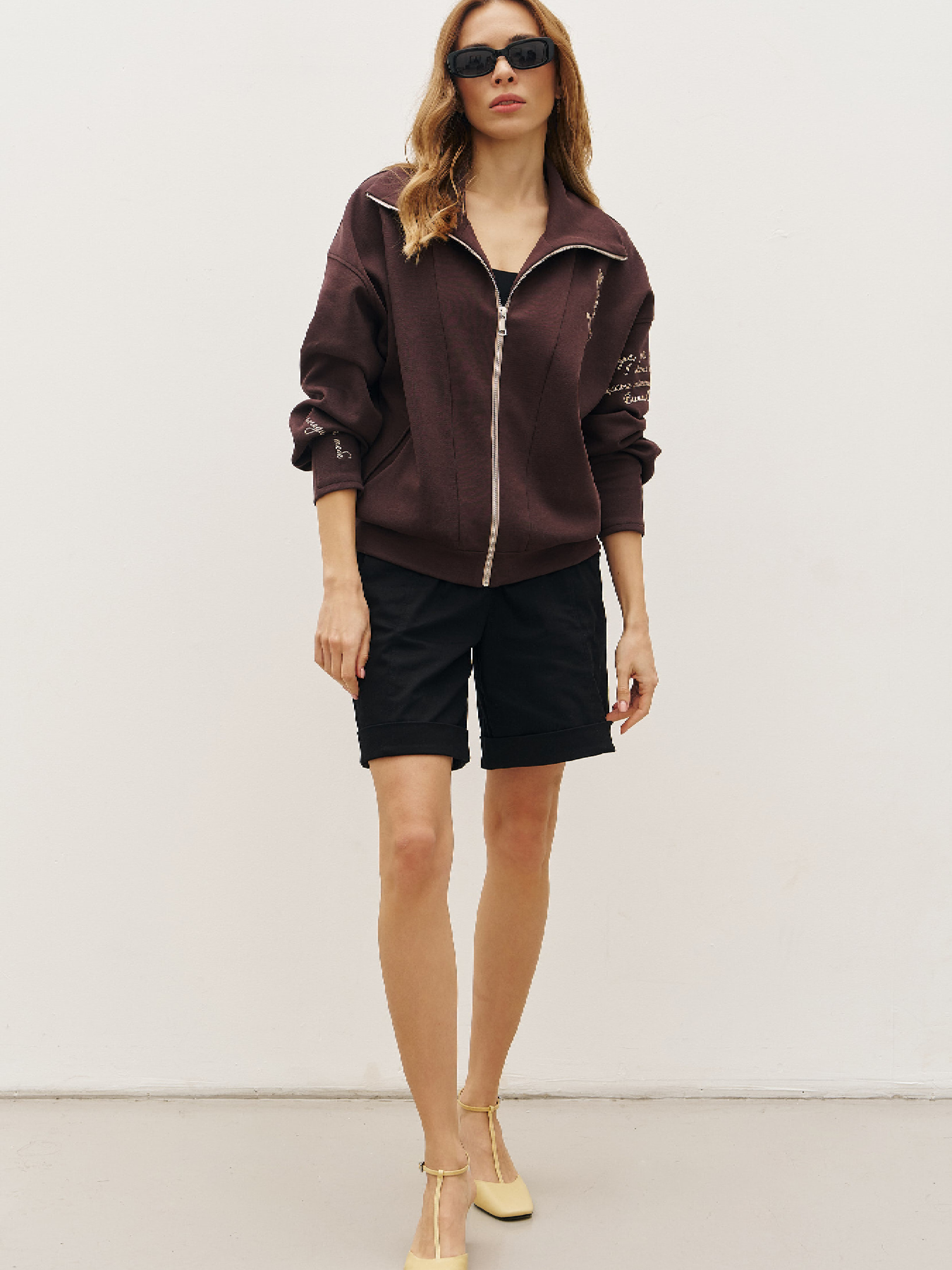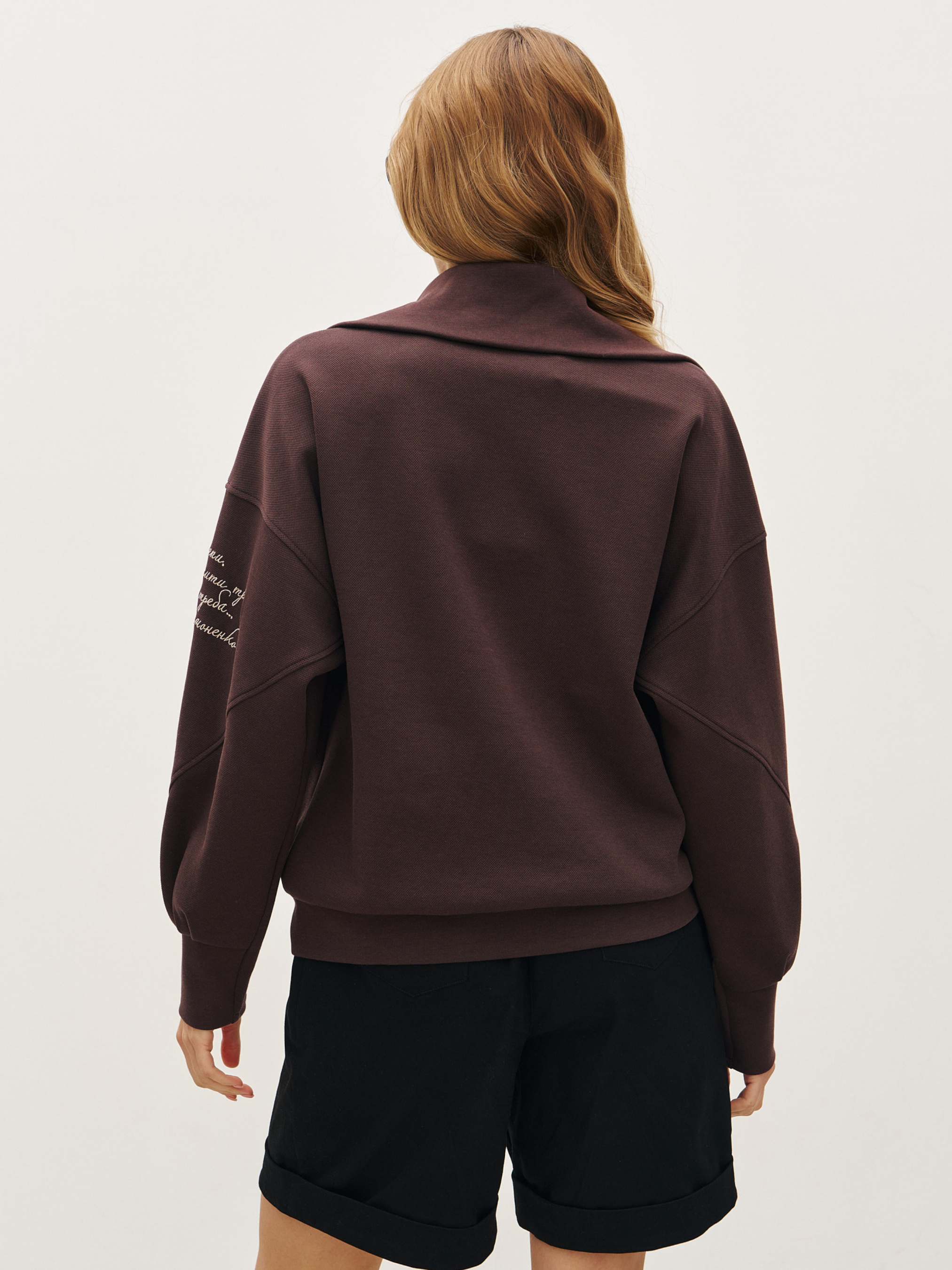 Оверсайз-кофта на змейке из тисненого трикотажа-рогожки. Силуэт имеет более широкую основную часть и подобран на мягкую резинку. Высокий воротник-стойка. Спереди для удобства хорошо прорезаны карманы. Украшена авторской вышивкой в виде изящных цветочных элементов и строк из произведения Василия Симоненко. Состав: хлопок 70%, вискоза 25%, эластан 5%. Замеры по изделию: Обхват груди: S – 116 см, M – 118 см, L – 120 см, XL – 122 см. Обхват низа: S – 58 см, M – 59 см, L – 60 см, XL – 59 см. Резинка внизу хорошо тянется. Рост модели 174 см. Параметры модели 84-60-89 см, размер модели S.