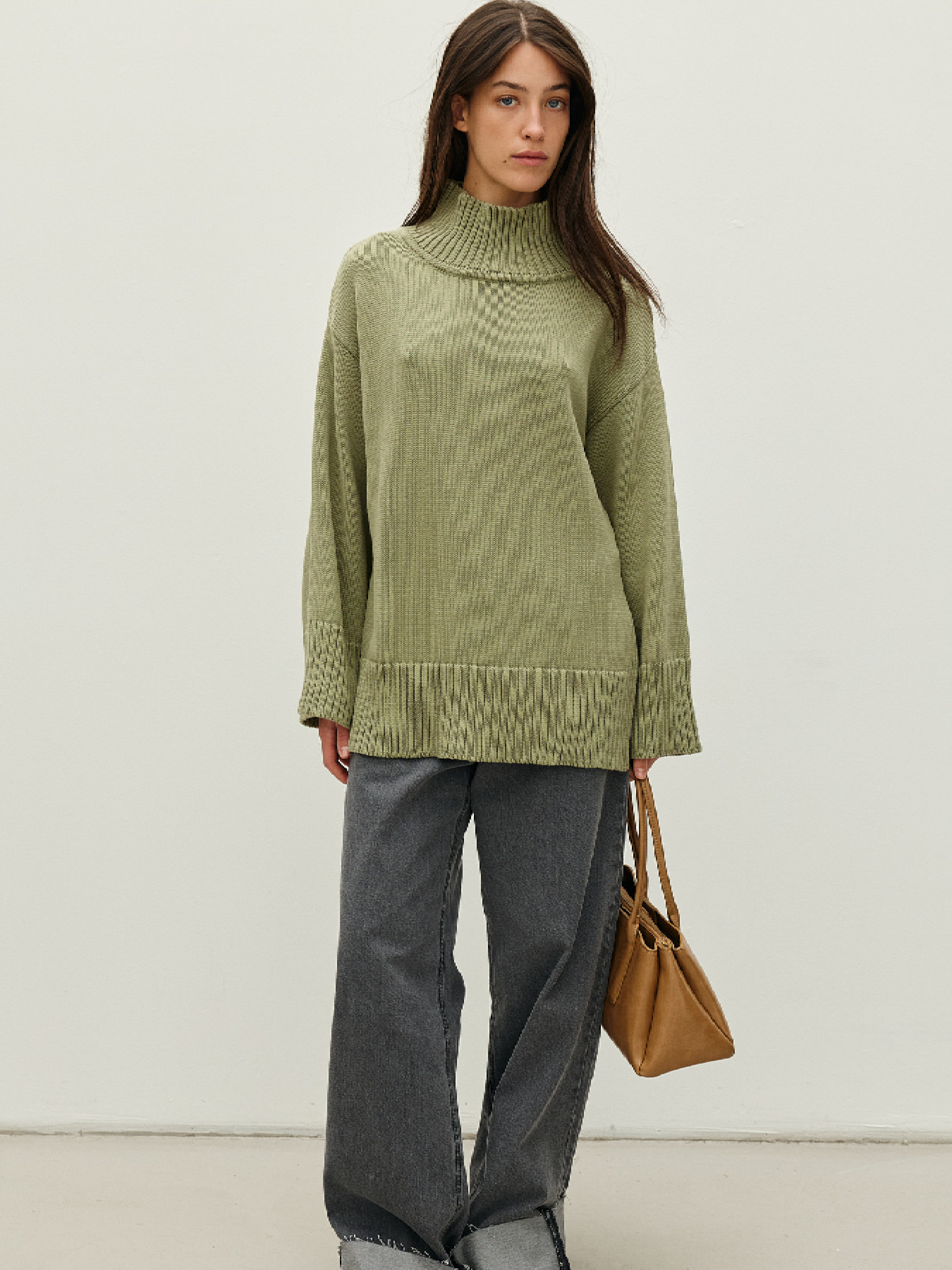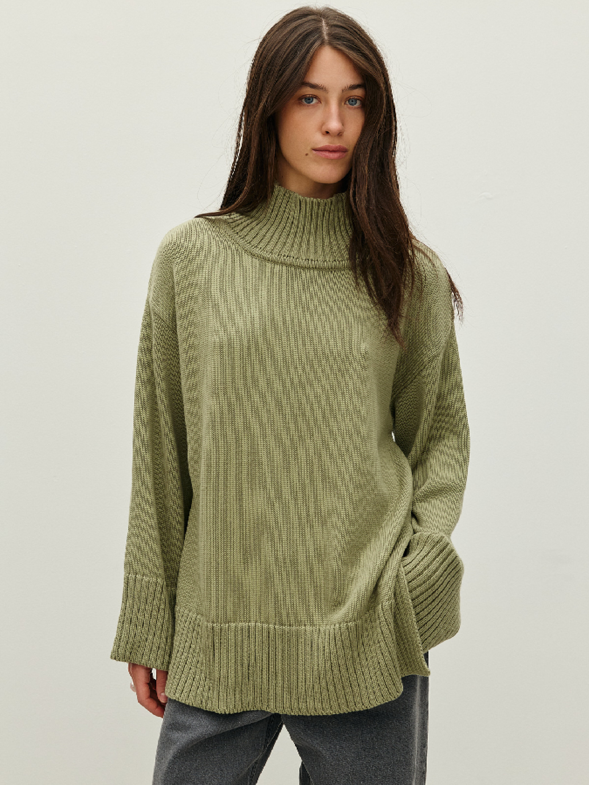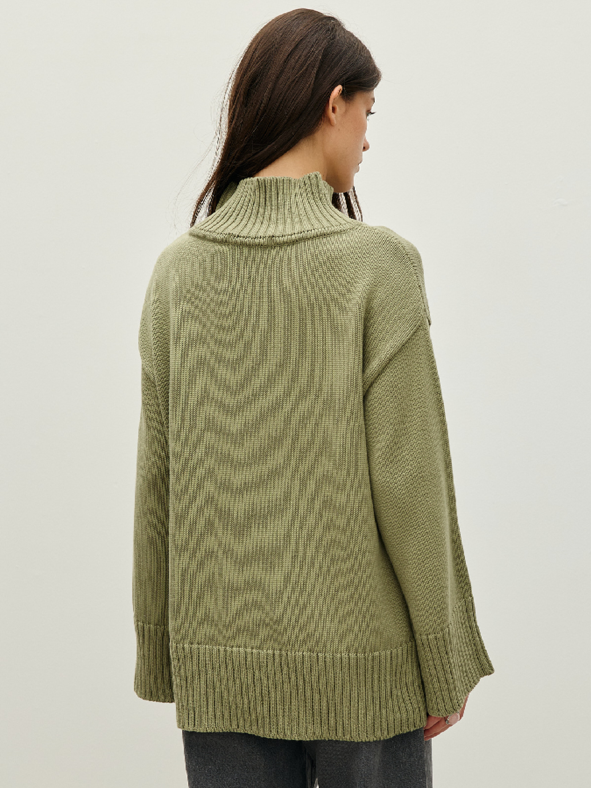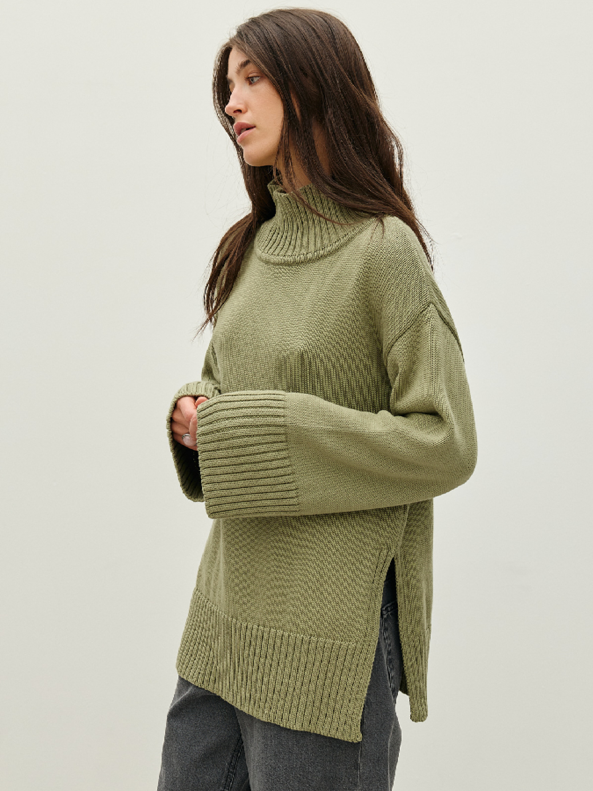 Мягкий свитер с разрезом сбоку. Модный широкий крой с воротником-стойкой. Фактурный манжет продолжает ширину рукава. Нижняя часть подхвачена высокой эластичной резинкой. Выполнен из приятной на ощупь котоновой пряжи, которая отлично сохраняет тепло и дарит комфорт в носке. Состав: хлопок 100%. Замеры по изделию в ширине плеч: S – 54 см, L – 60 см. Замеры по изделию в обхвате груди: S – 112 см, L – 120 см. Замеры изделия по низу в бедрах: S – 100 см, L – 112 см.
