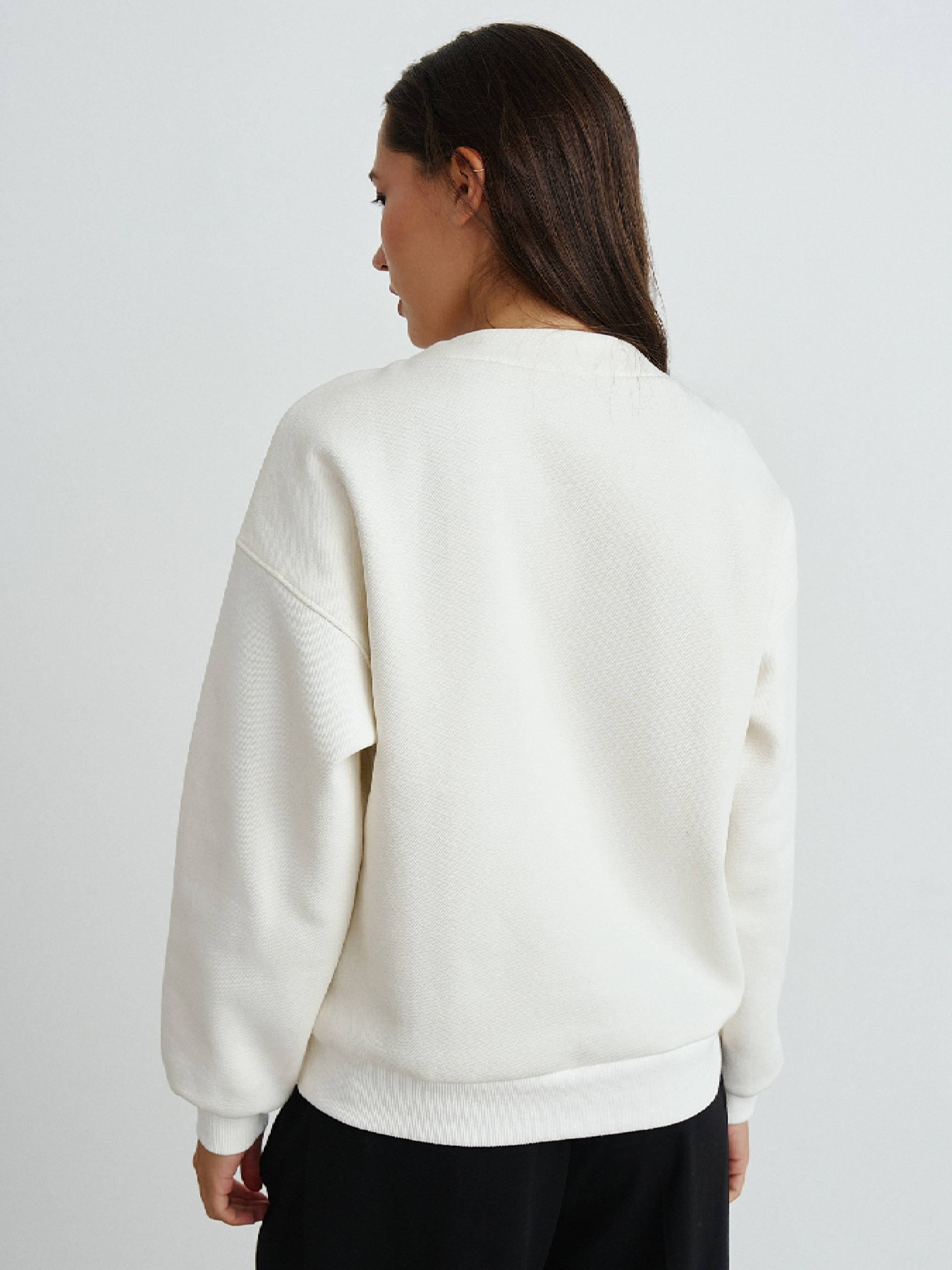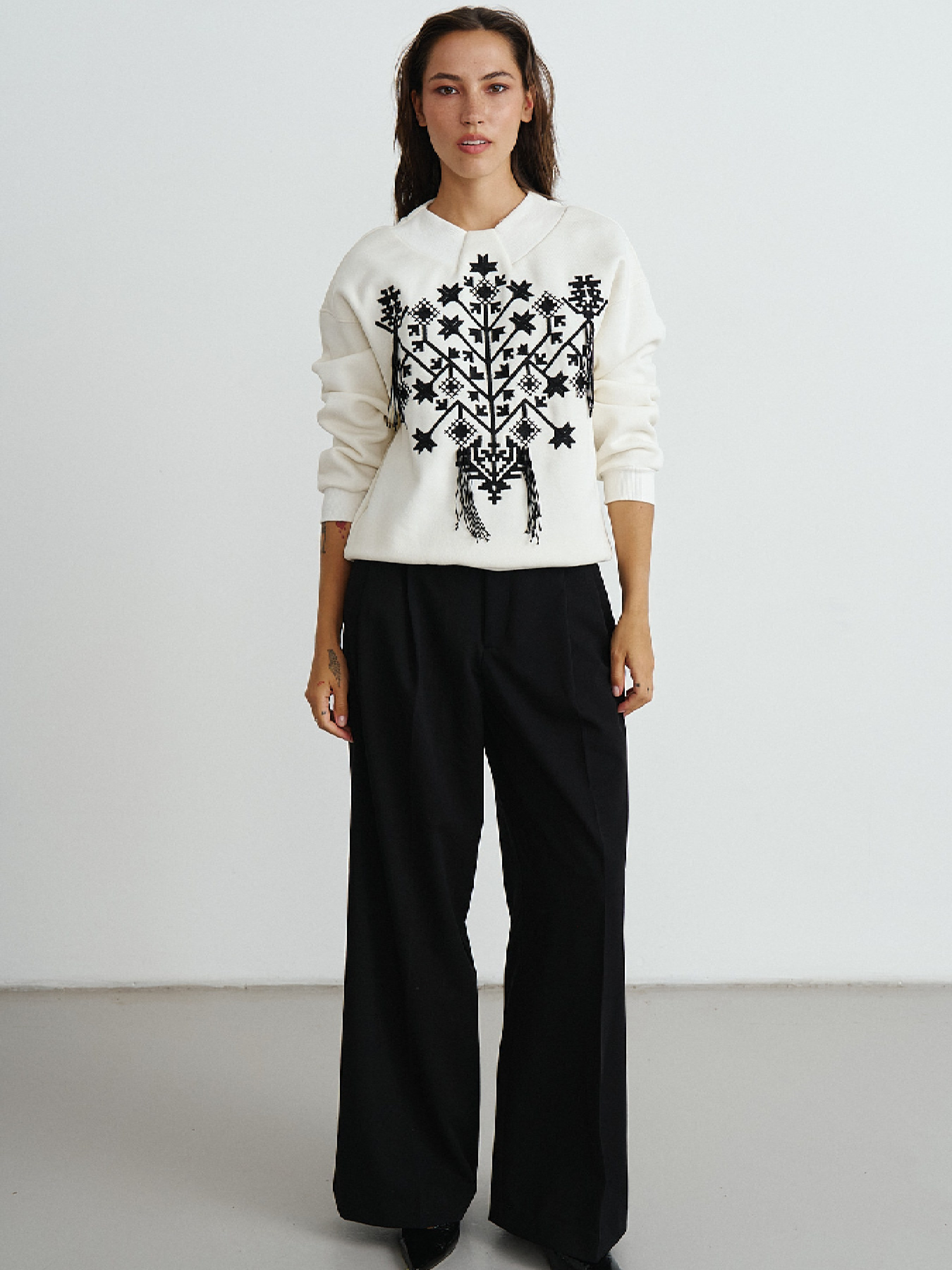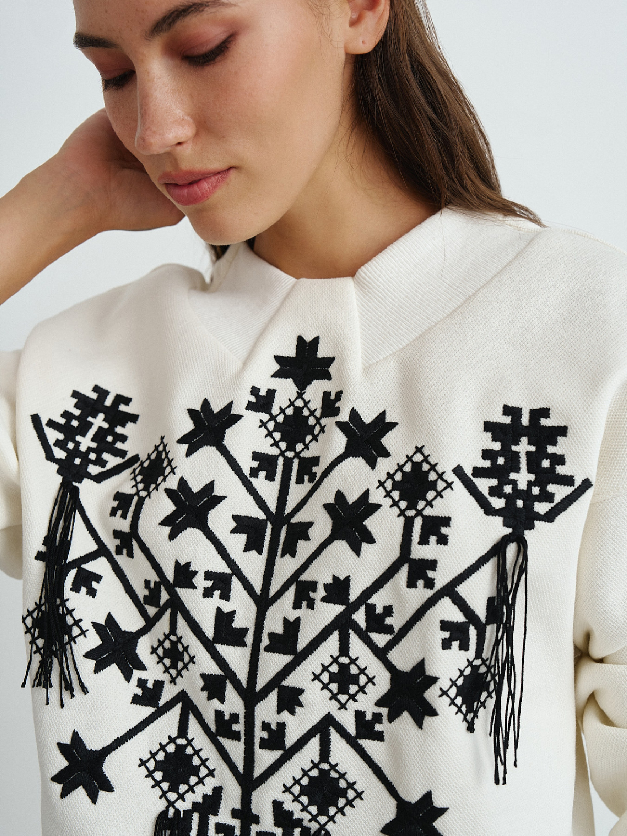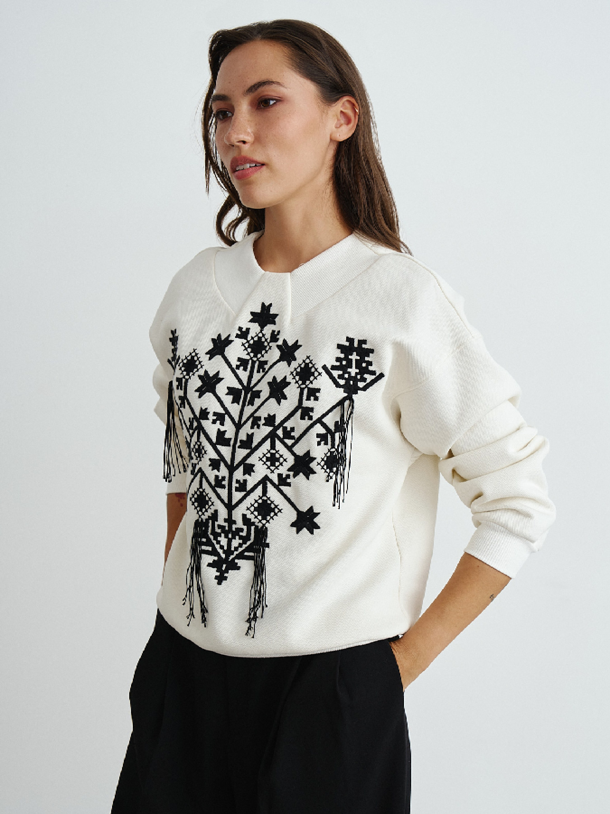 Сочетание современности с культурным наследием дизайнеры RicaMare реализовали в свитшоте Жемчужина Слобожанщины. Вышивка Харьковской области с традиционными элементами находится на передней части изделия. Декоративные элементы вышивки вдохновлены архивными полотенцами бывшего Первомайского района Харьковской области. Декорирован с помощью ручной работы мастериц в виде выпущенных кистей по вышивке. Изготовлен из фактурной тринитки с флисом. В обработке зоны воротника задействована вставка из кашкорса. Декор и выразительное ахроматическое сочетание цветов усиливают величие традиционной одежды и возводят свитшот за пределы обычной повседневной одежды.