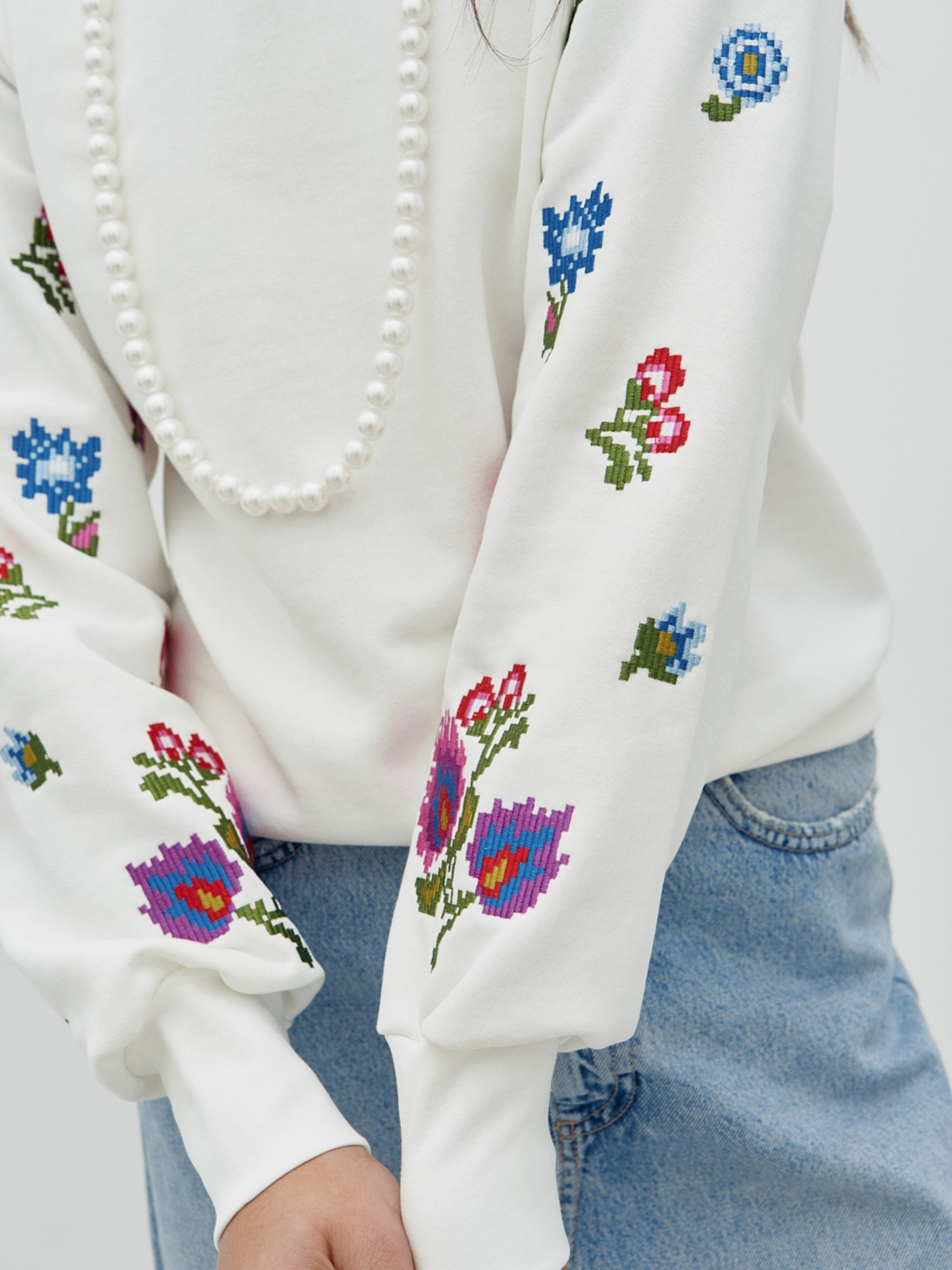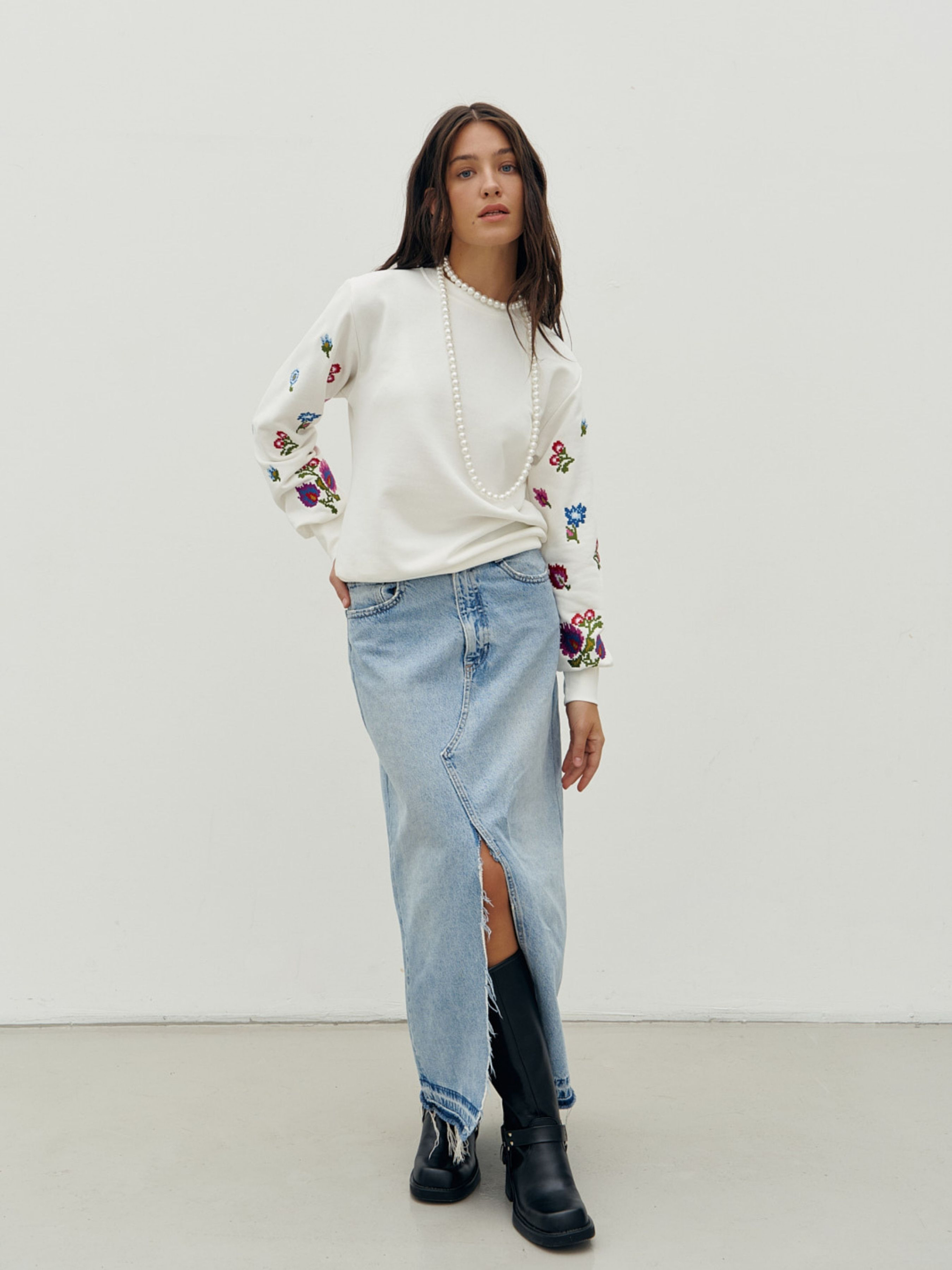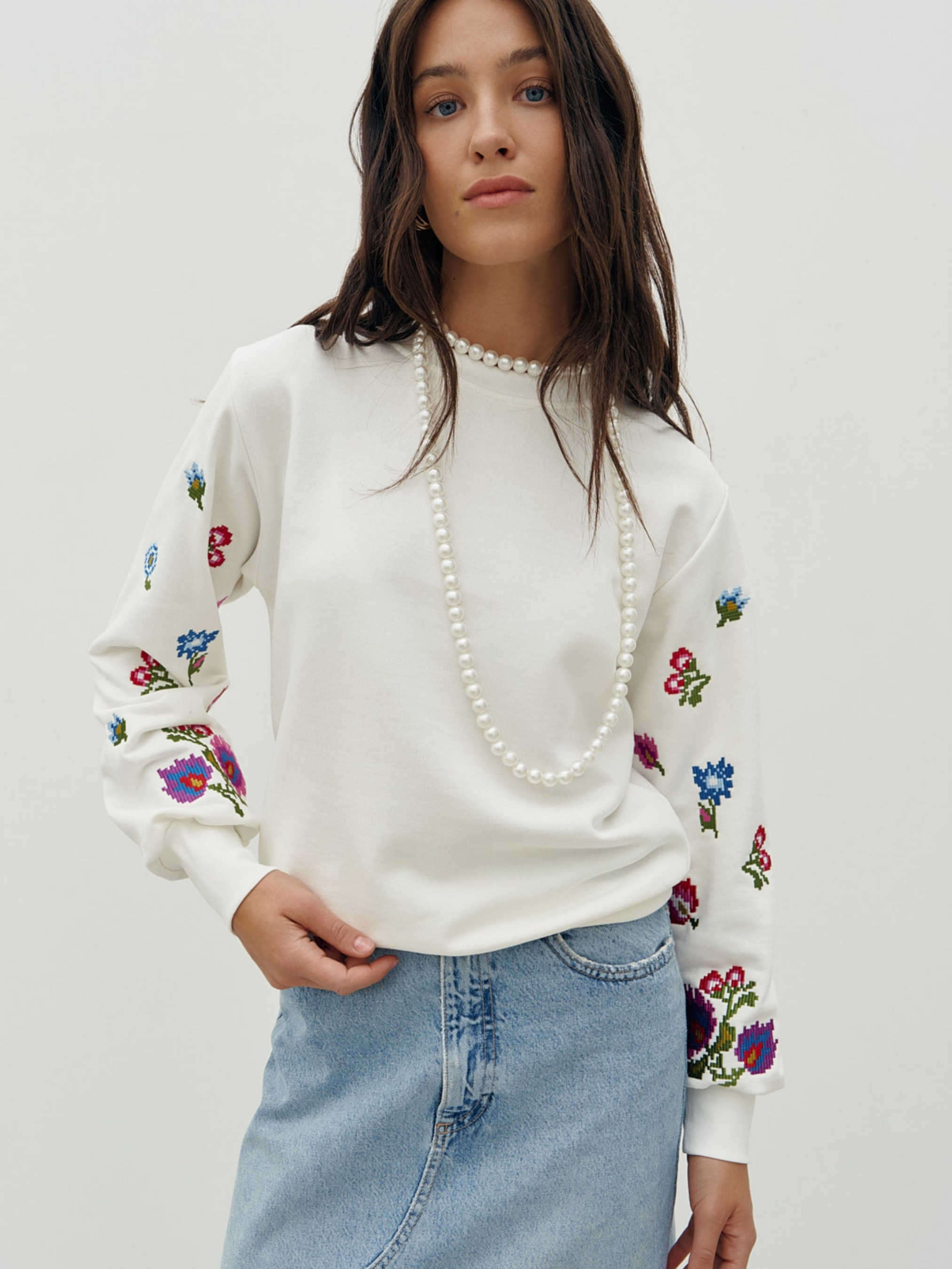 Свитшот выполнен из трехнитки с вышивками по рукавам. Модель в прямом крое с аккуратным приспущенным плечом. Форма горловины-полукруглая. Длинный рукав присобран на высокий манжет. По нижней части предусмотрена мягкая кокетка, формирующая правильный напуск. Кофта украшена невероятной гладьевой вышивкой в контраст изделия. Состав: хлопок 95%, еластан 5%.
