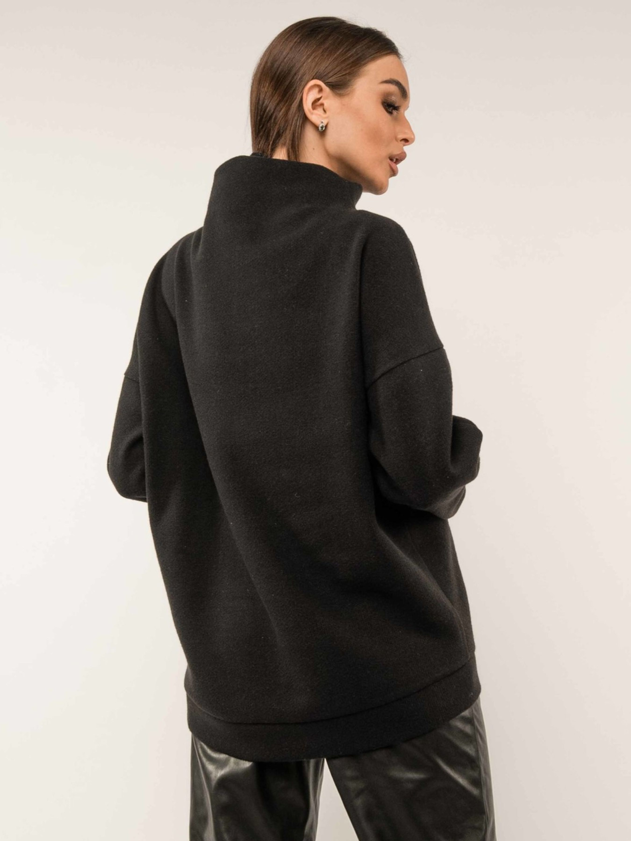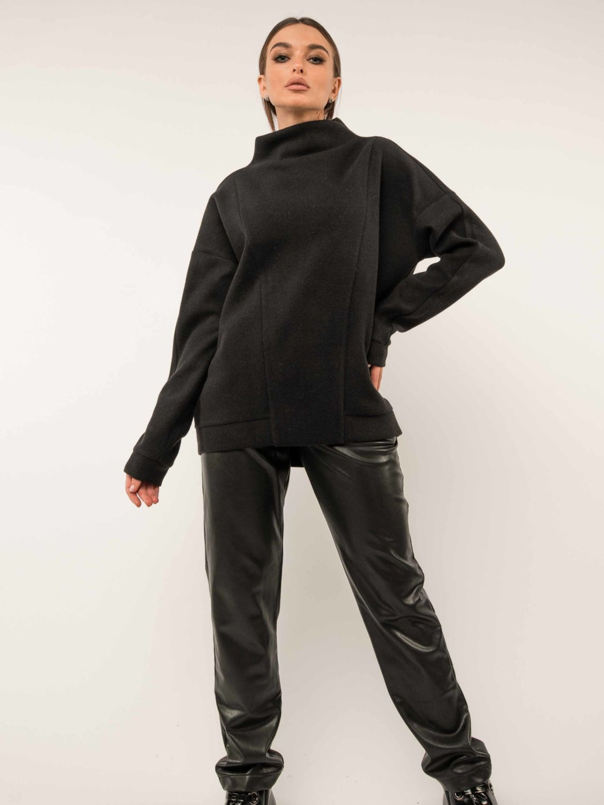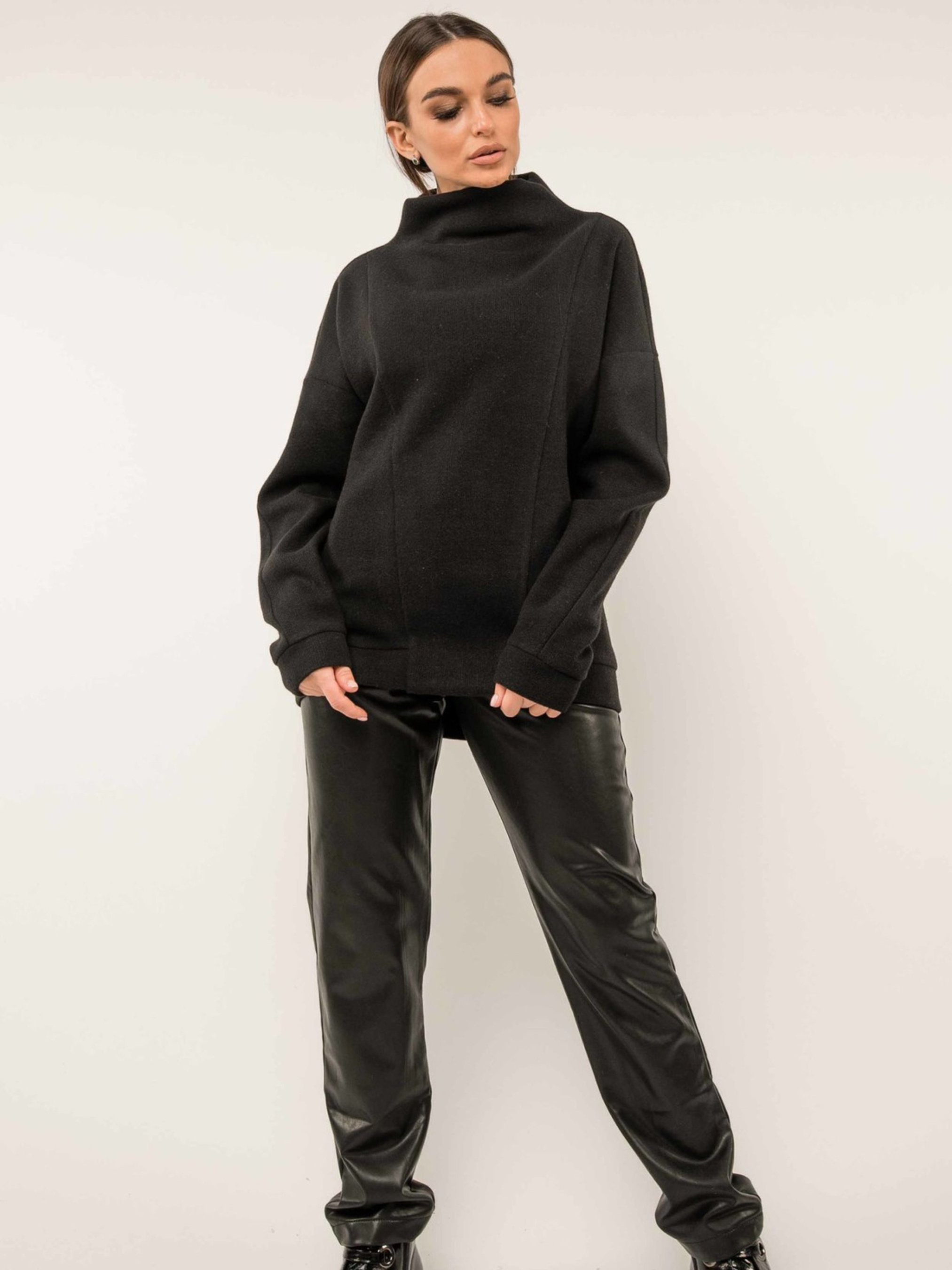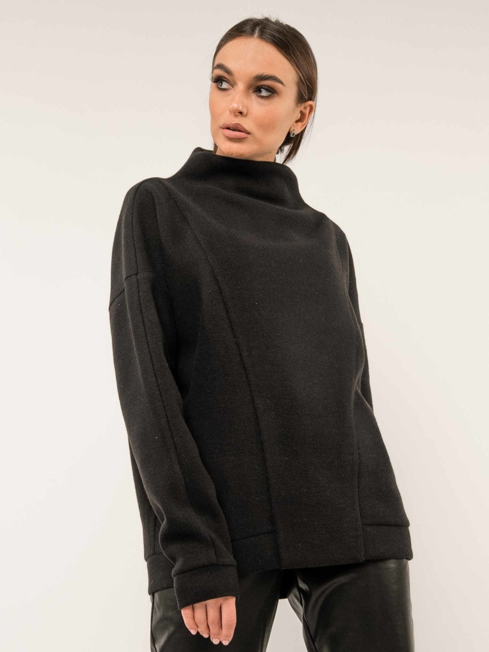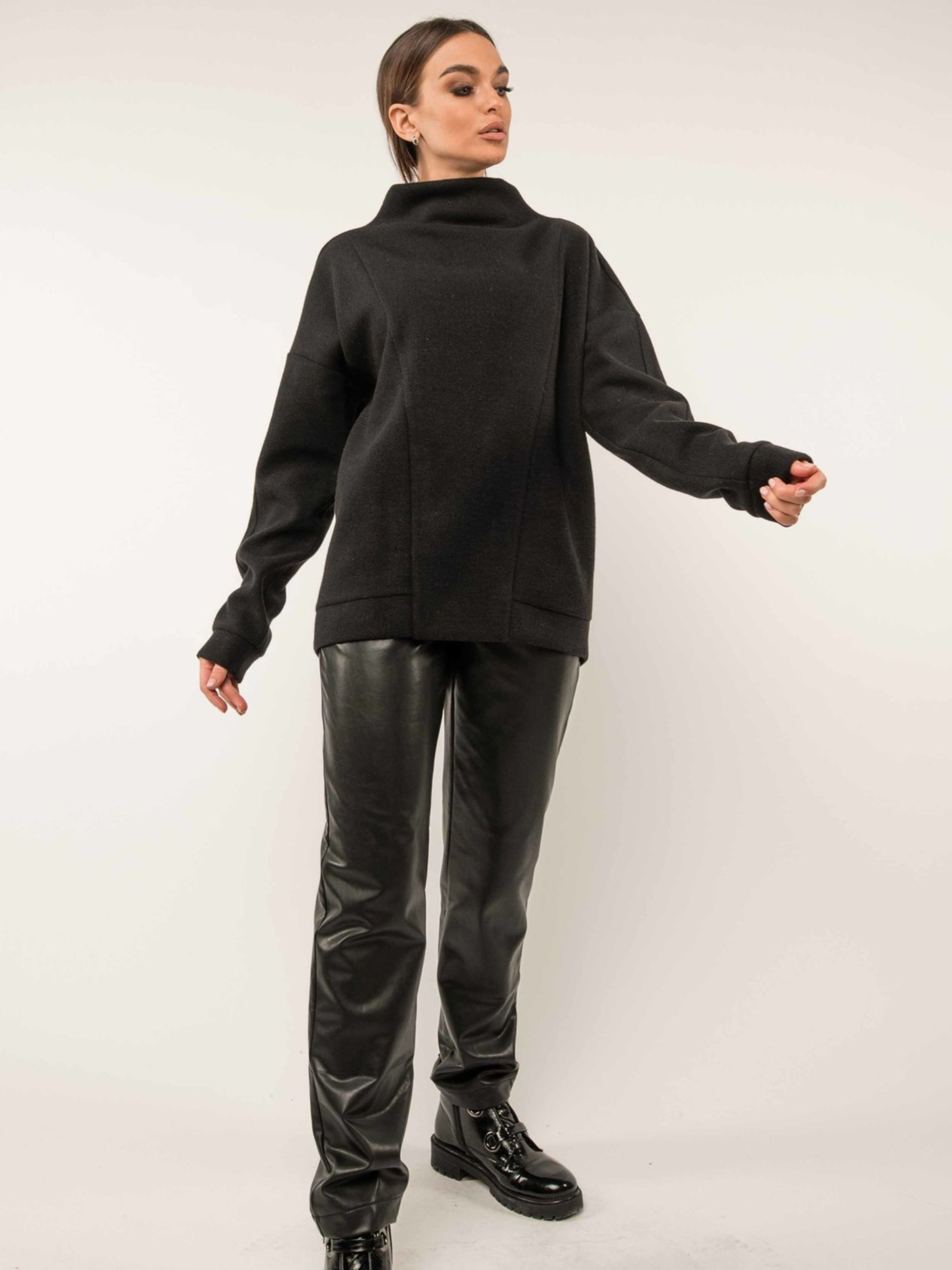 Автентичний повсякденний світшот з оригінальною цільнокроєною горловиною-стійкою вдало поєднує в собі цікавий крій, універсальність та практичність в'язаної трикотажної тканини. Завдяки цьому він чудово підійде як для стриманого офісного дрес-коду, так і для створення затишних неформальних образів. Вільний рукав із подовженою лінією плеча завершується акуратною манжетою. Передня частина світшота прикрашена оригінальними симетричними швами, що додають виразності. По низу світшота розташована манжета, а спинка злегка подовжена, створюючи сучасний силует. Зручний здвоєний розмір забезпечить ідеальну посадку. Виготовлений з теплого та приємного на дотик в'язаного трикотажу "зима", що містить віскозу, поліестер та шерсть, цей світшот подарує вам відчуття комфорту та затишку в прохолодну погоду. Його універсальний дизайн дозволяє легко комбінувати його з різноманітним низом, створюючи стильні та практичні образи на кожен день. Характеристики: Матеріал: В'язаний трикотаж зима (55% віскоза, 40% поліестер, 5% шерсть) Стиль: Повсякденний, офісний (стриманий), неформальний, оригінальний Крій: Вільний Горловина: Цільнокроєна стійка Рукав: Вільний, подовжена лінія плеча, манжета Деталі: Оригінальні симетричні шви спереду, манжета по низу, подовжена спинка Розміри: Здвоєні Властивості: Теплий, комфортний, стильний, універсальний Сезон: Осінь, зима, весна (прохолодна погода)