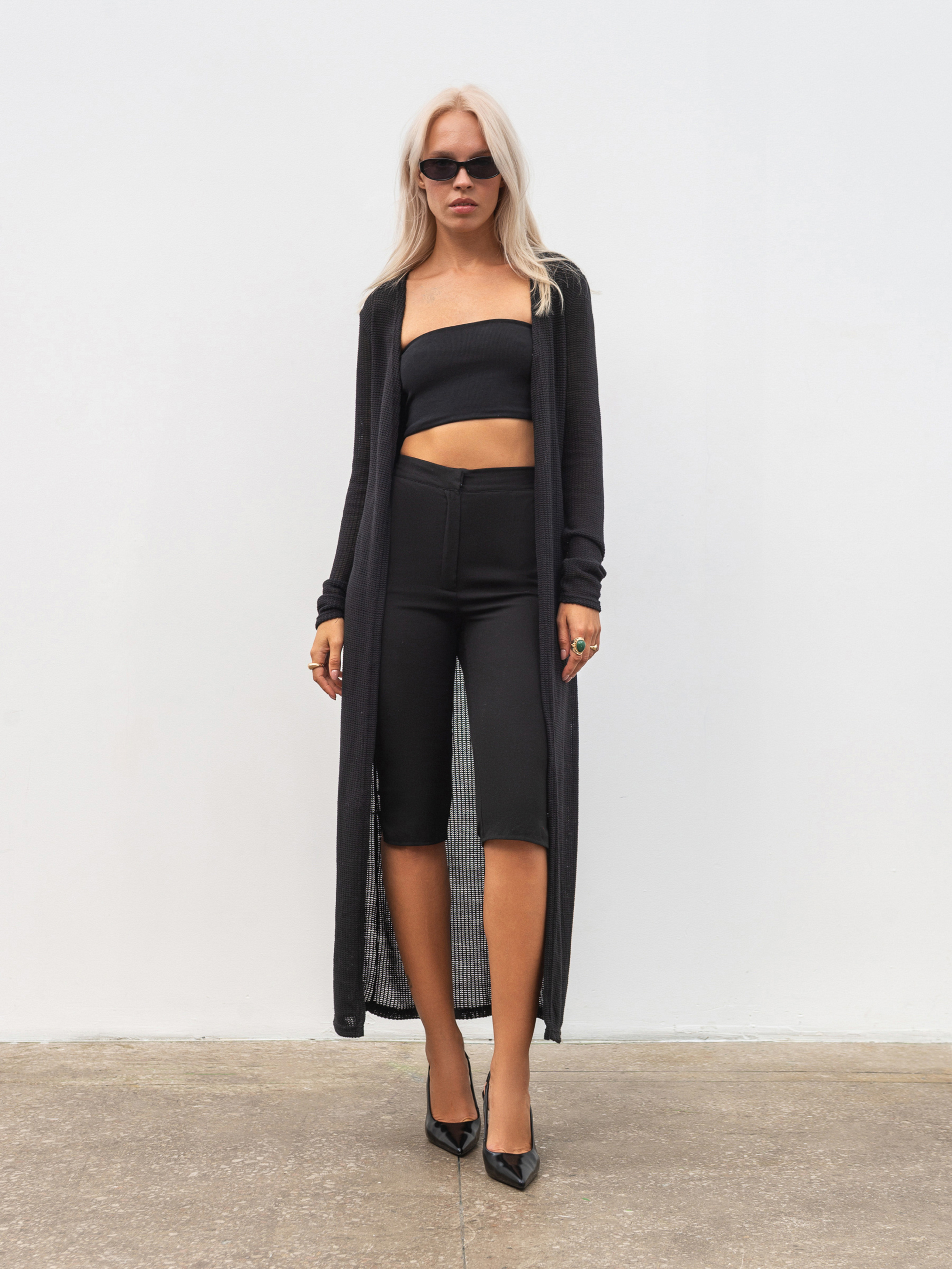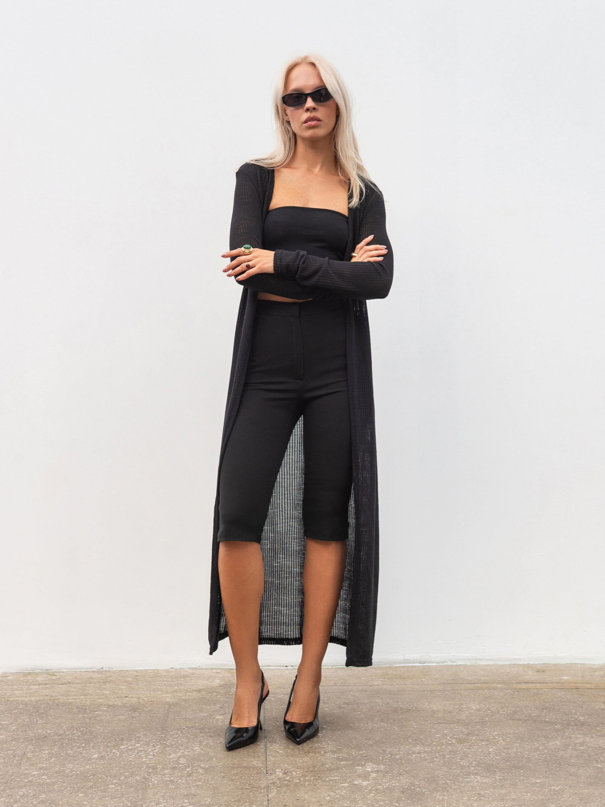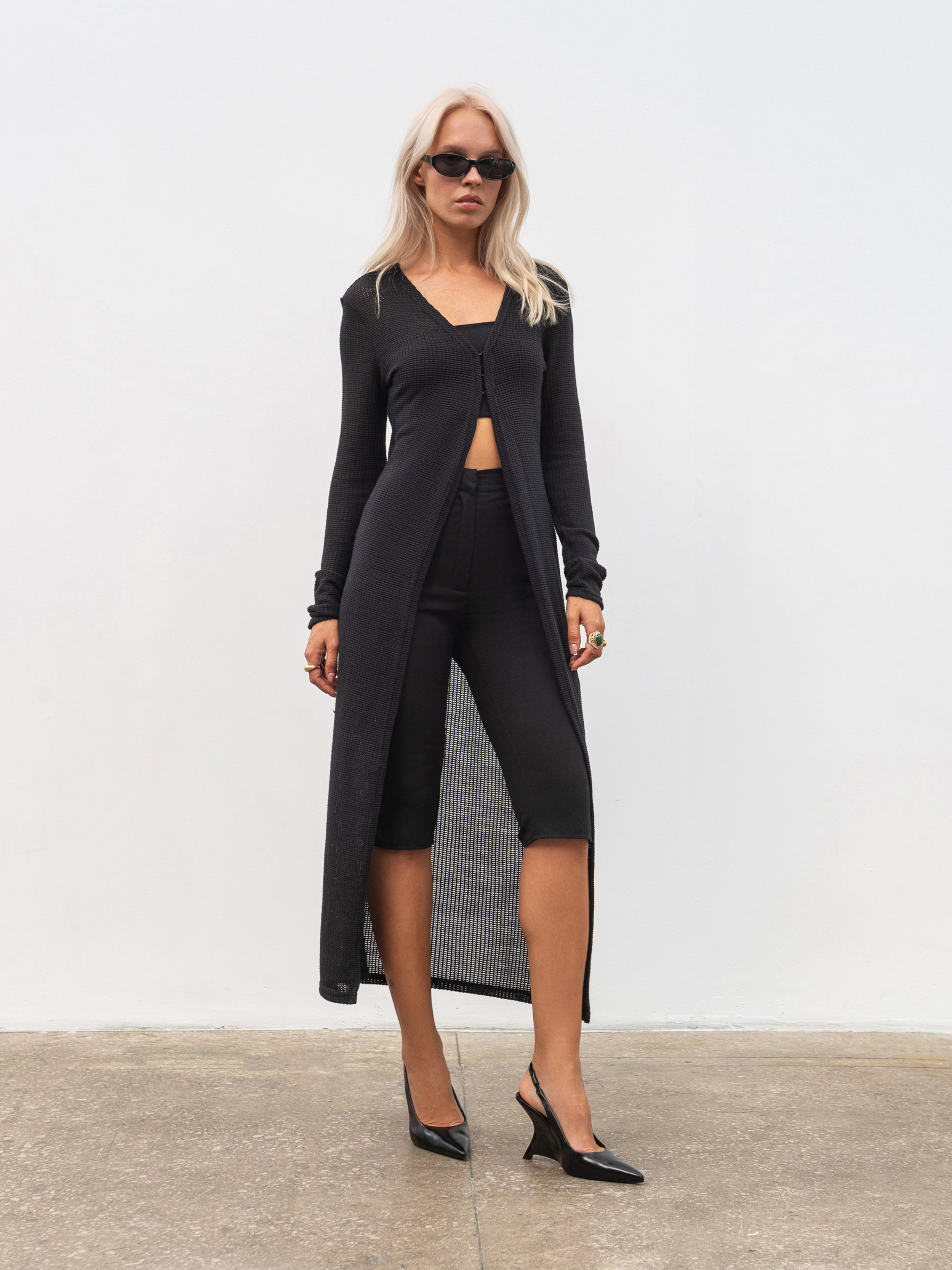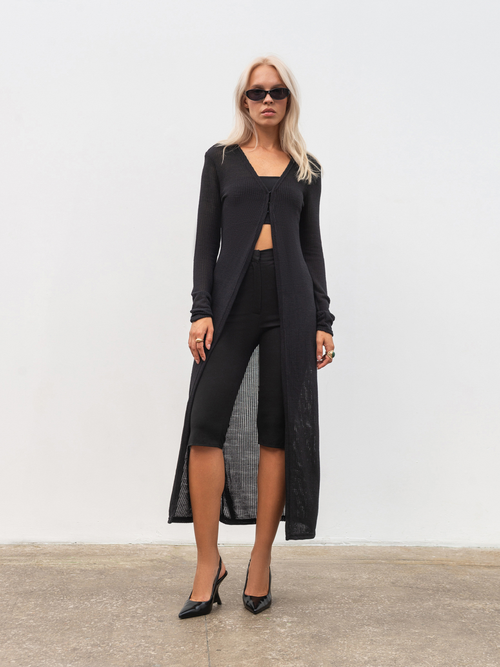 Длинный макси-кардиган из фактурного трикотажа с плетением универсальный элемент базового гардероба. Мягкая и приятная к телу ткань (60% вискоза, 40% хлопок) хорошо тянется, обеспечивая комфорт при ежедневном ношении. Модель в свободном фасоне застегивается на три маленьких крючка, сохраняя лаконичность силуэта. Идеально сочетается с любым низом от джинсов до платьев, создавая уютный и стильный образ. Доступные цвета: молочный, черный. Длина по спине: 122 см. Длина рукава: 63 см Полуобхват груди: 46 см Плечи: 37 см Полуобхват талии: 38 см