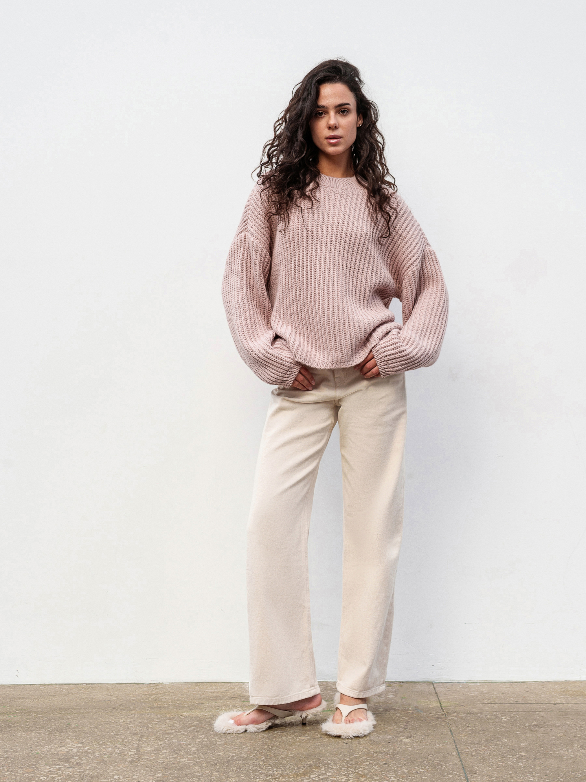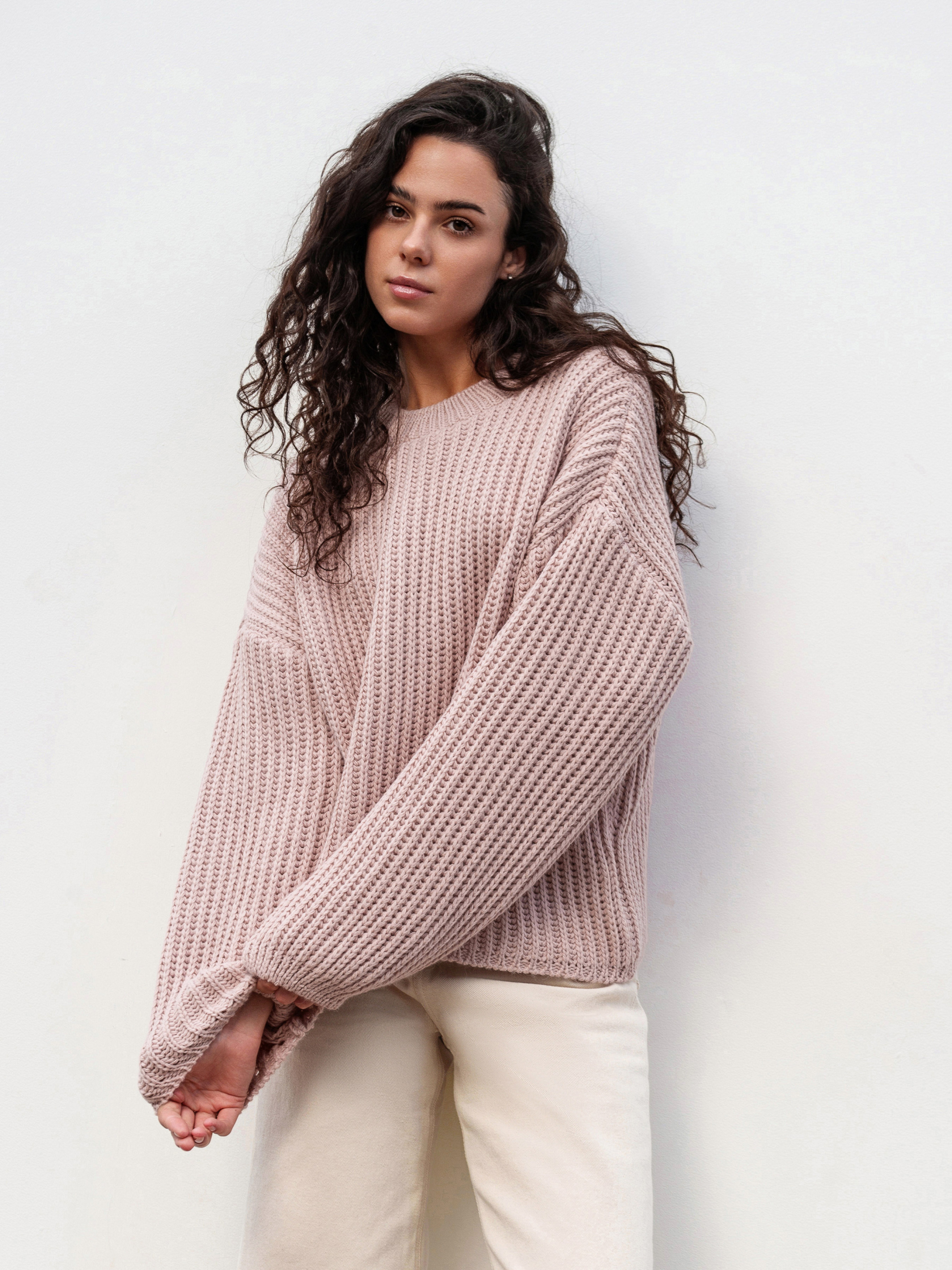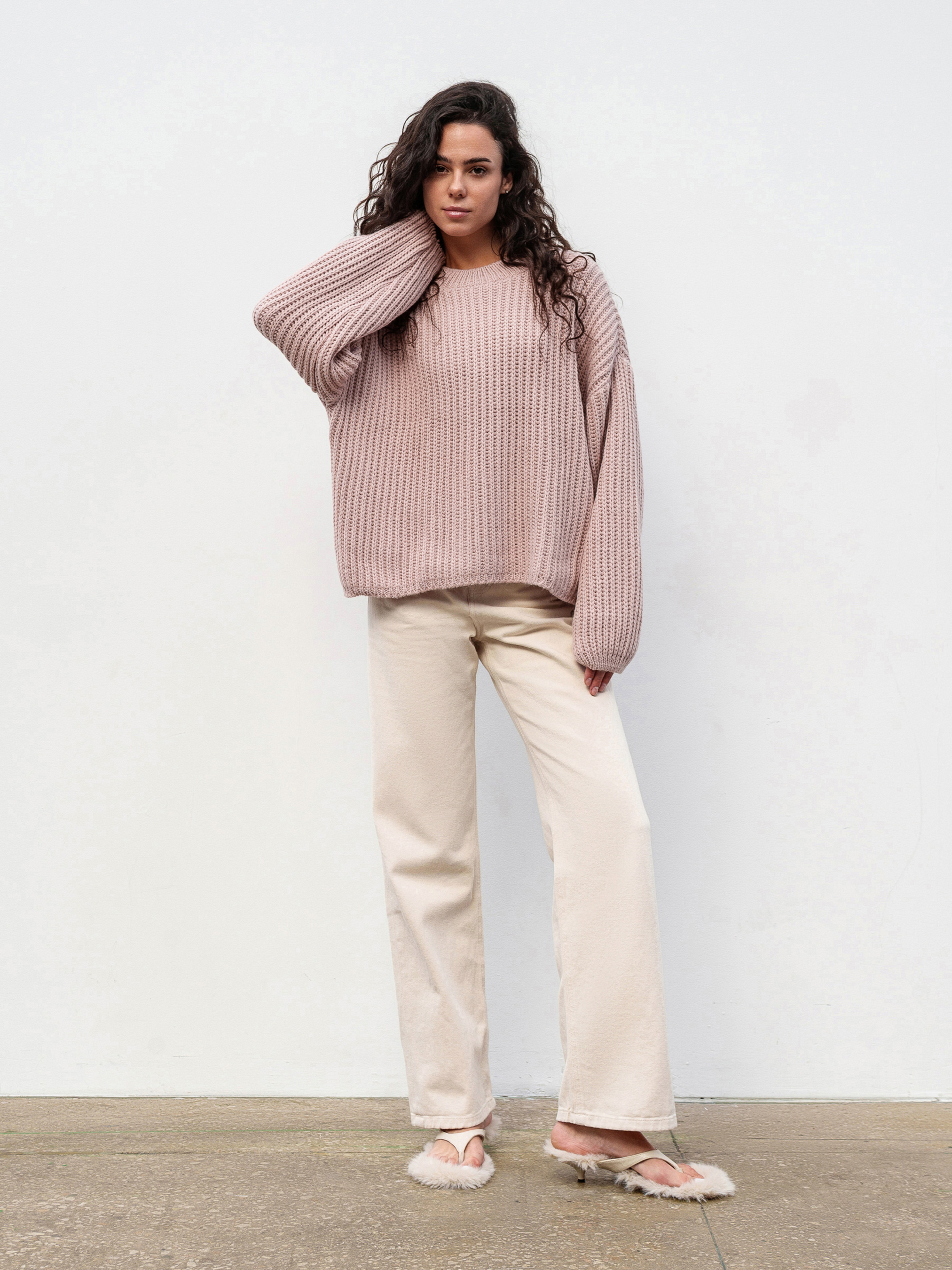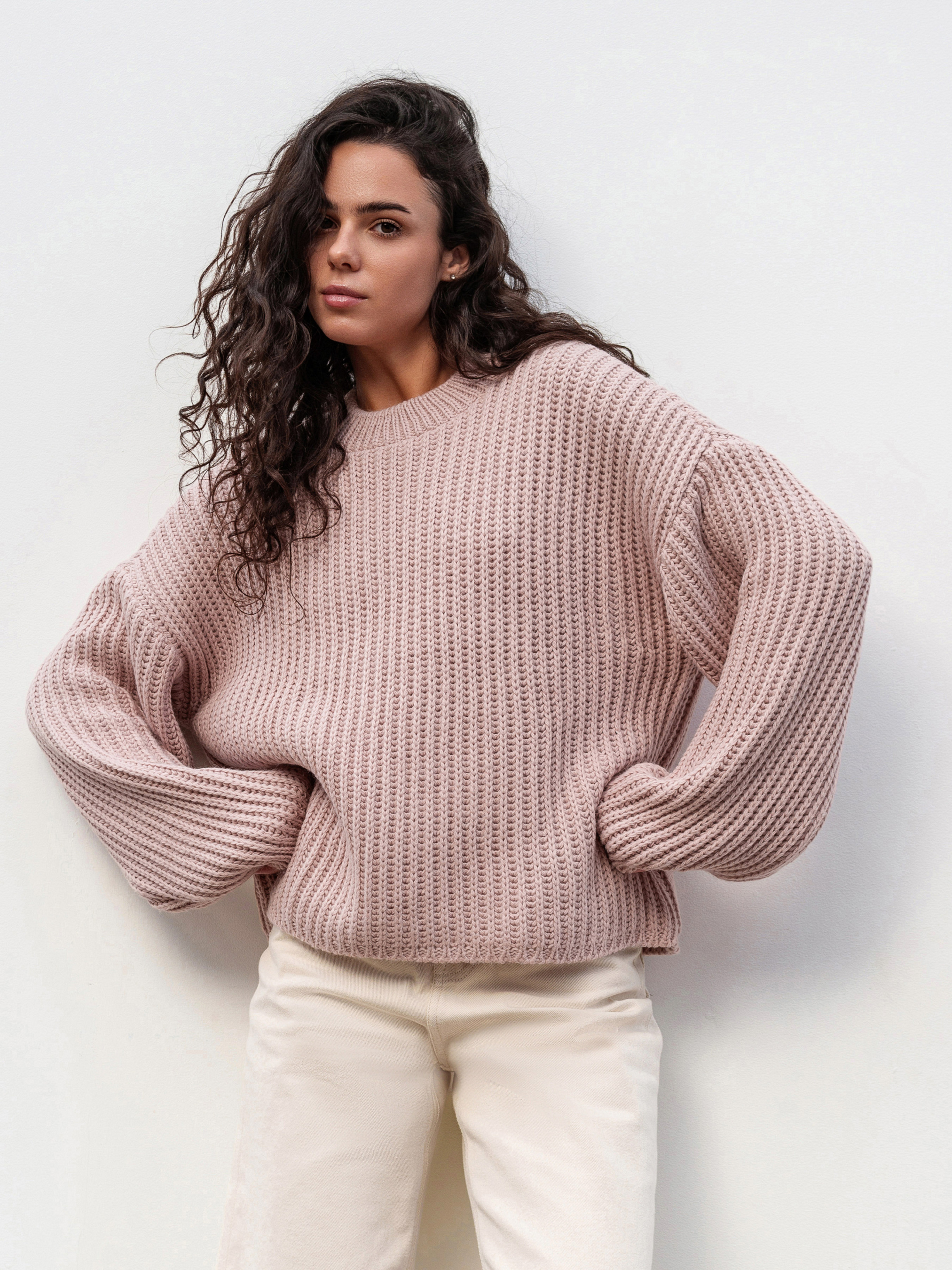 Свитер свободного фасона под горло, со спущенной линией плеча. Плотная вязка, в составе шерсть. Подойдет под любой базовый низ. Длина по спине: 54 см Длина рукава: 50 см Полуобхват груди: 61 см Плечи: 67 см Полуобхват талии: 63 см