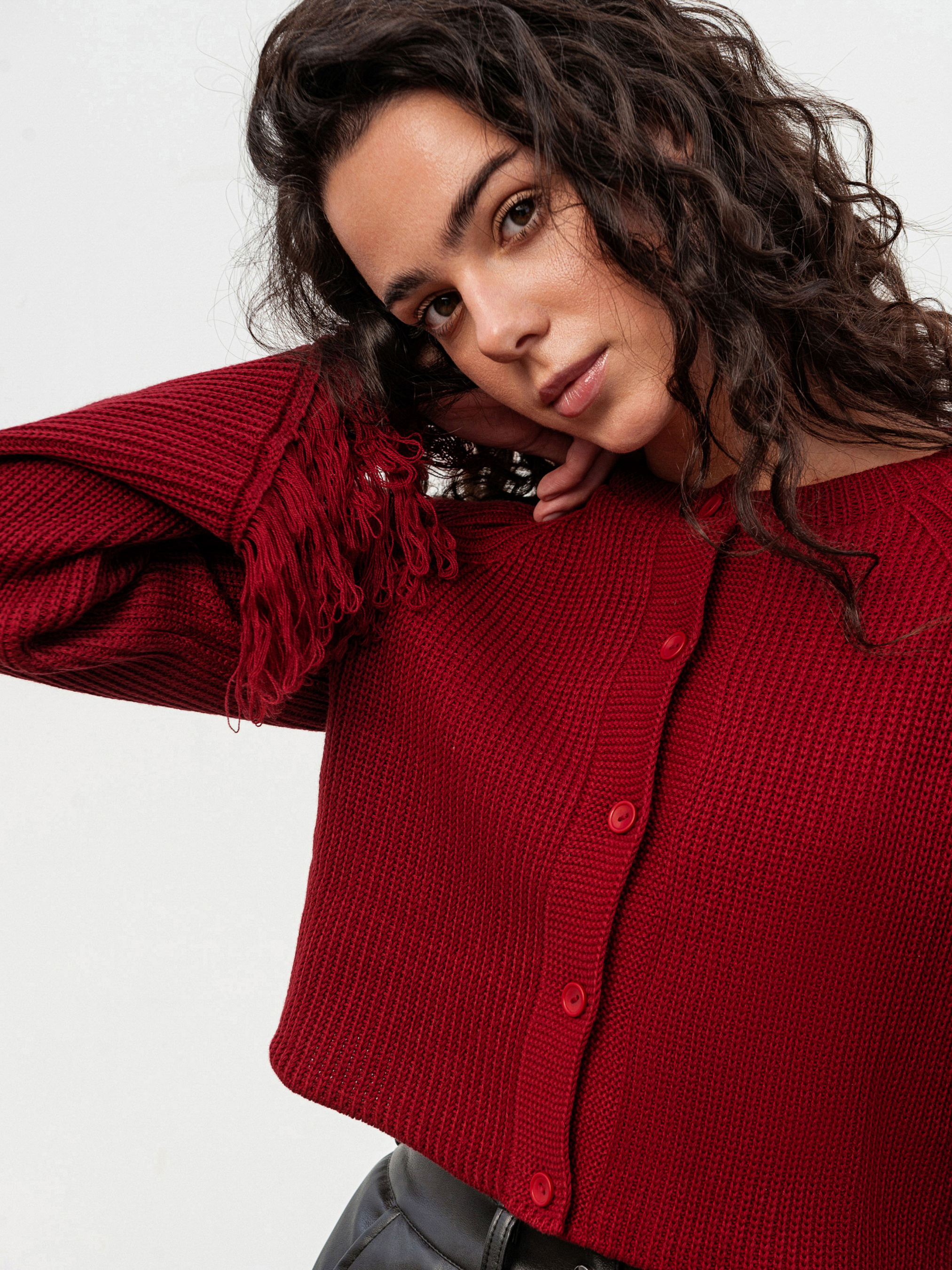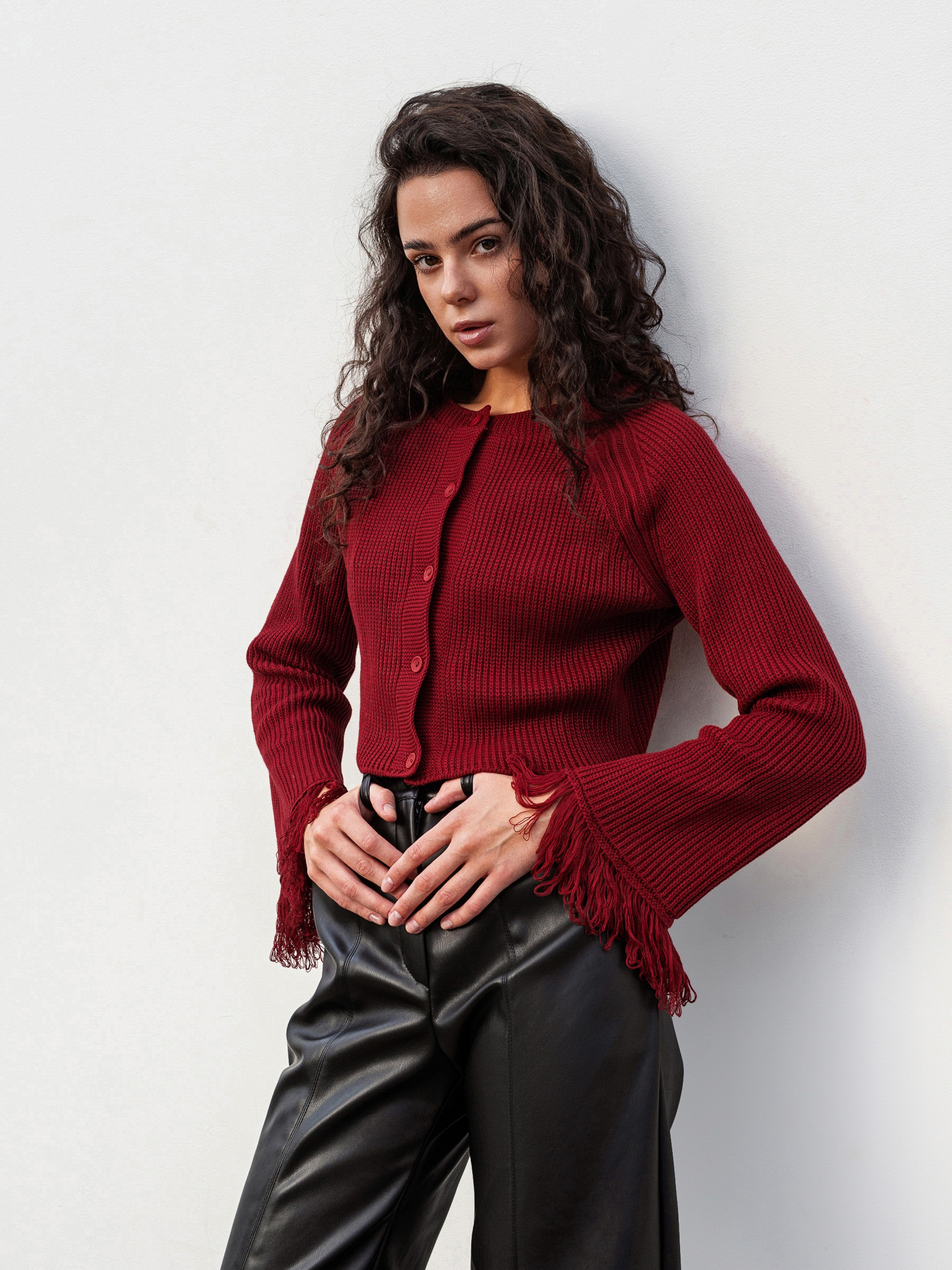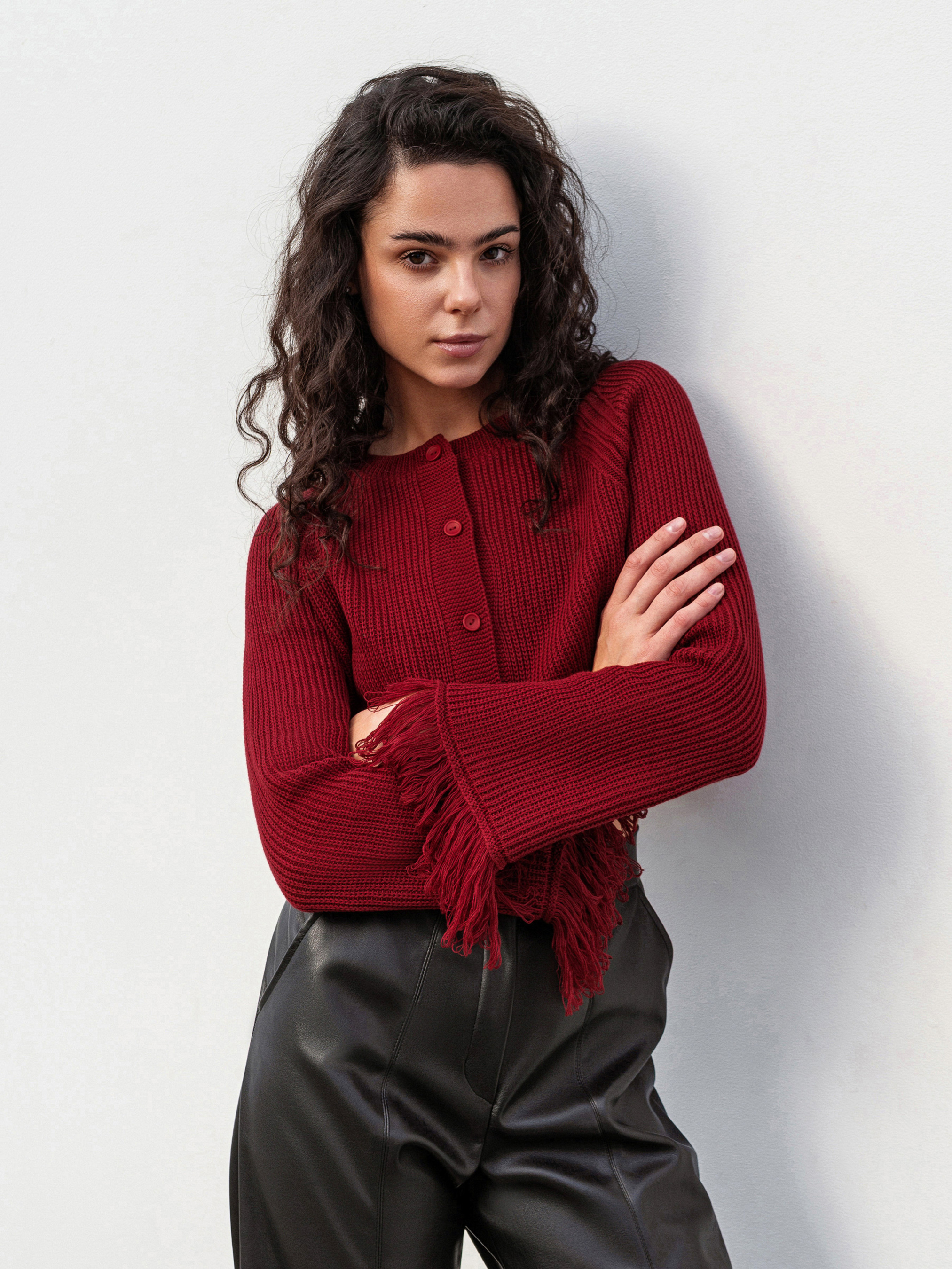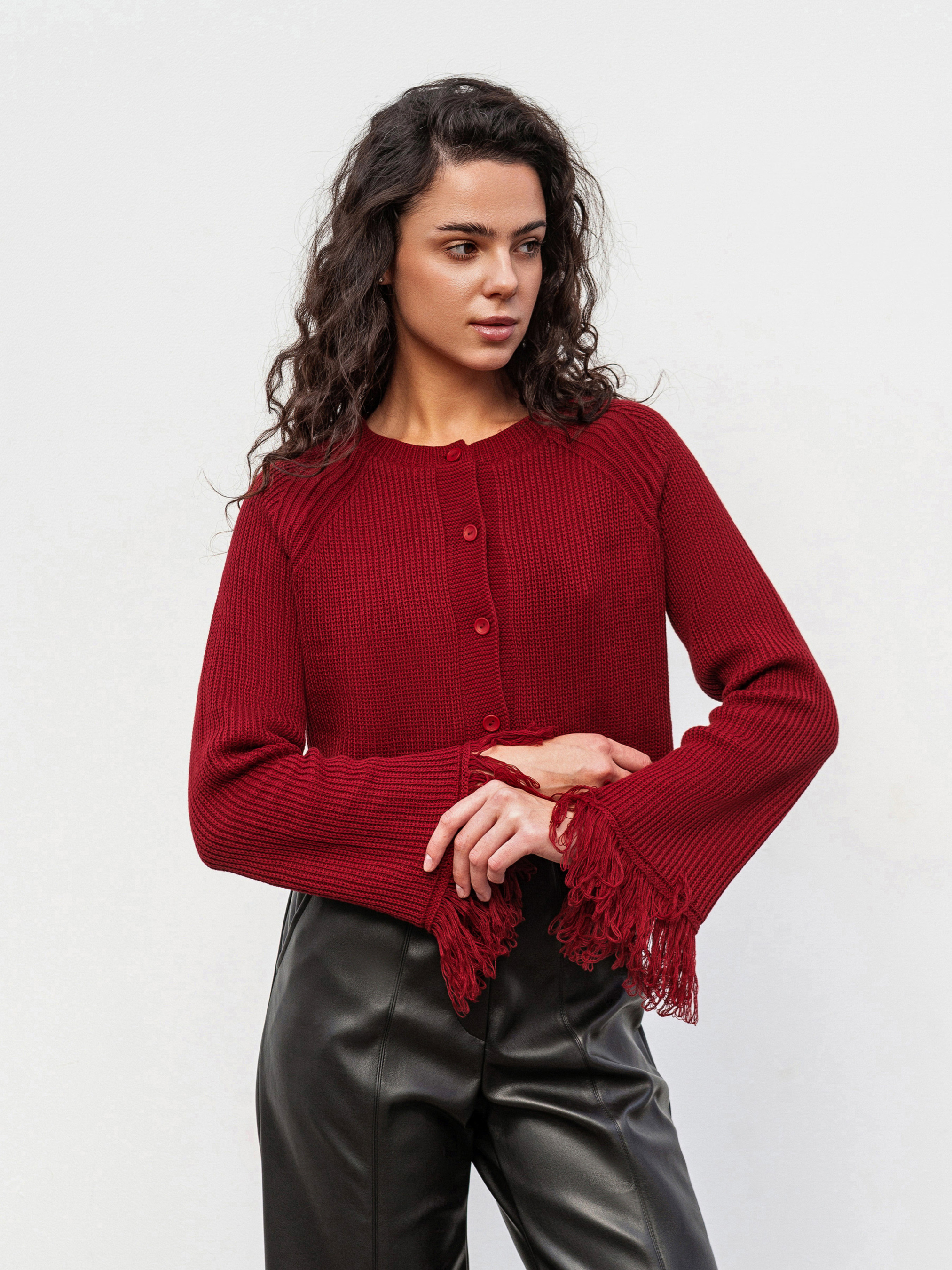 Стильный кардиган на пуговицах с бахромой, придающей образу фактурность и легкий богемный настрой. Выполнен из плотной вязки (50% хлопок, 50% акрил), он мягкий, теплый и держит форму. Модель в свободном фасоне легко комбинируется как с джинсами и базовыми топами для повседневных выходов, так и с платьями или более яркими аксессуарами для вечерних образов. Доступные цвета: молочный, бордо. С-М Длина по спине: 40 см Длина рукава: 59 см Полуобхват груди: 44 см Плечи: 46 см Полуобхват талии: 41 см М-Л Длина по спине: 41 см. Длина рукава: 59 см Полуобхват груди: 48 см Плечи: 53 см Полуобхват талии: 46 см