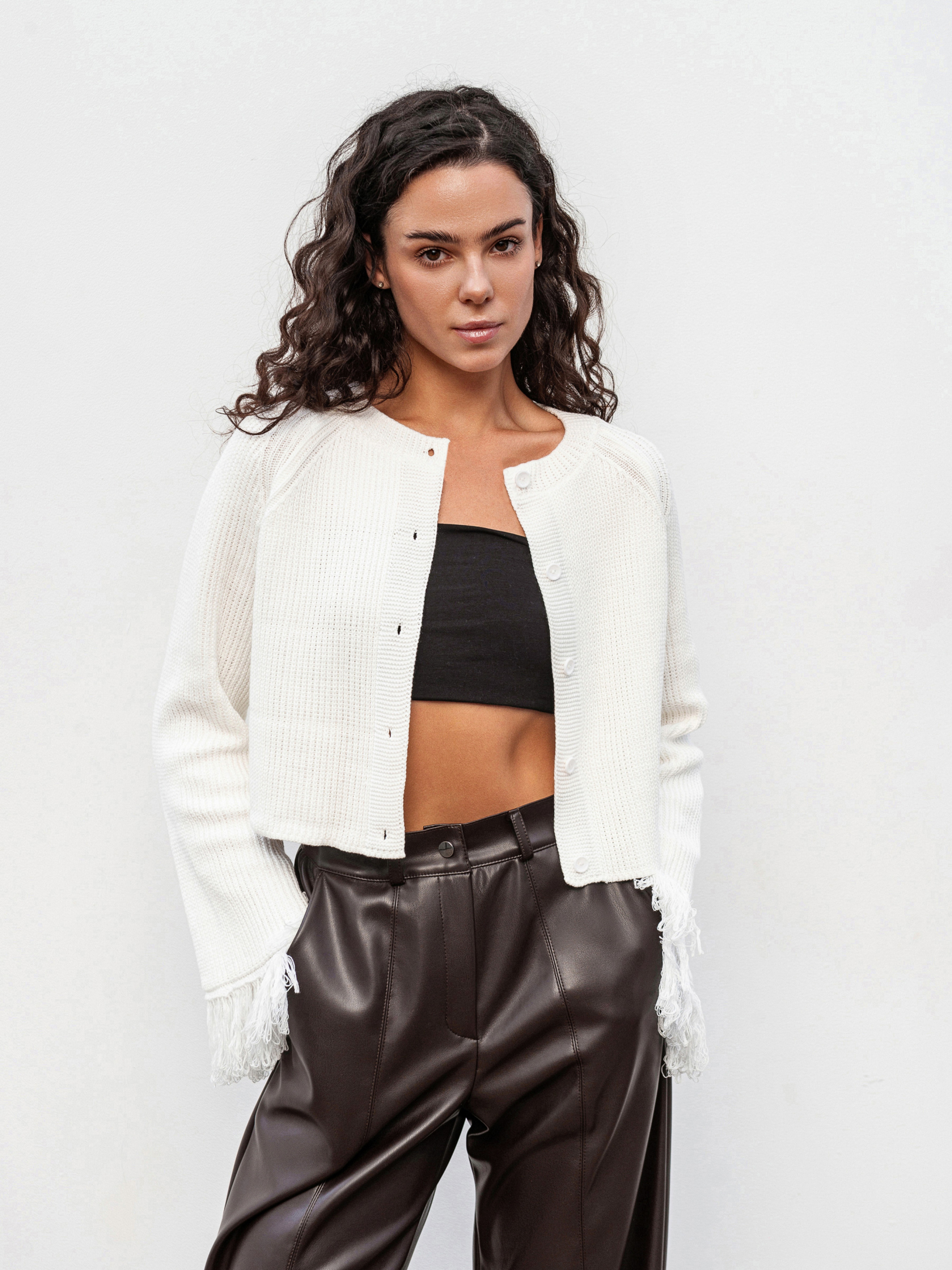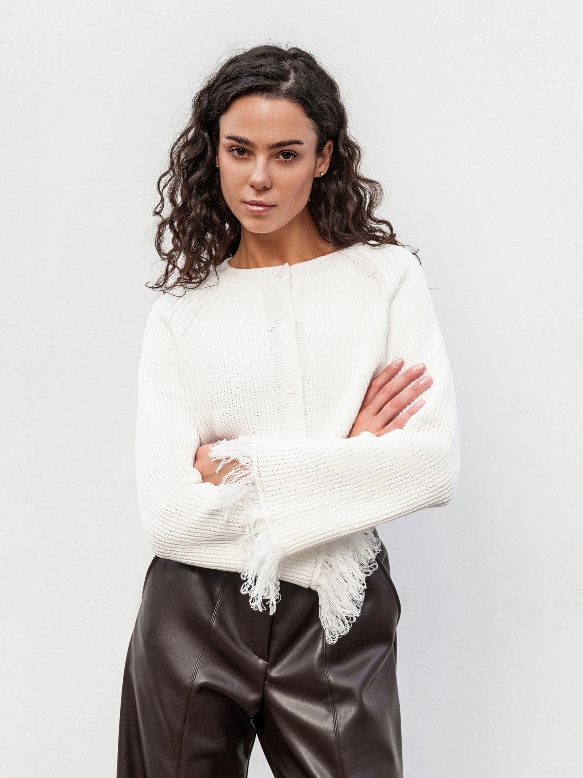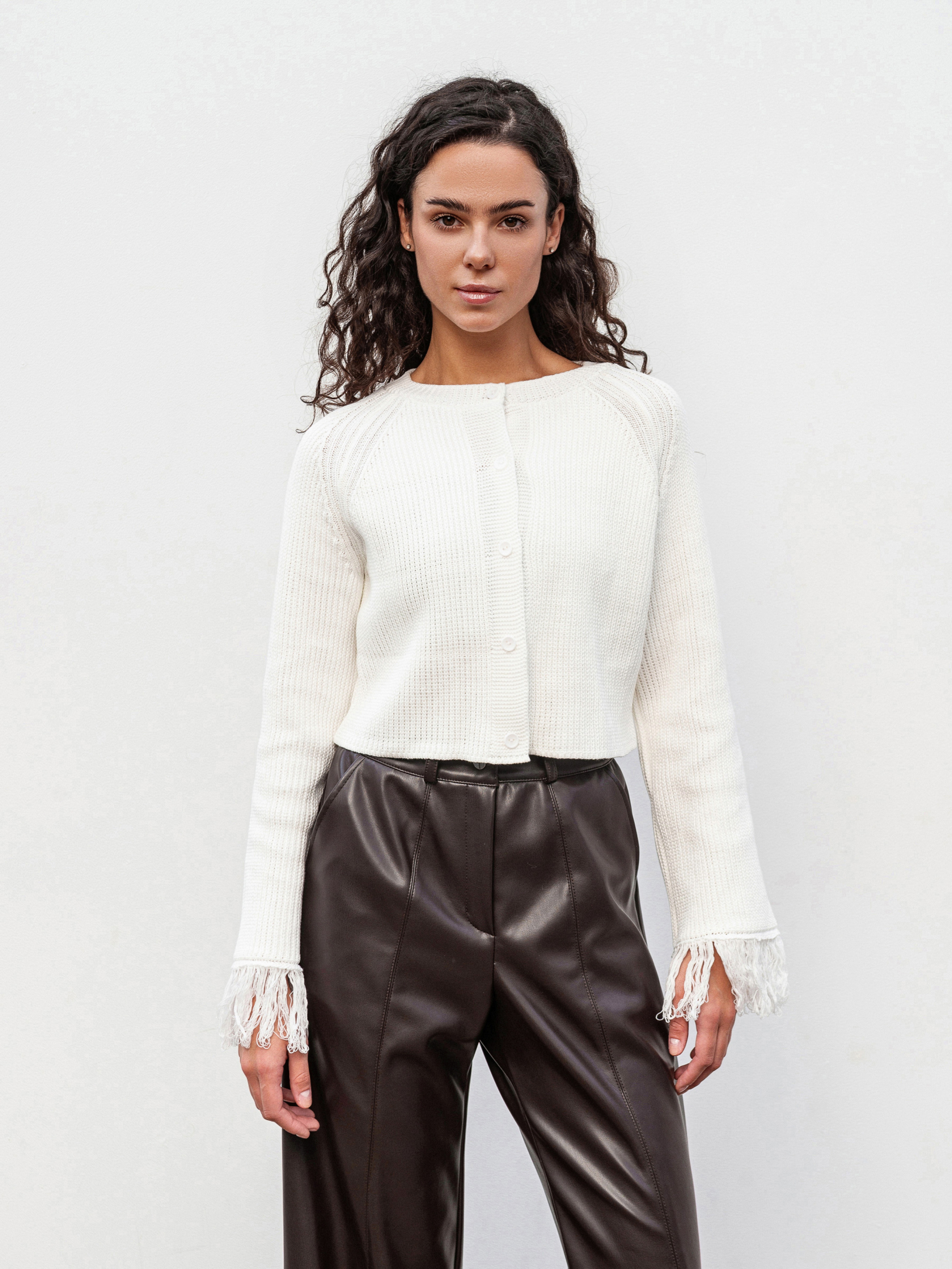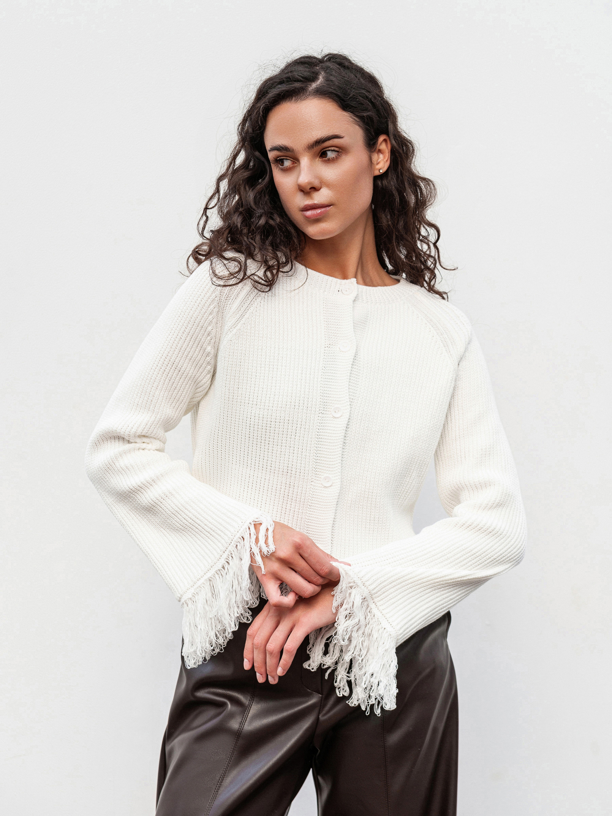 Стильный кардиган на пуговицах с бахромой, придающей образу фактурность и легкий богемный настрой. Выполнен из плотной вязки (50% хлопок, 50% акрил), он мягкий, теплый и держит форму. Модель в свободном фасоне легко комбинируется как с джинсами и базовыми топами для повседневных выходов, так и с платьями или более яркими аксессуарами для вечерних образов. Доступные цвета: молочный, бордо. С-М Длина по спине: 40 см Длина рукава: 59 см Полуобхват груди: 44 см Плечи: 46 см Полуобхват талии: 41 см М-Л Длина по спине: 41 см. Длина рукава: 59 см Полуобхват груди: 48 см Плечи: 53 см Полуобхват талии: 46 см