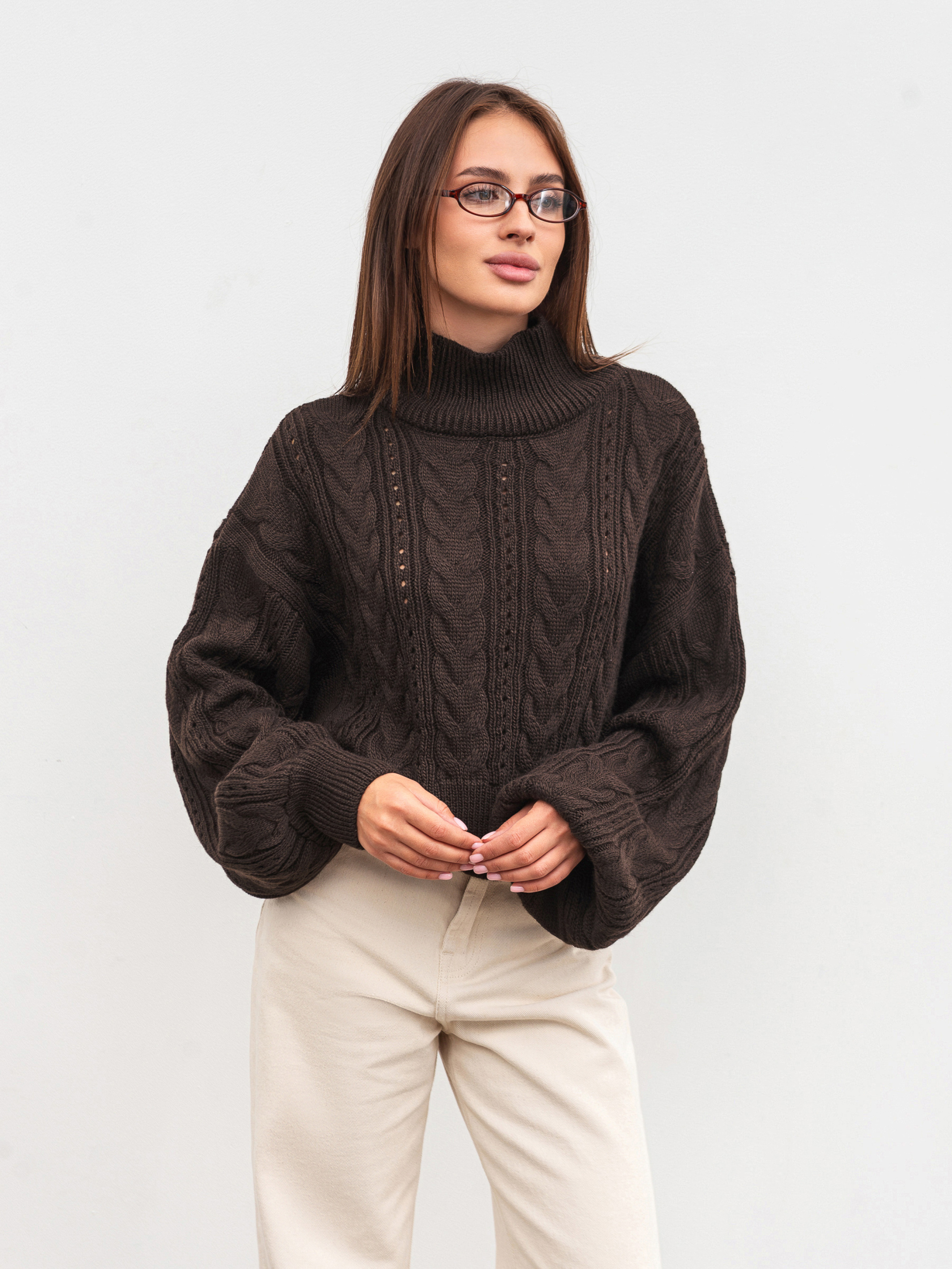Уютный, укороченный свитер из плотной вязки. Свитер имеет вязку косичку и стойку горловины. Рукава-фонарики зауживаются ближе к плечам и имеют манжеты. Состав: 60% акрил, 20% шерсть, 20% полиамид. Модель идеально сочетается с различными брюками и юбками. Зимой свитер можно комбинировать с аксессуарами по типу перчаток, шапки и тому подобное. Длина по спине: 47 см Длина рукава: 49 см Полуобхват груди: 59 см Плечи: 61 см
