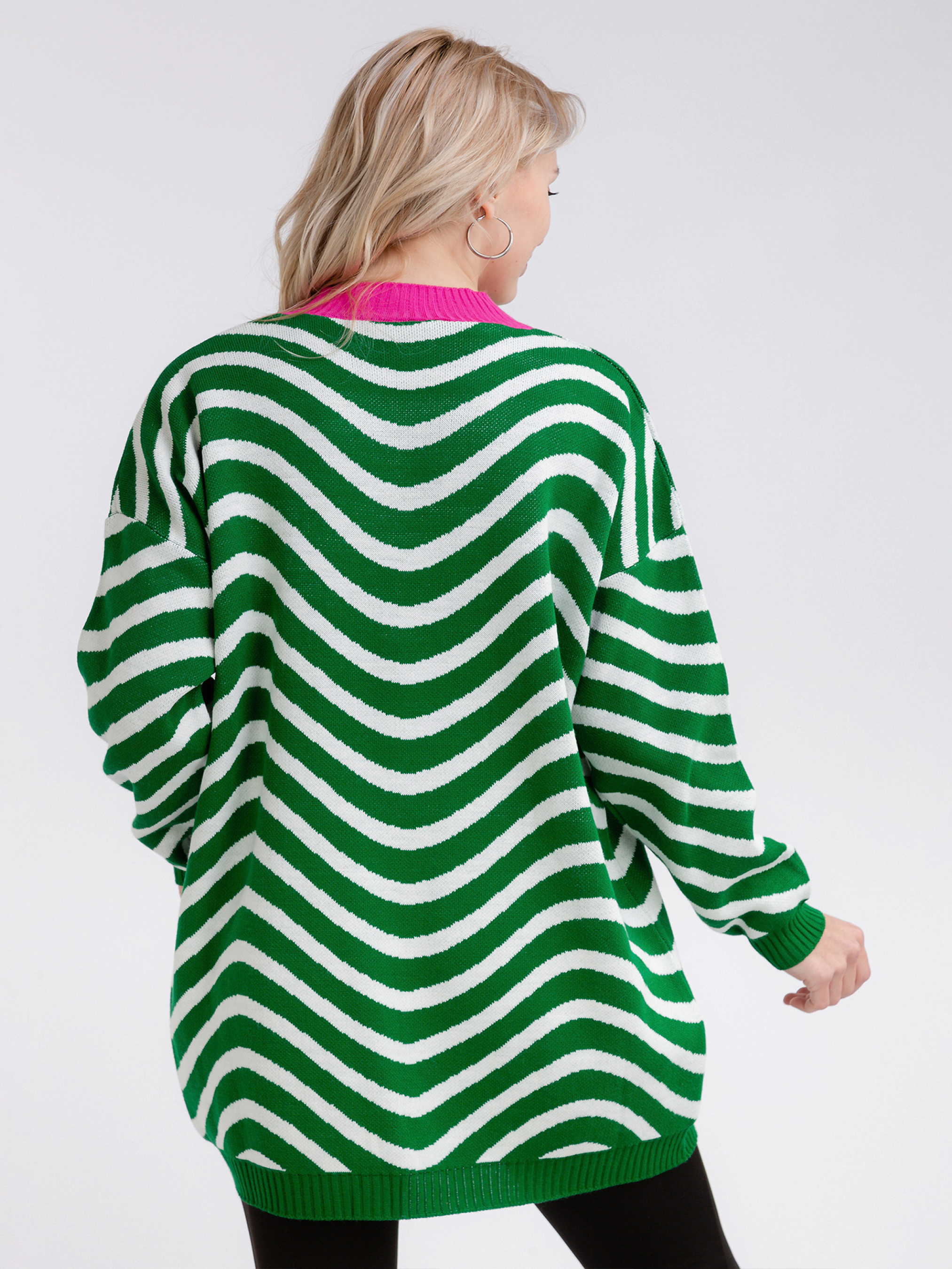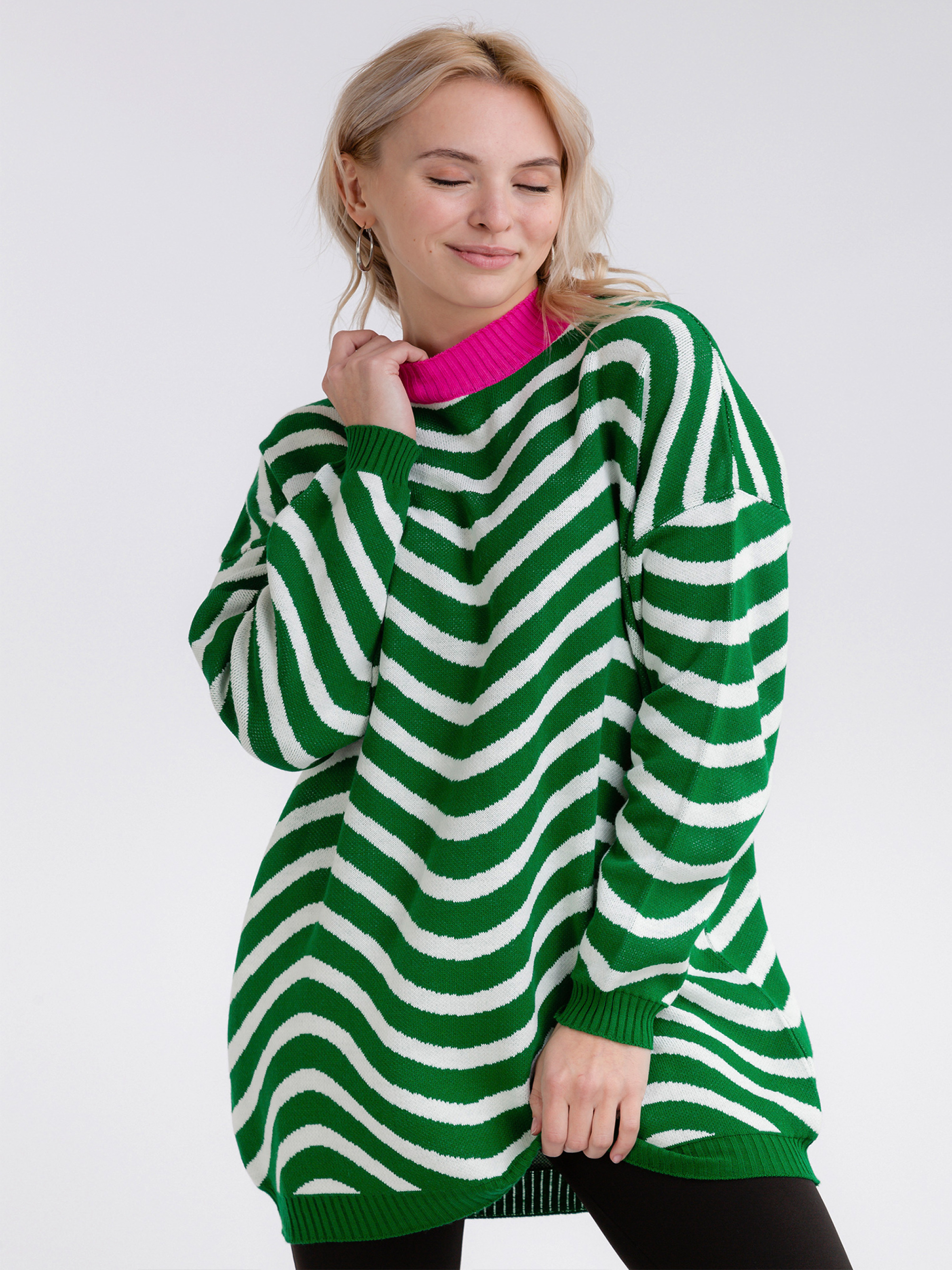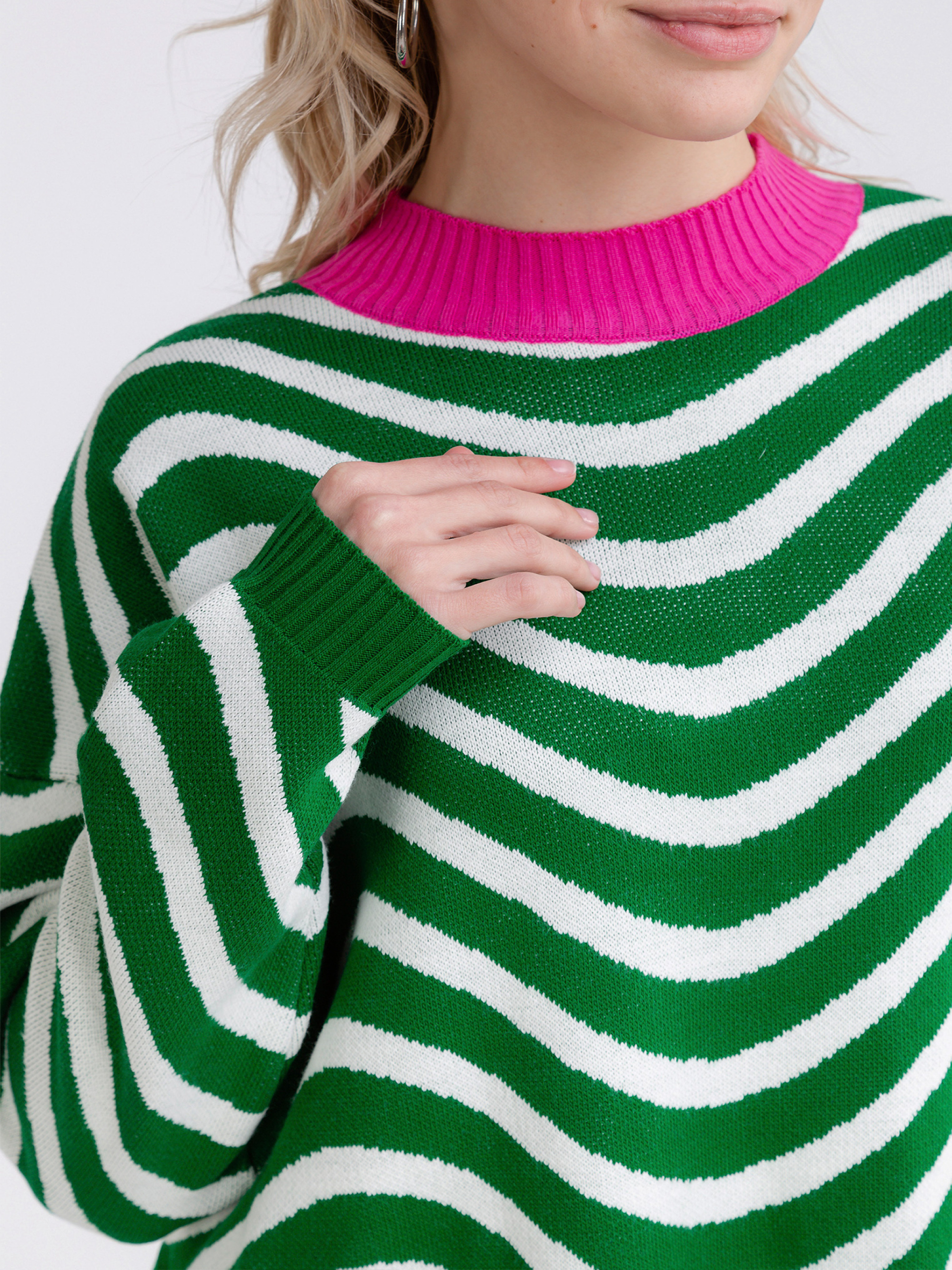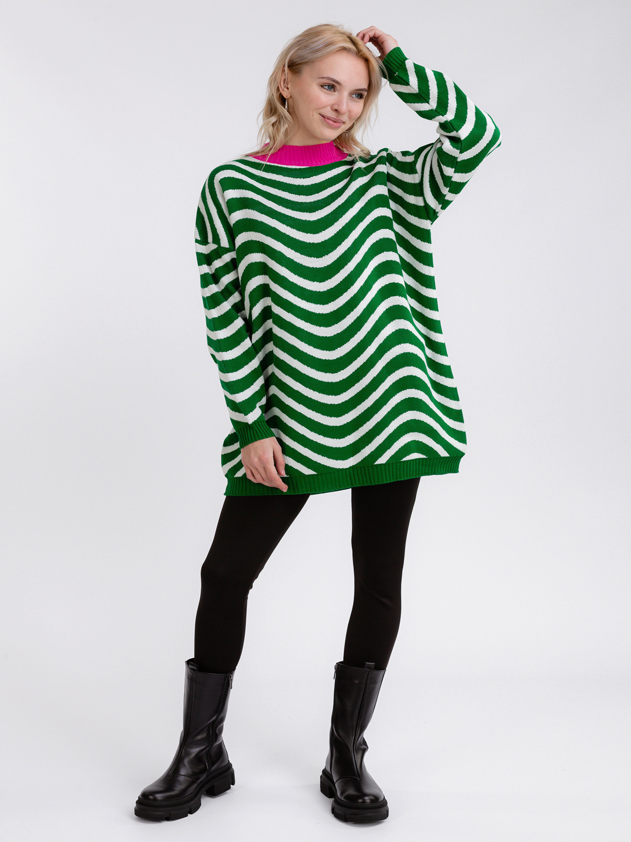 Свитер свободного фасона. Актуальная комбинация цветов внесёт разнообразие и яркий акцент в базовый гардероб. Плечевой шов спущен. One size: длина по спине от горла 75 см, длина рукава от горла 69 см, длина рукава от спущенного шва 46 см, ширина плеч 63 см, полуобхват груди 58-63+.