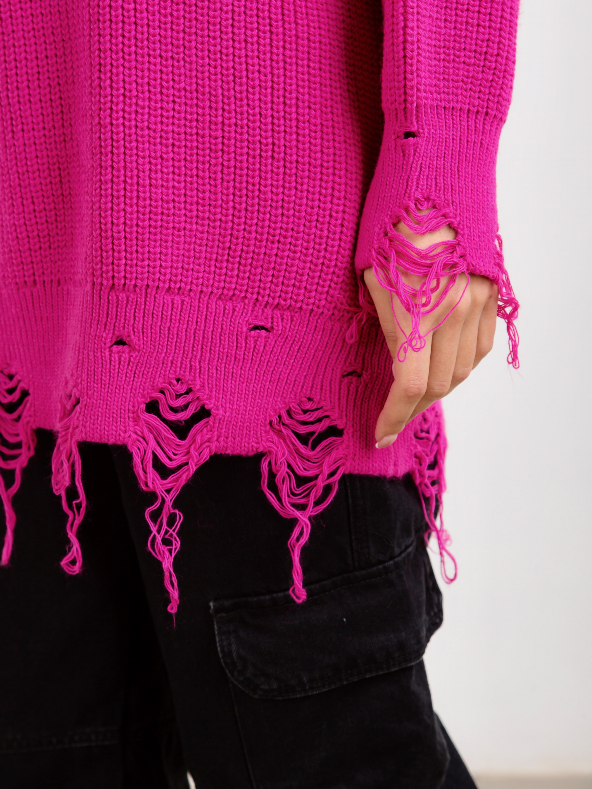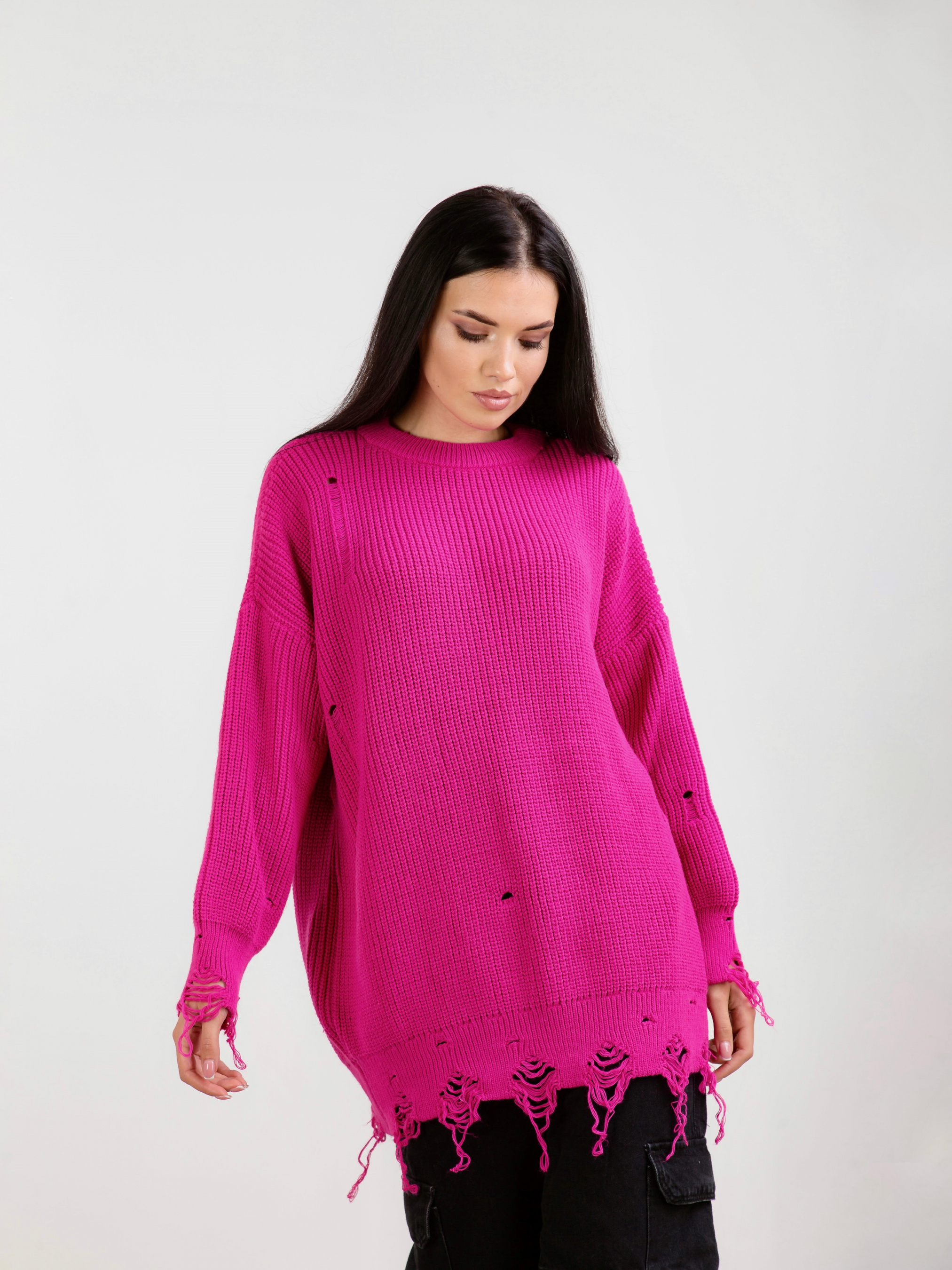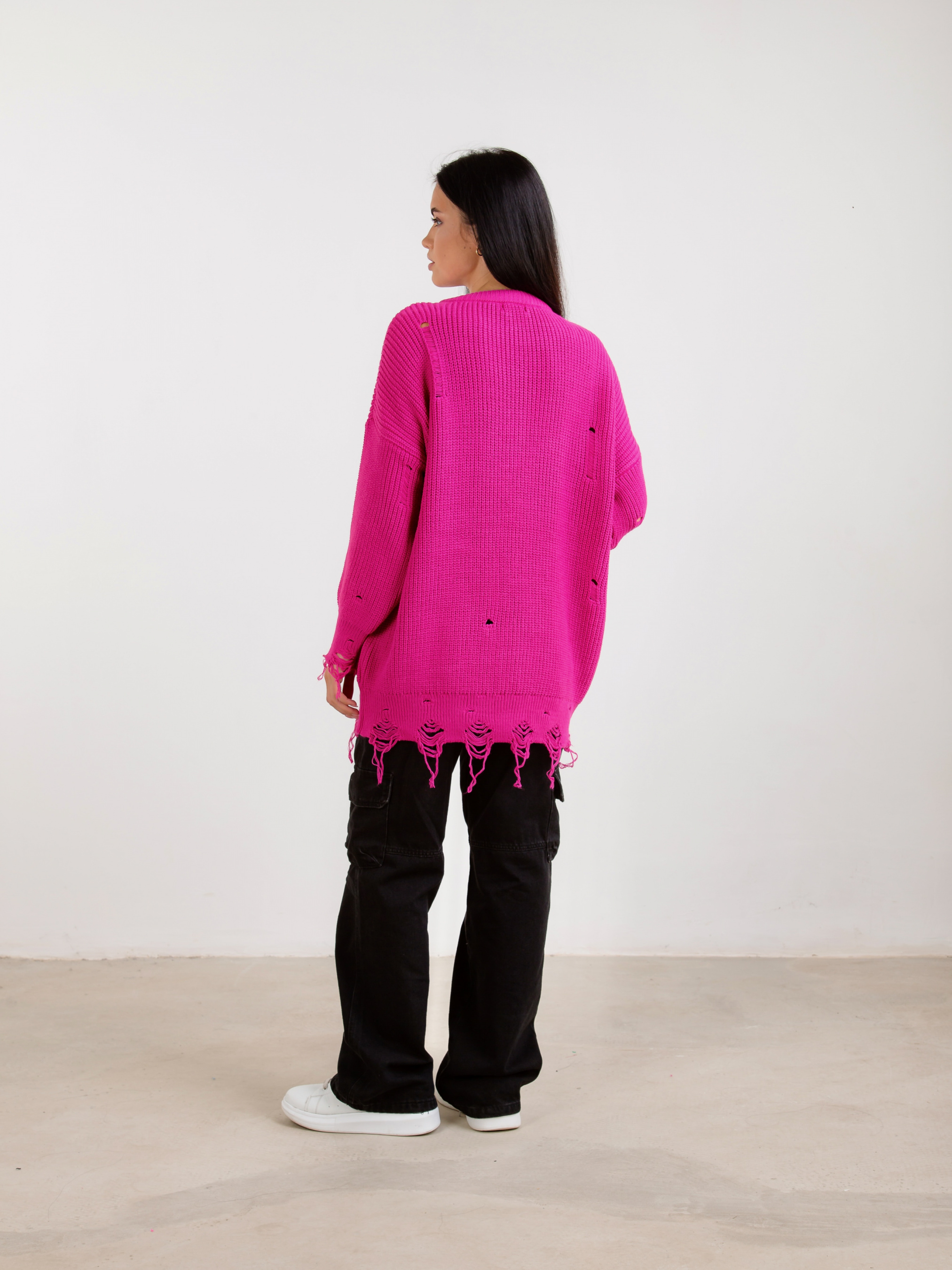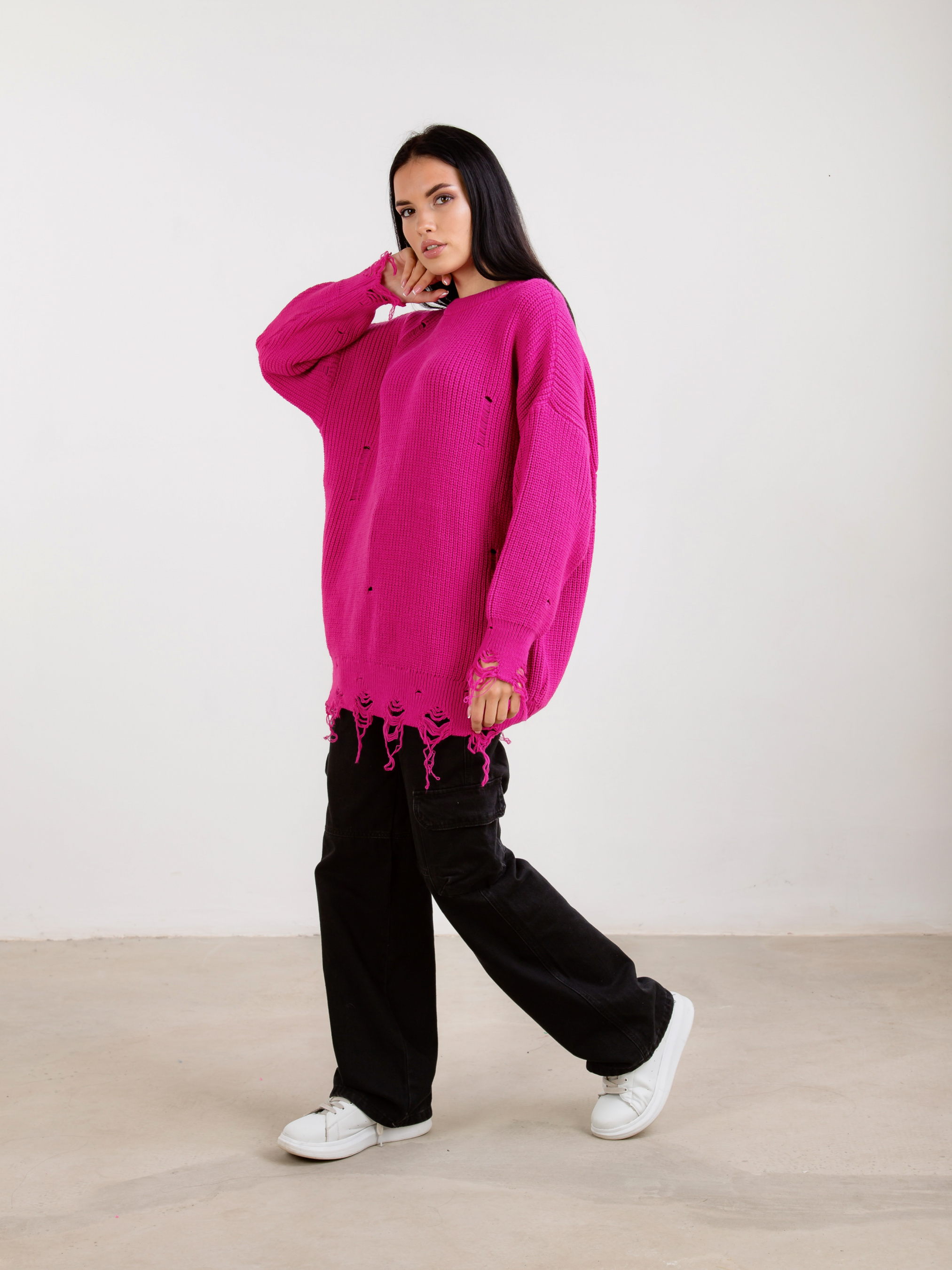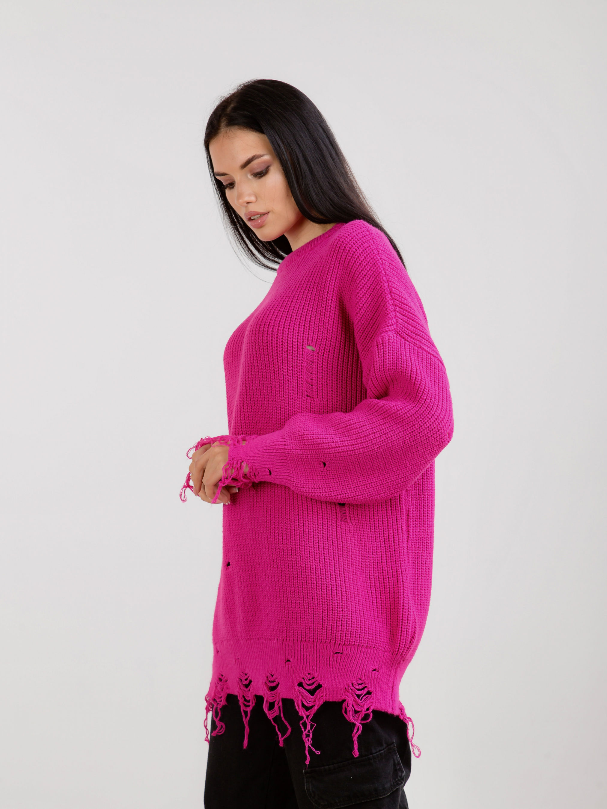Свитер "Виргиния". Стильный свитер в фасоне оверсайз. Дополнительные элементы рваности, которые станут акцентом. Внизу также необработанный край. Комбинировать можно с брюками, джинсами. В качестве аксесуара подойдут тонкие укращения на шею.