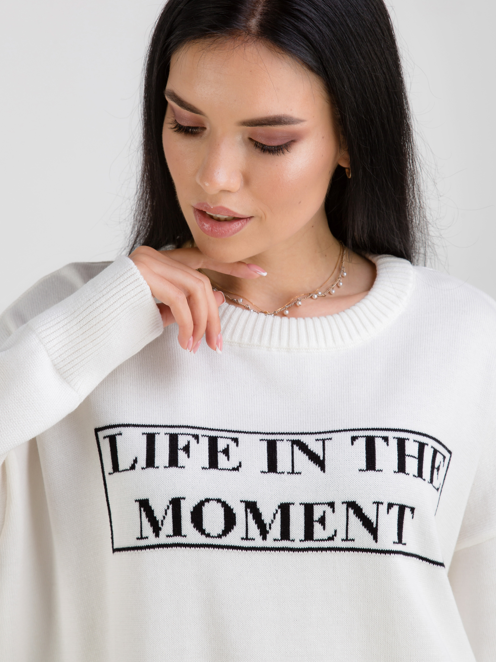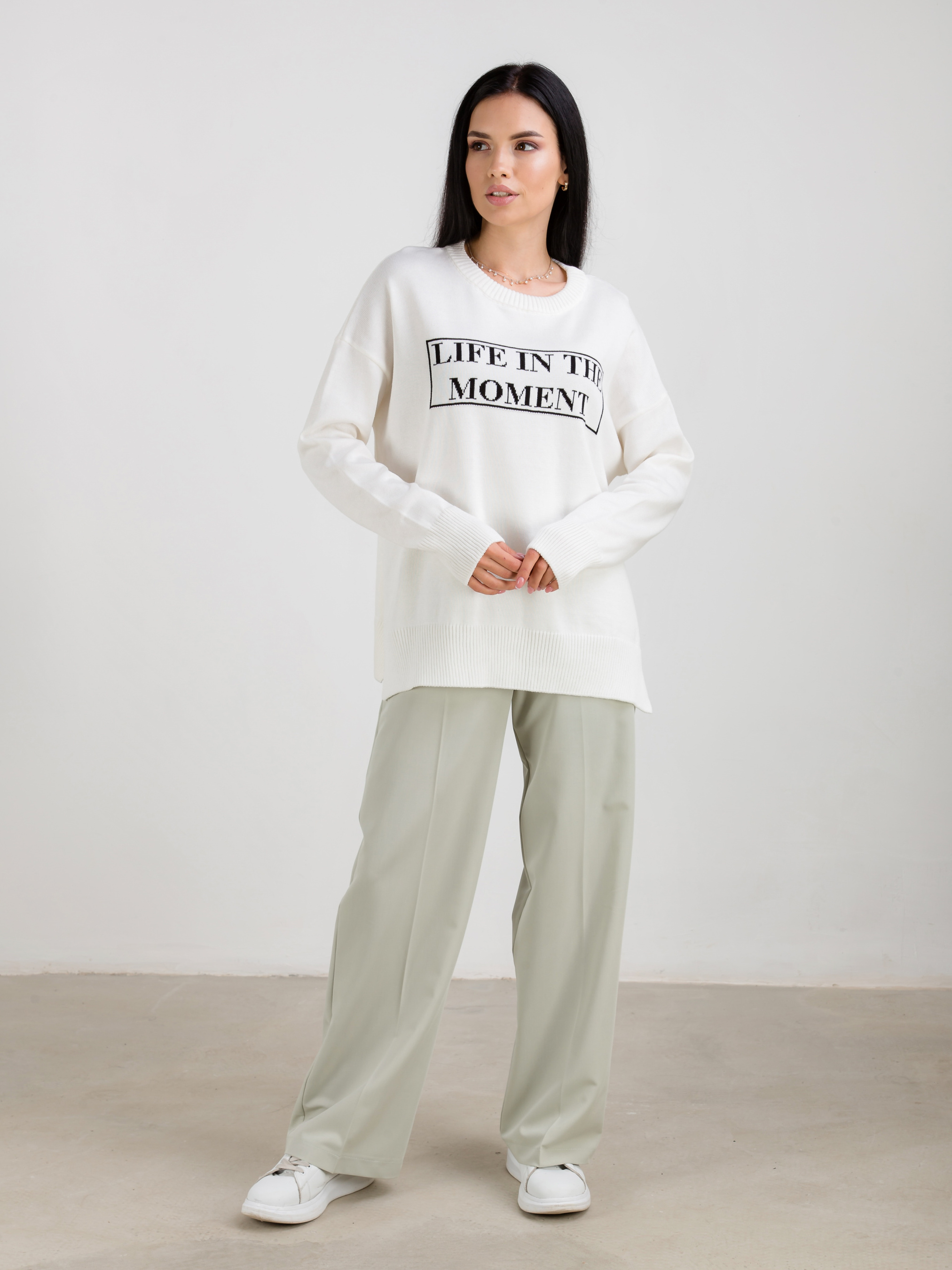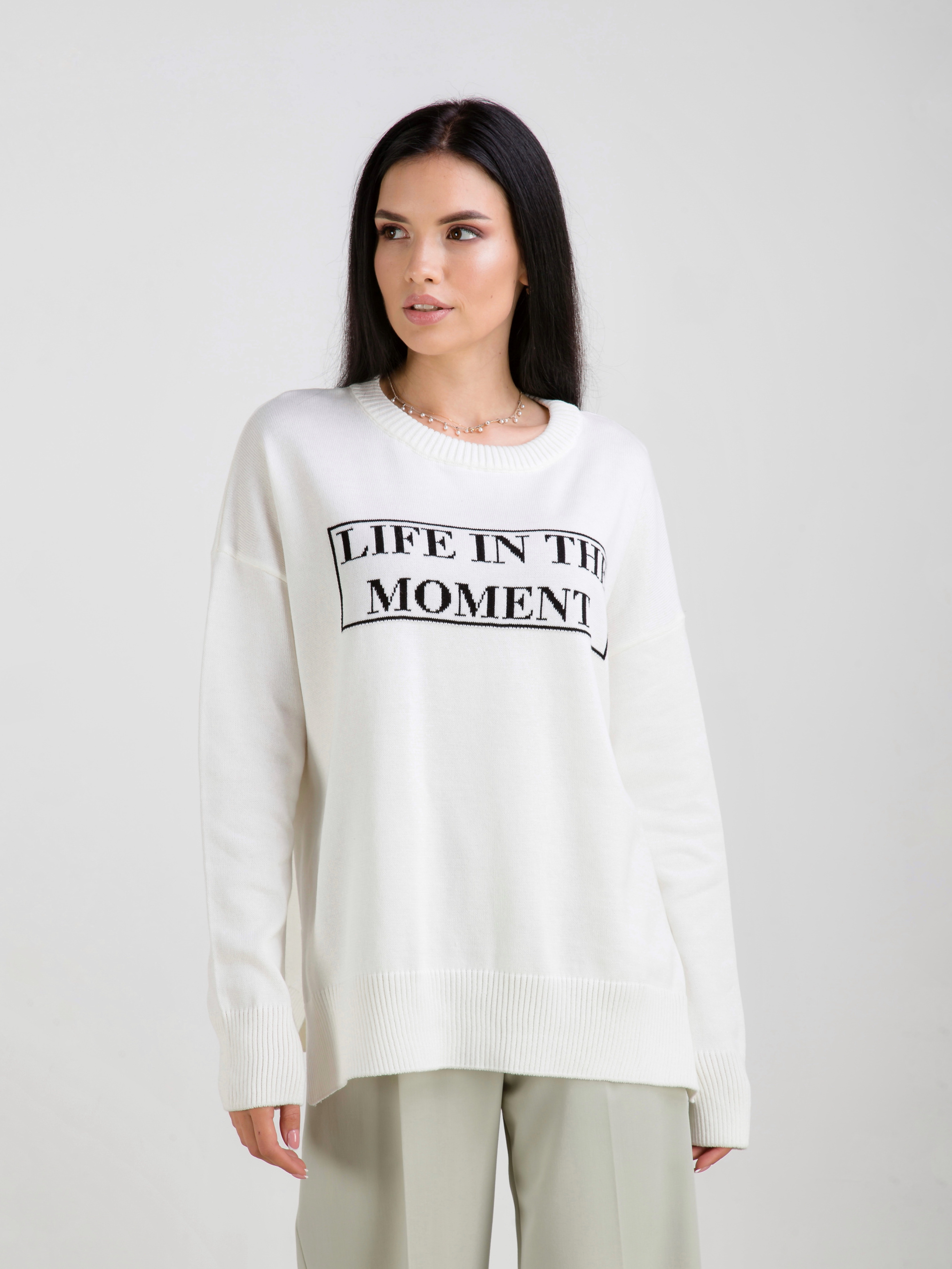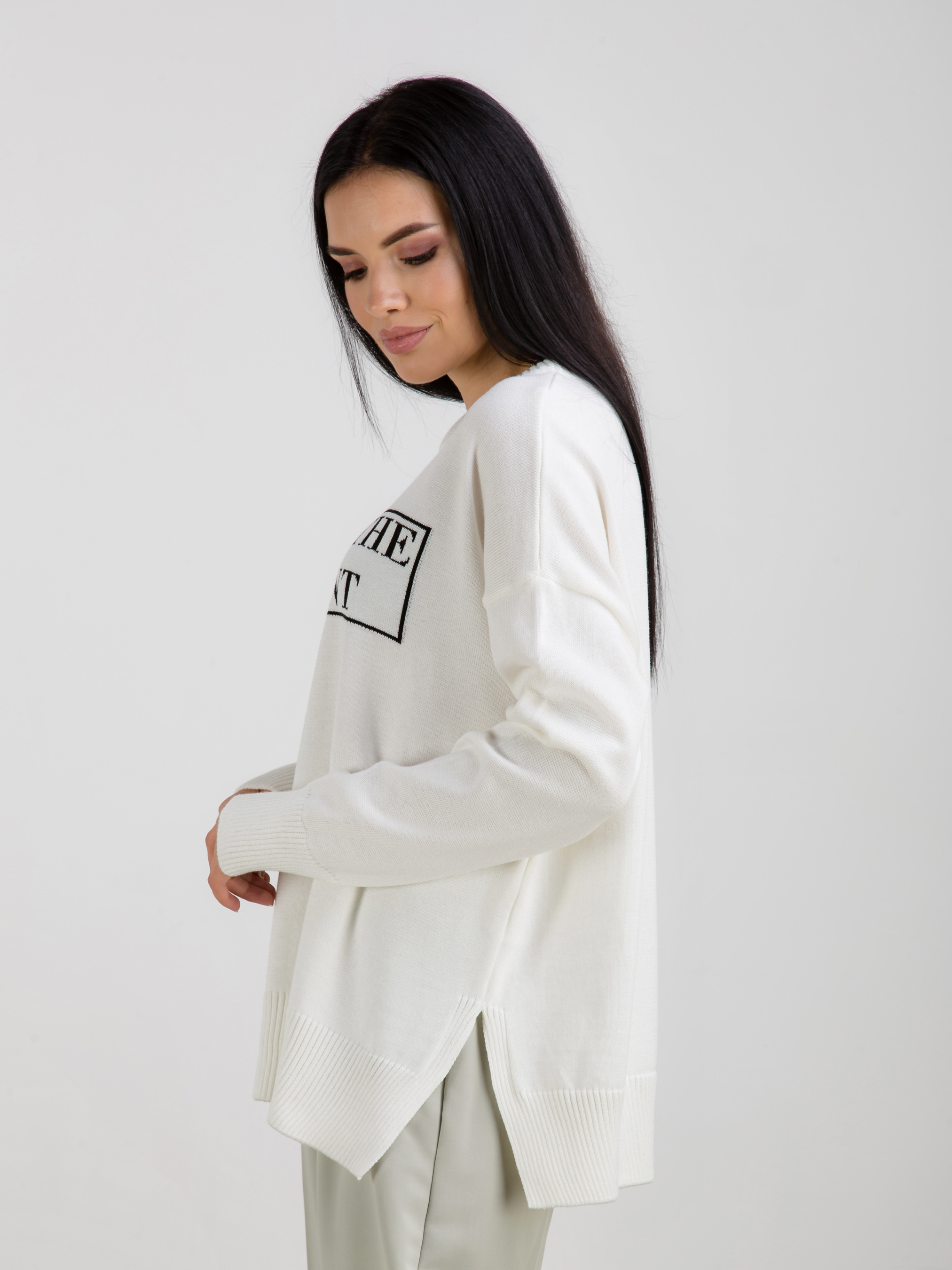Свитер свободного фасона с интересным принтом. Приятный к телу хлопковый материал. Прозводитель: Украина. Эта модель отлично подойдет под любой базовый низ. В качестве аксесуаров можно выбрать темные очки, каркасную сумку и набор из колец.