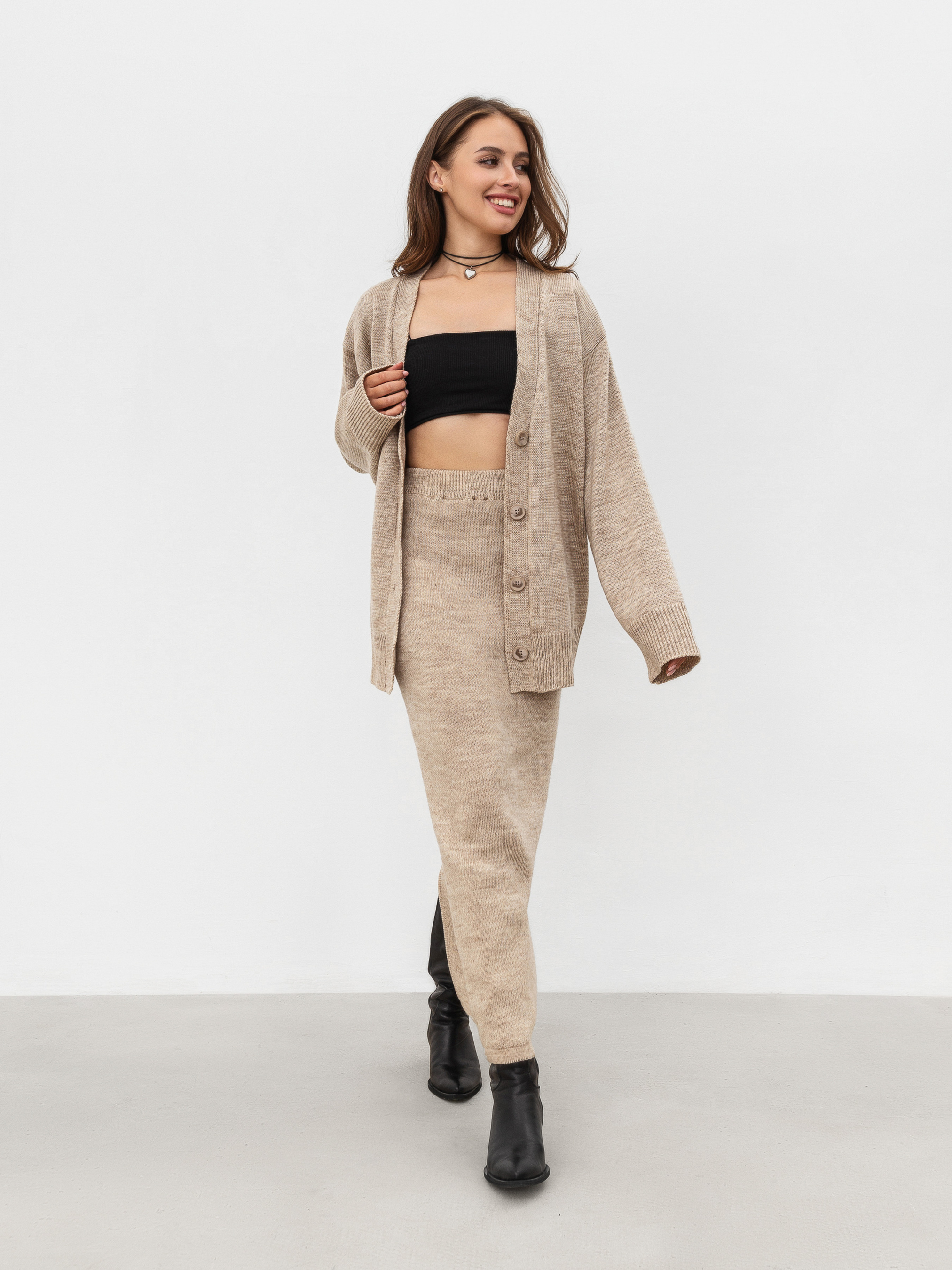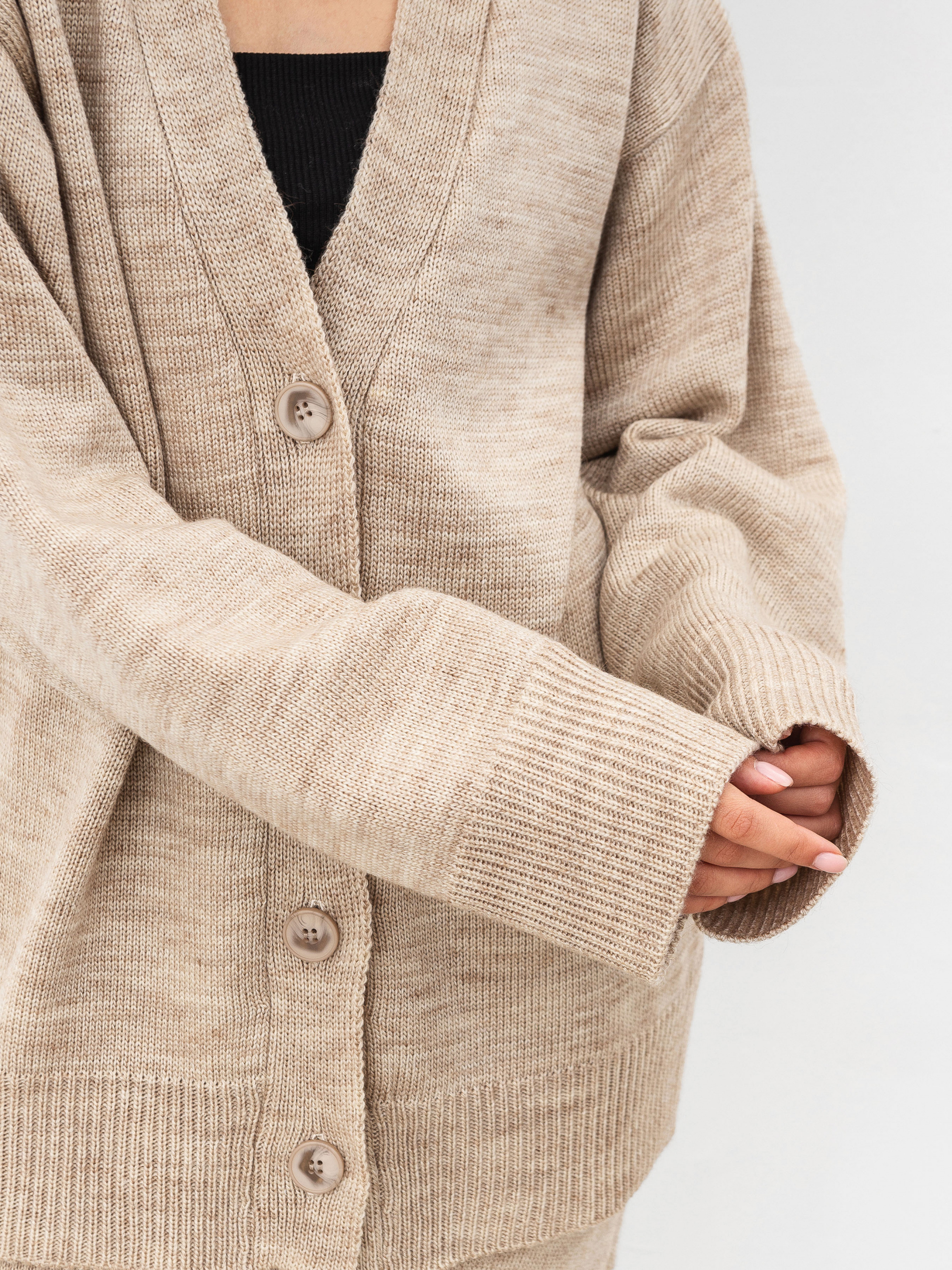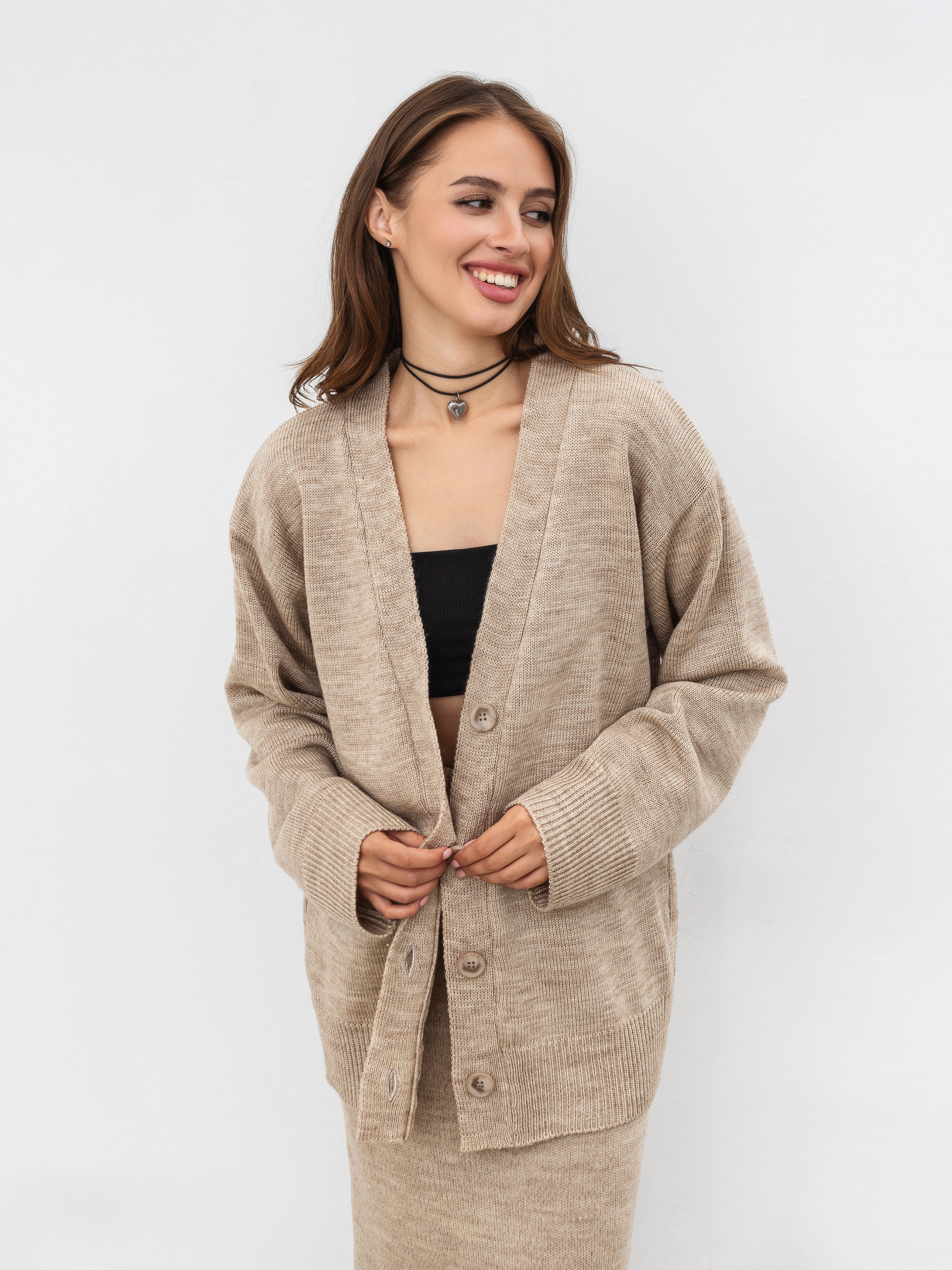 Удлиненный кардиган свободного фасона. Изготовлен из плотной теплой пряжи, 20% шерсти, подходит для носки зимой. К комплекту можно взять юбку Кавентри.