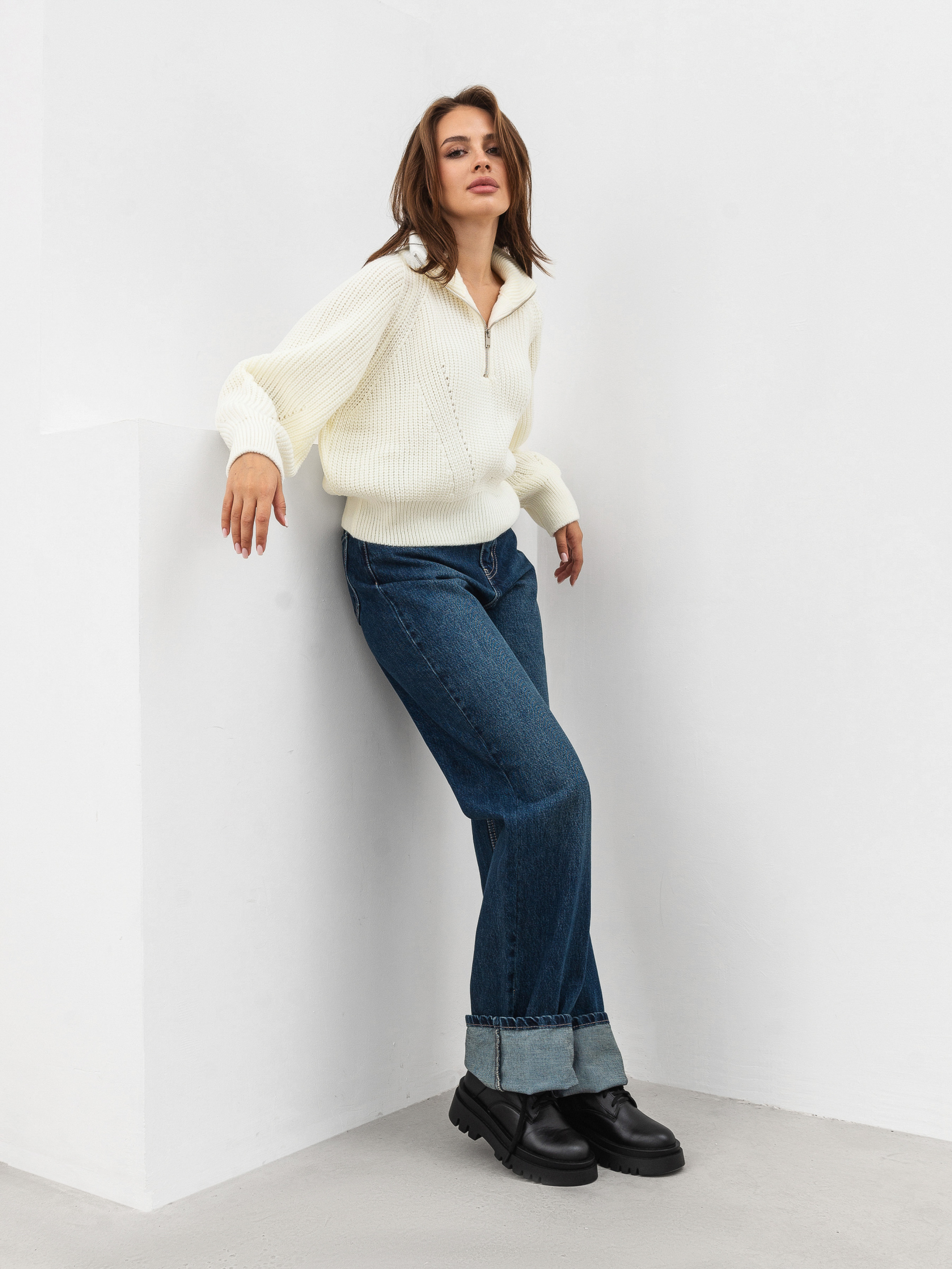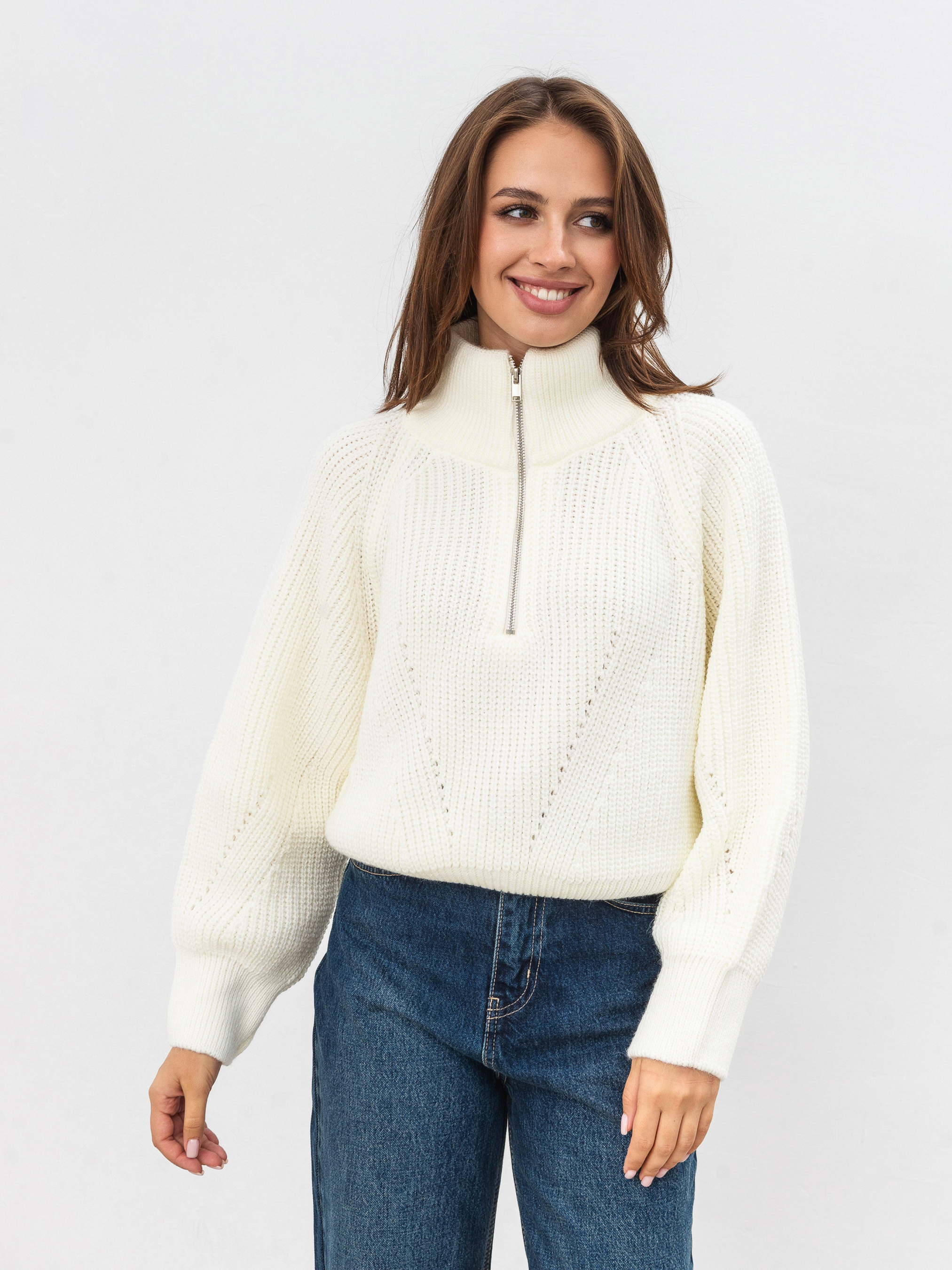 Трендовый укороченный свитер на холодную погоду. Модель свободного силуэта имеет застежку-молнию в серебряном никеле. Объемные рукавчики зауживаются ближе к манжету. Плотная и теплая вязка комфортно ощущается на теле. Уютный свитер можно комбинировать с различным низом классического или повседневного стиля. Длина по спине 48 см, длина рукава 60 см, полуобхват груди 56 см, плечи 46 см, полуобхват талии: 42 см