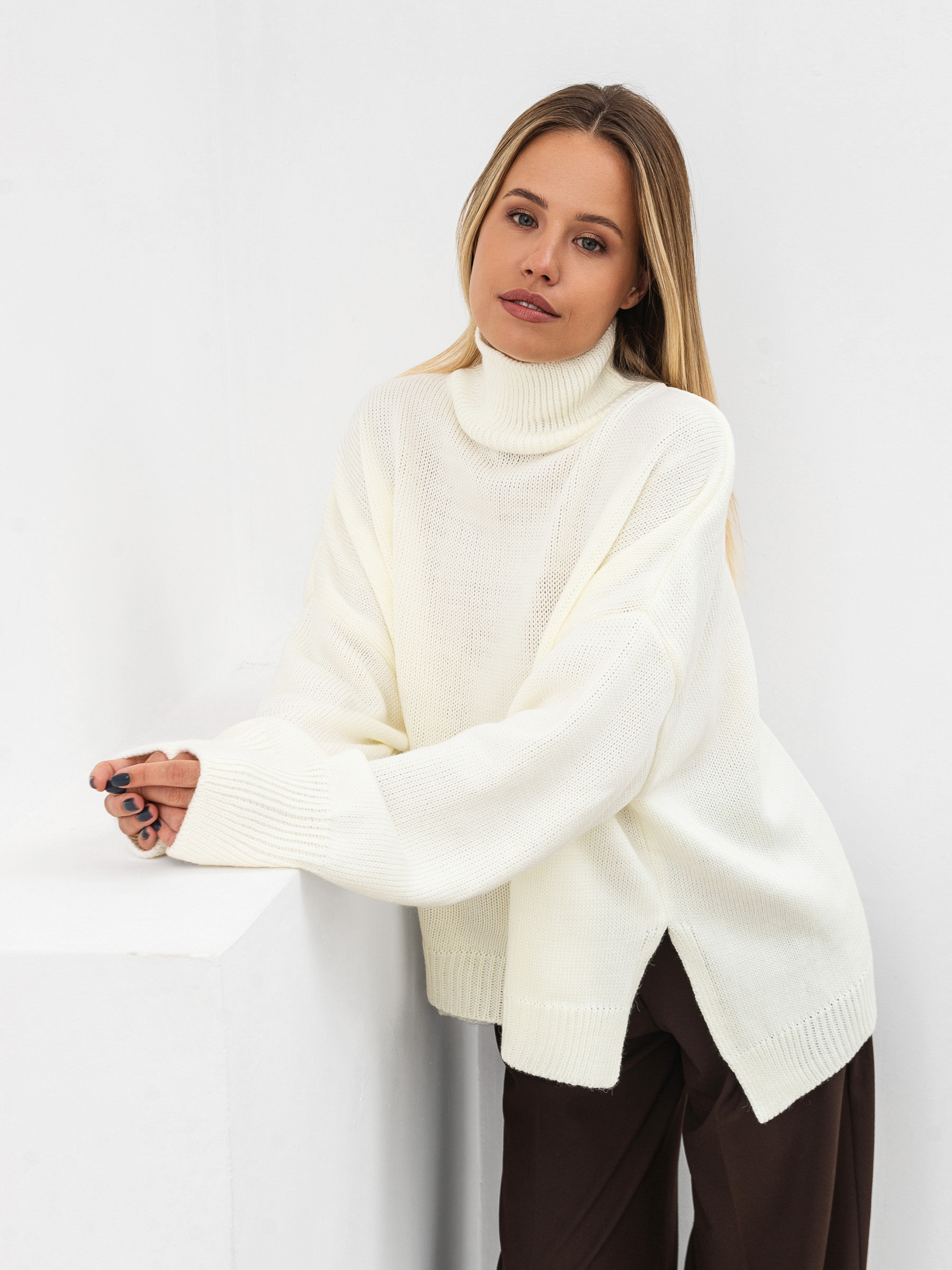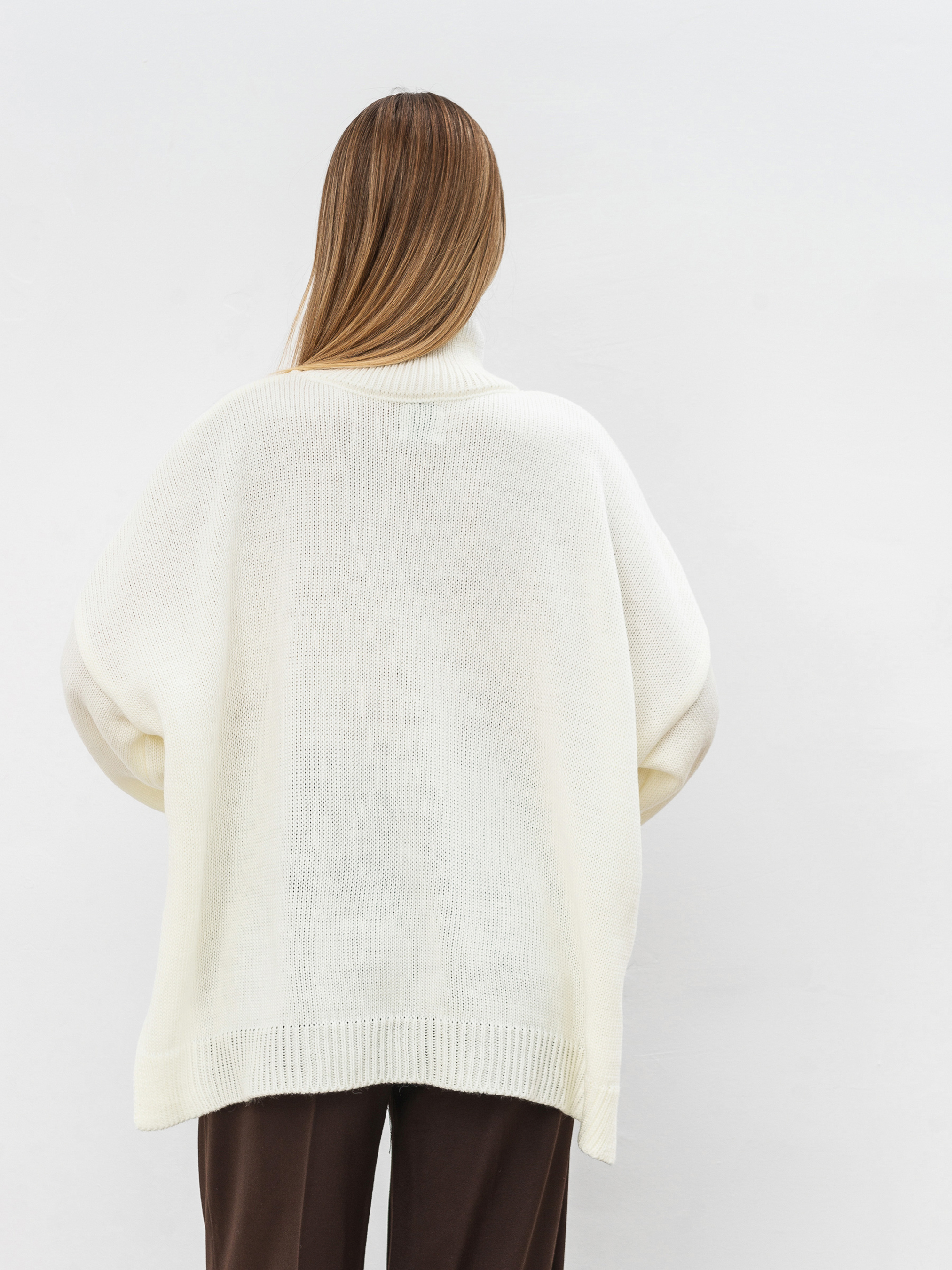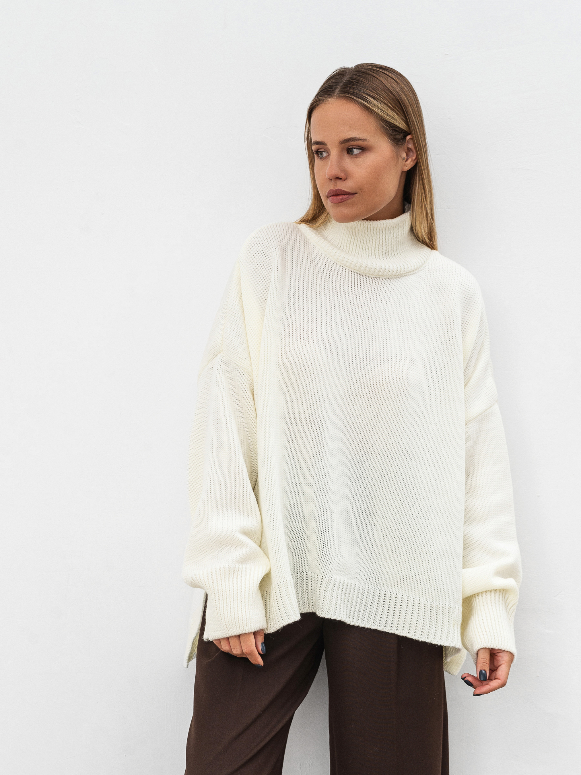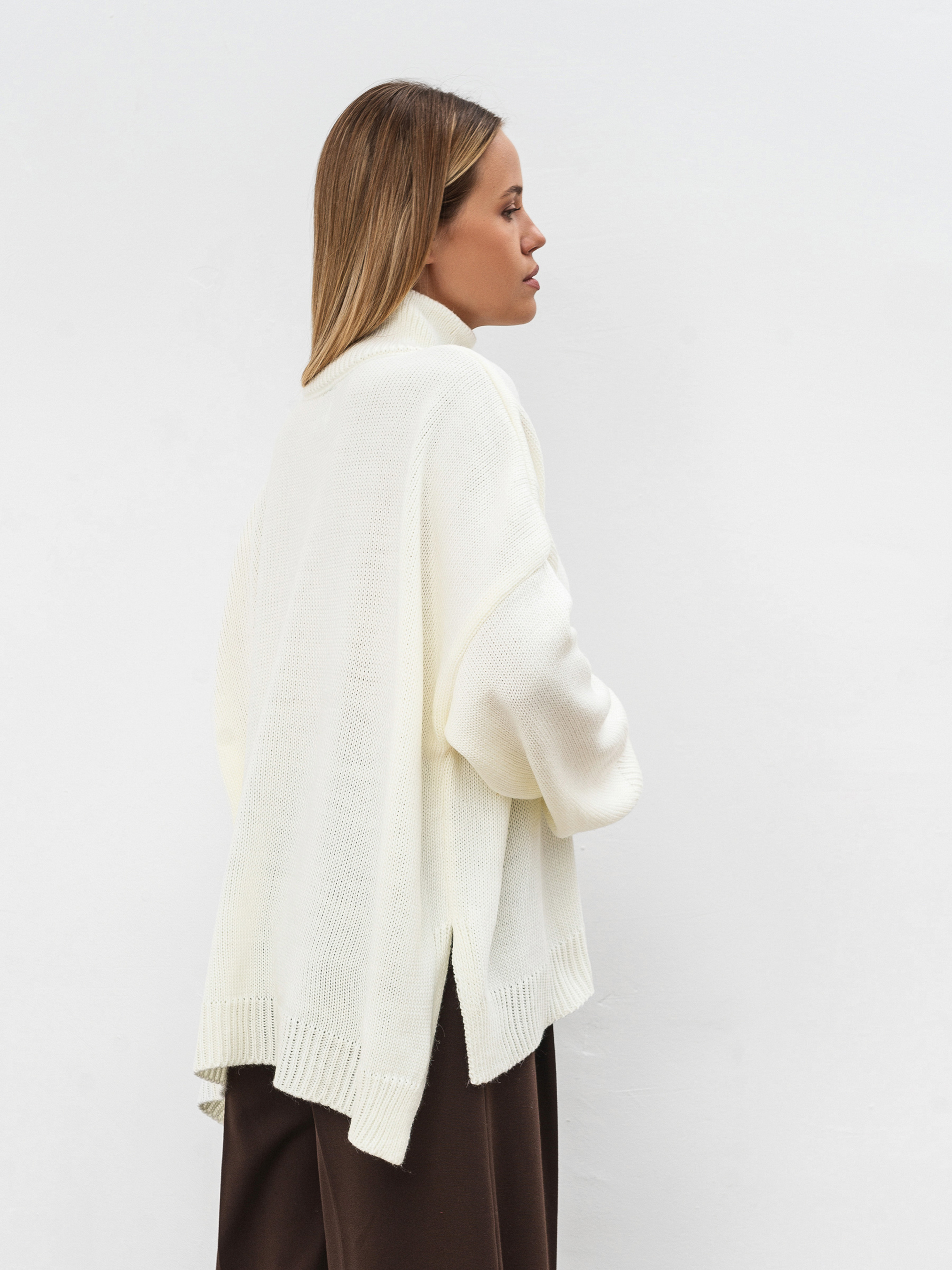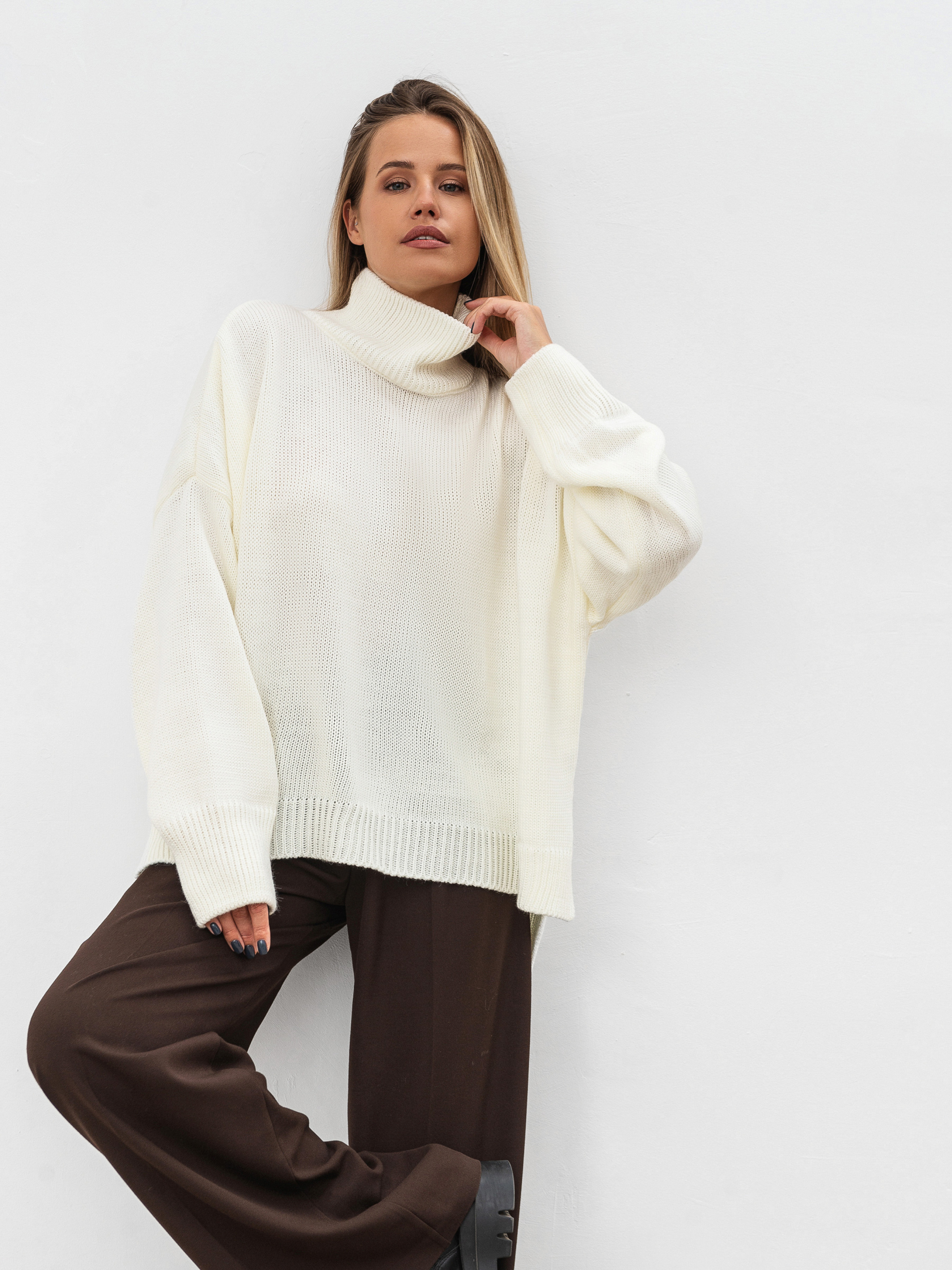 Трендовый свитер свободного фасона с высокой горловиной. Модель имеет широкие рукавчики, стойку горловины и спущенный плечевой шов. Теплый и уютный вариант для повседневных образов. Комбинировать советуем с юбками или классическими брюками, а дополнить пальто и высокими сапожками. Такие луки идеально подойдут для прогулок и рабочих будней. Длина по спине: 60 см Длина рукава: 43 см Полуобхват груди: 73 см Плечи: 74 см
