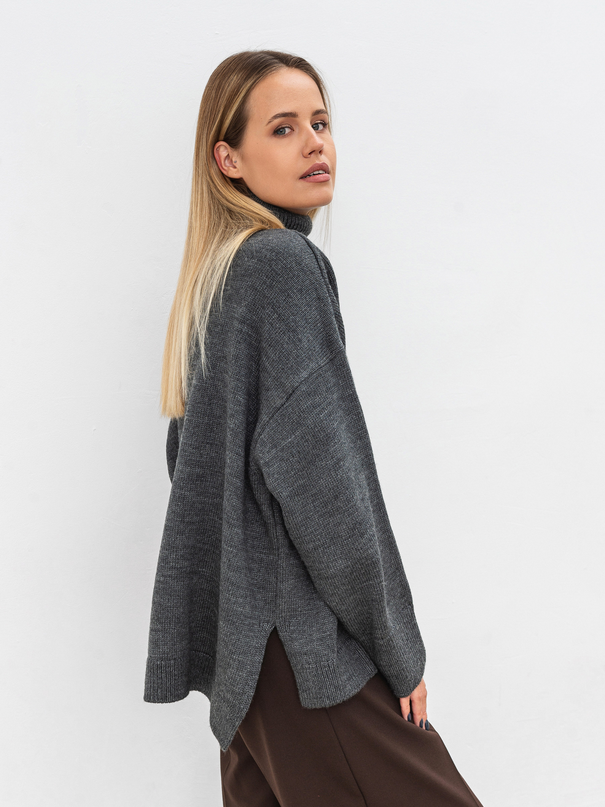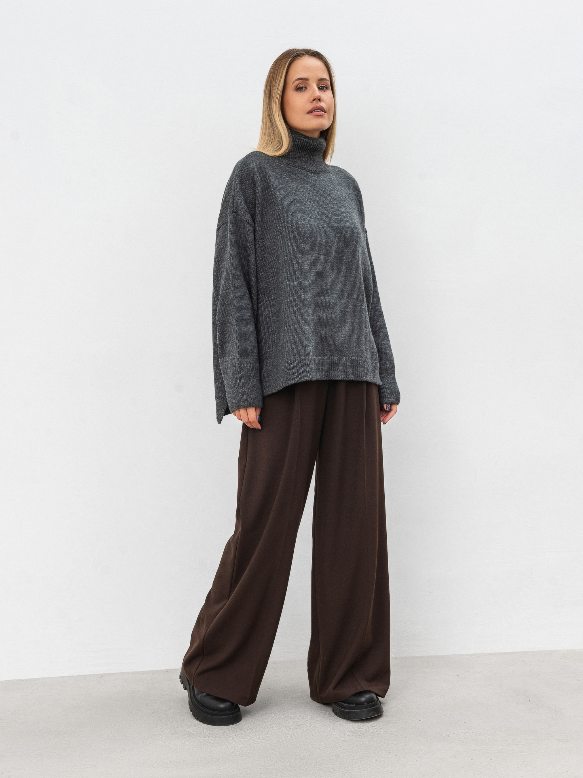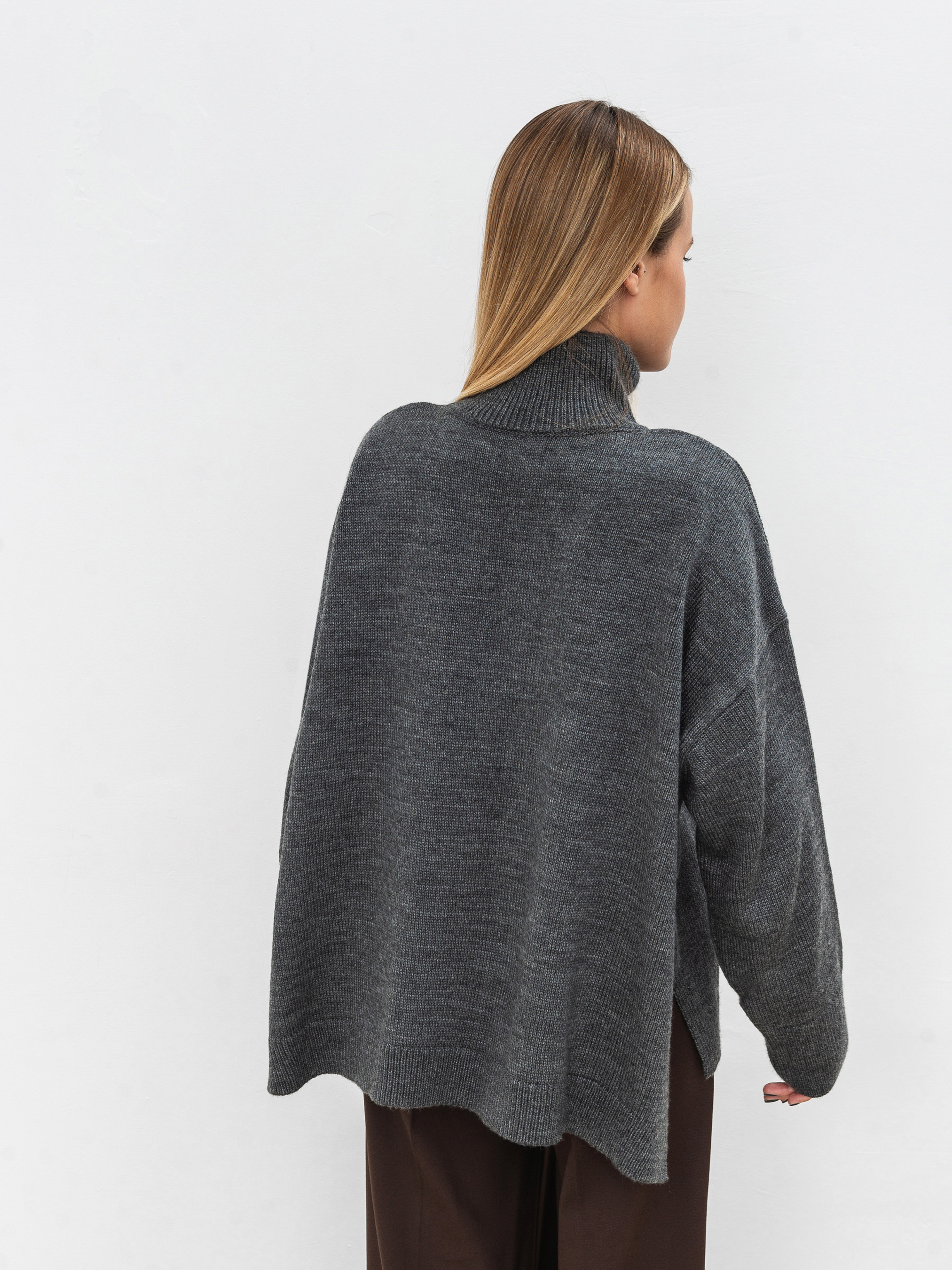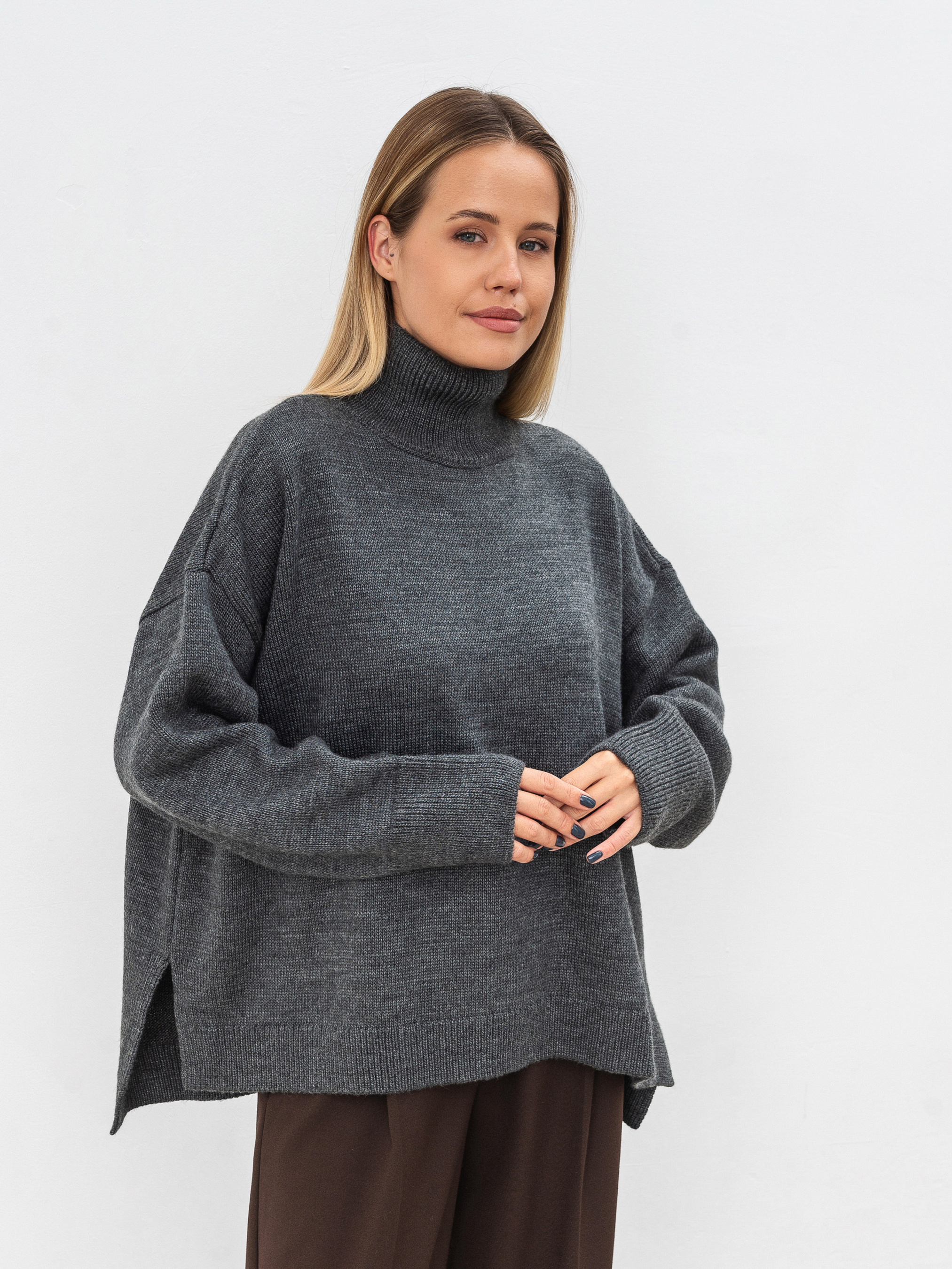 Трендовый свитер свободного фасона с высокой горловиной. Модель имеет широкие рукавчики, стойку горловины и спущенный плечевой шов. Теплый и уютный вариант для повседневных образов. Комбинировать советуем с юбками или классическими брюками, а дополнить пальто и высокими сапожками. Такие луки идеально подойдут для прогулок и рабочих будней. Длина по спине: 60 см Длина рукава: 43 см Полуобхват груди: 73 см Плечи: 74 см