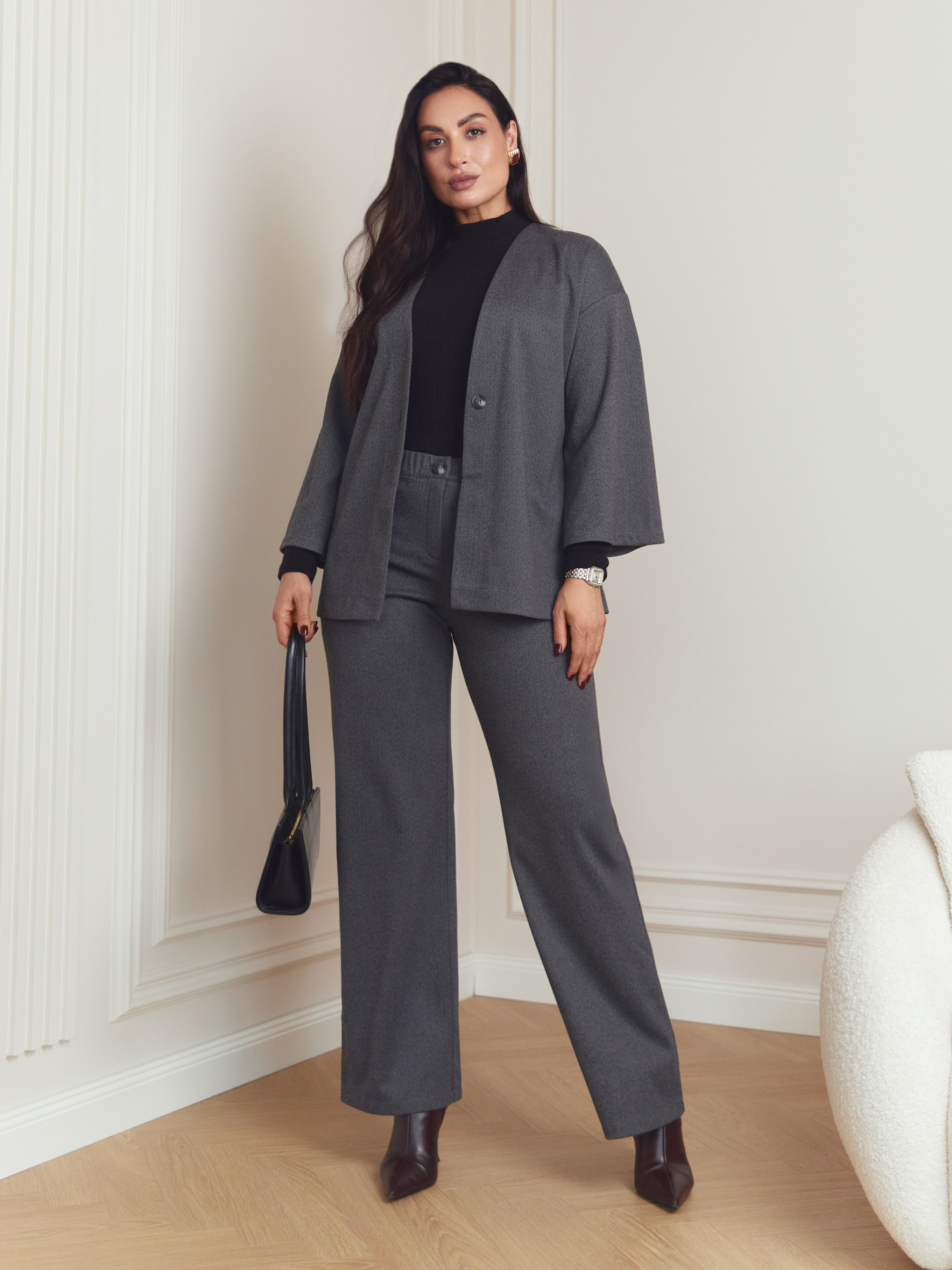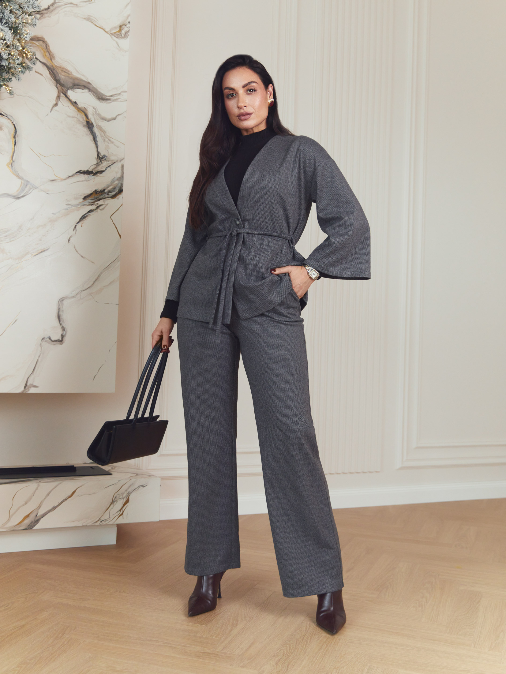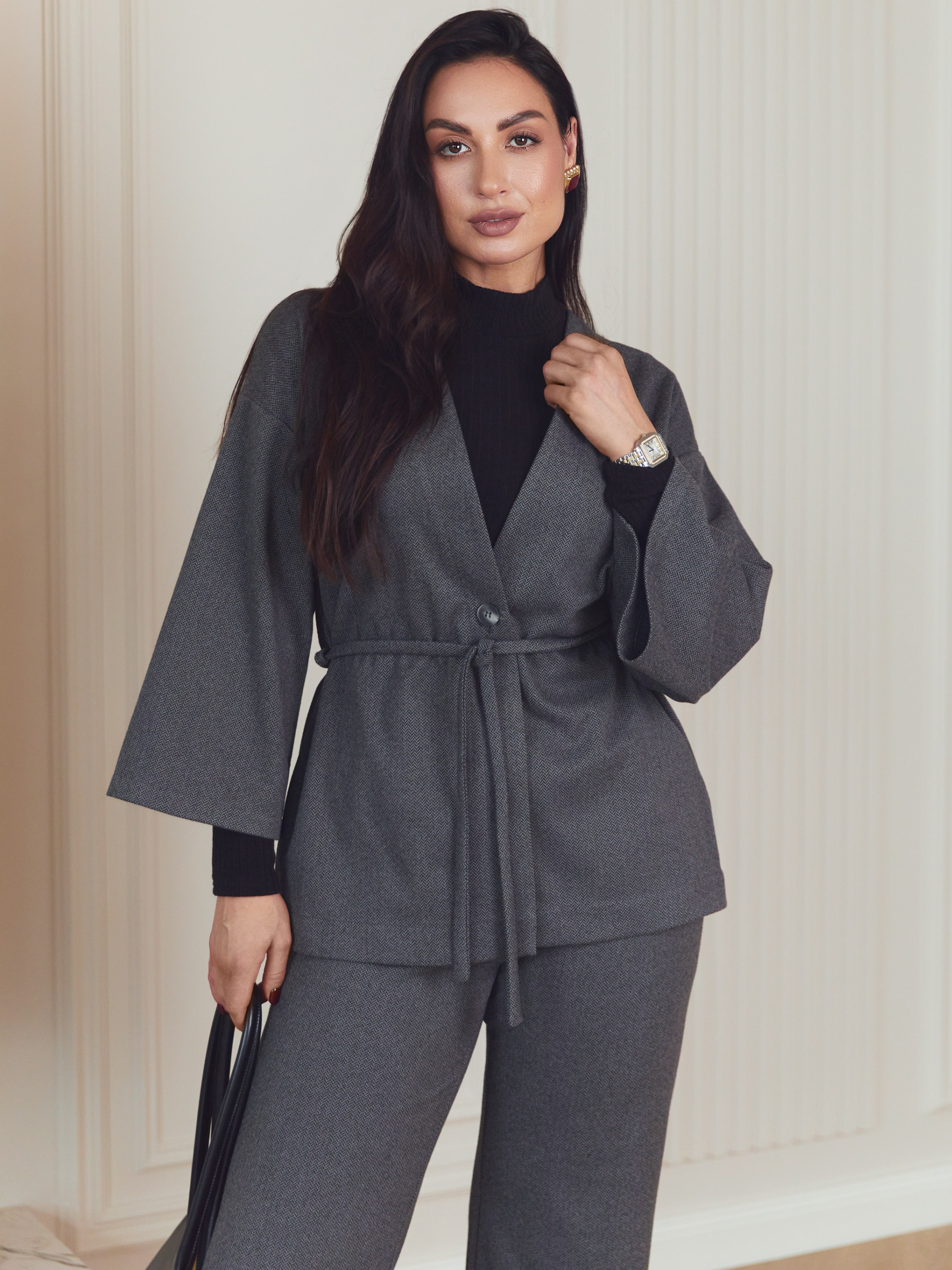 Кофта Seventeen 2384. | Winter 25 part 2 Эта кофта — о легкой свободе силуэта и продуманной простоте. Она создана для межсезонья, когда хочется мягкости форм, комфорта в движении и образа, выглядящего собранно без излишней строгости. Фасон Свободный крой формирует современный, непринужденный силуэт и позволяет легко адаптировать модель к разным типам фигуры. Приспущенная линия рукава придает расслабленность, а рукав длиной 3/4 сохраняет легкость образа. Пояс подчеркивает талию и позволяет регулировать посадку в соответствии с настроением. Материал Изделие выполнено из турецкой костюмной ткани с эффектом «шерсть» — плотной, приятной на ощупь и хорошо держащей форму. Материал удобен для осенне-весеннего сезона и сохраняет аккуратный вид в течение дня. Подробности Пуговицы выступают сдержанным функциональным акцентом, не перегружая дизайн. Комплектация из кофты и пояса позволяет создавать как свободные, так и акцентированные образы. Длина изделия и рукава S–M: длина изделия – 68 см, длина рукава – 40 см L–XL: длина изделия — 70 см, длина рукава — 40 см 2XL–3XL: длина изделия – 71 см, длина рукава – 40 см Уход Рекомендуется ручная стирка до 30° для сохранения структуры ткани и формы изделия. Размерная сетка S–M: обхват груди 84–88 см, талии 68–72 см, бедер 92–96 см L–XL: обхват груди 92–96 см, талии 76–81 см, бедер 100–105 см 2XL–3XL: обхват груди 100–105 см, талии 86–91 см, бедер 110–115 см