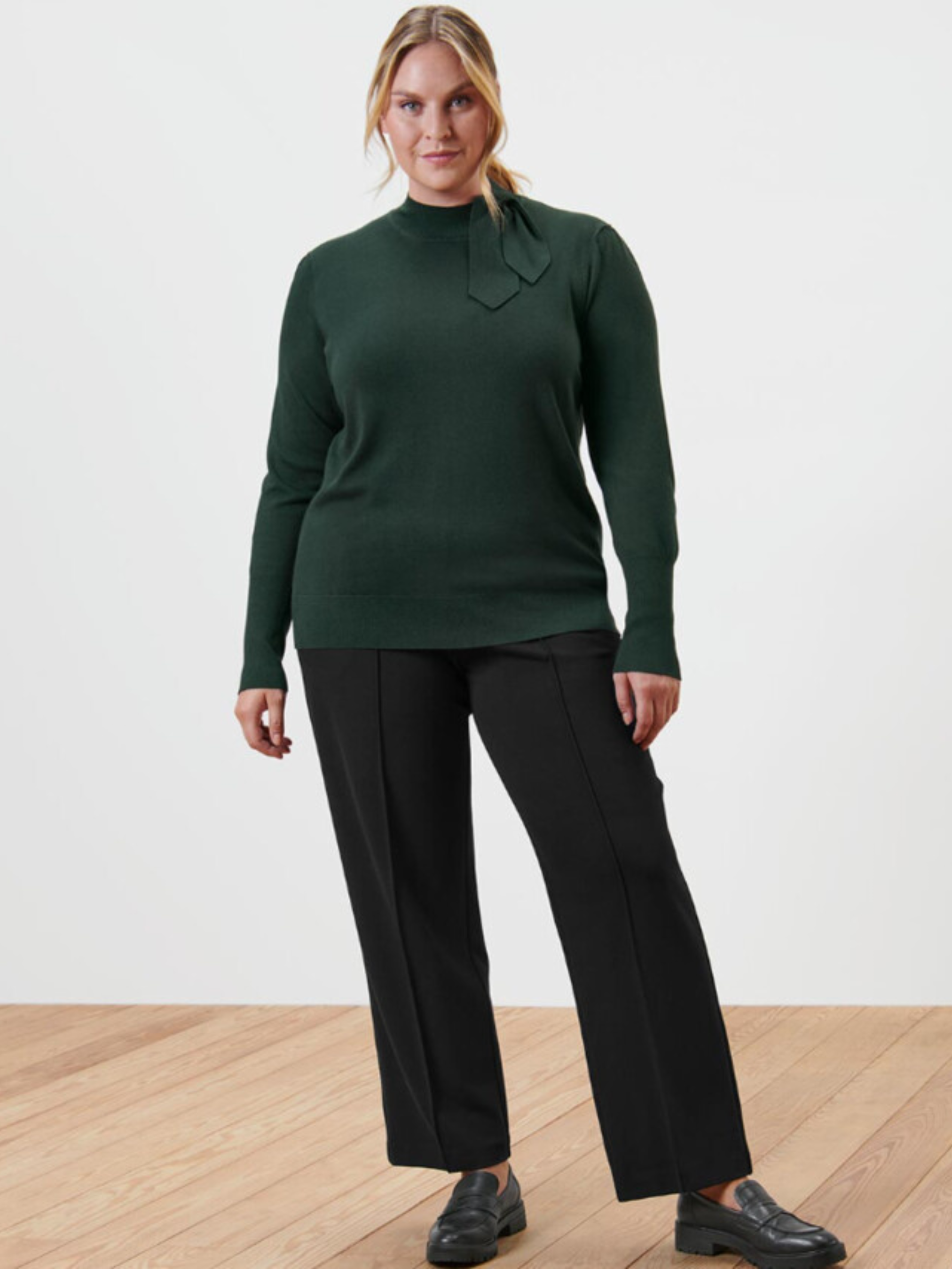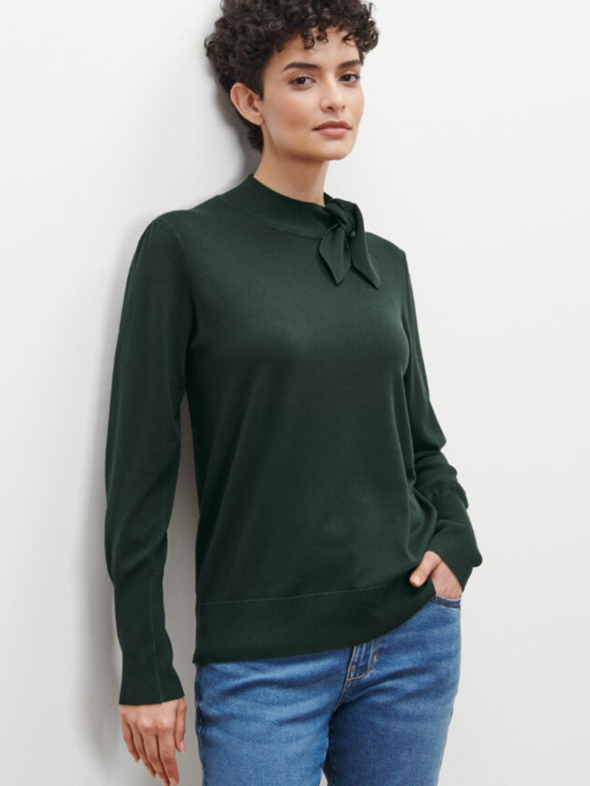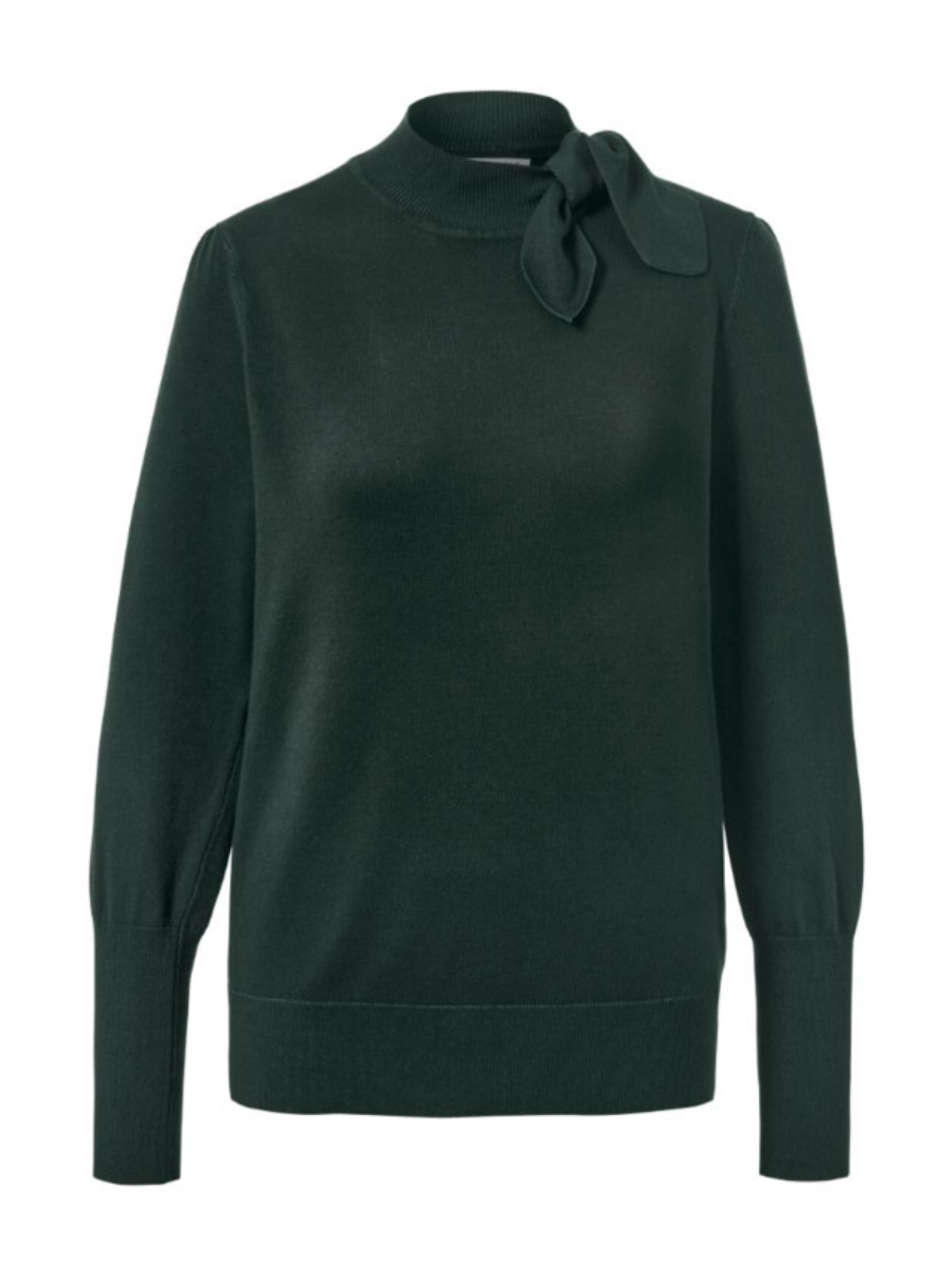 Маленький воротник-стойка с бантом Небольшая сборка на плечи Эластичные манжеты в рубчик на воротнике, рукавах и подоле. Бант можно снять перед стиркой цвет Темно-зеленый материал 70% вискоза, 30% полиамид Уважаемые покупатели! Одежда бренда практически вся без бумажных этикеток, за редким исключением, и со срезанными частично или полностью внутренними бирками и ярлыками с составом ткани и другими данными.