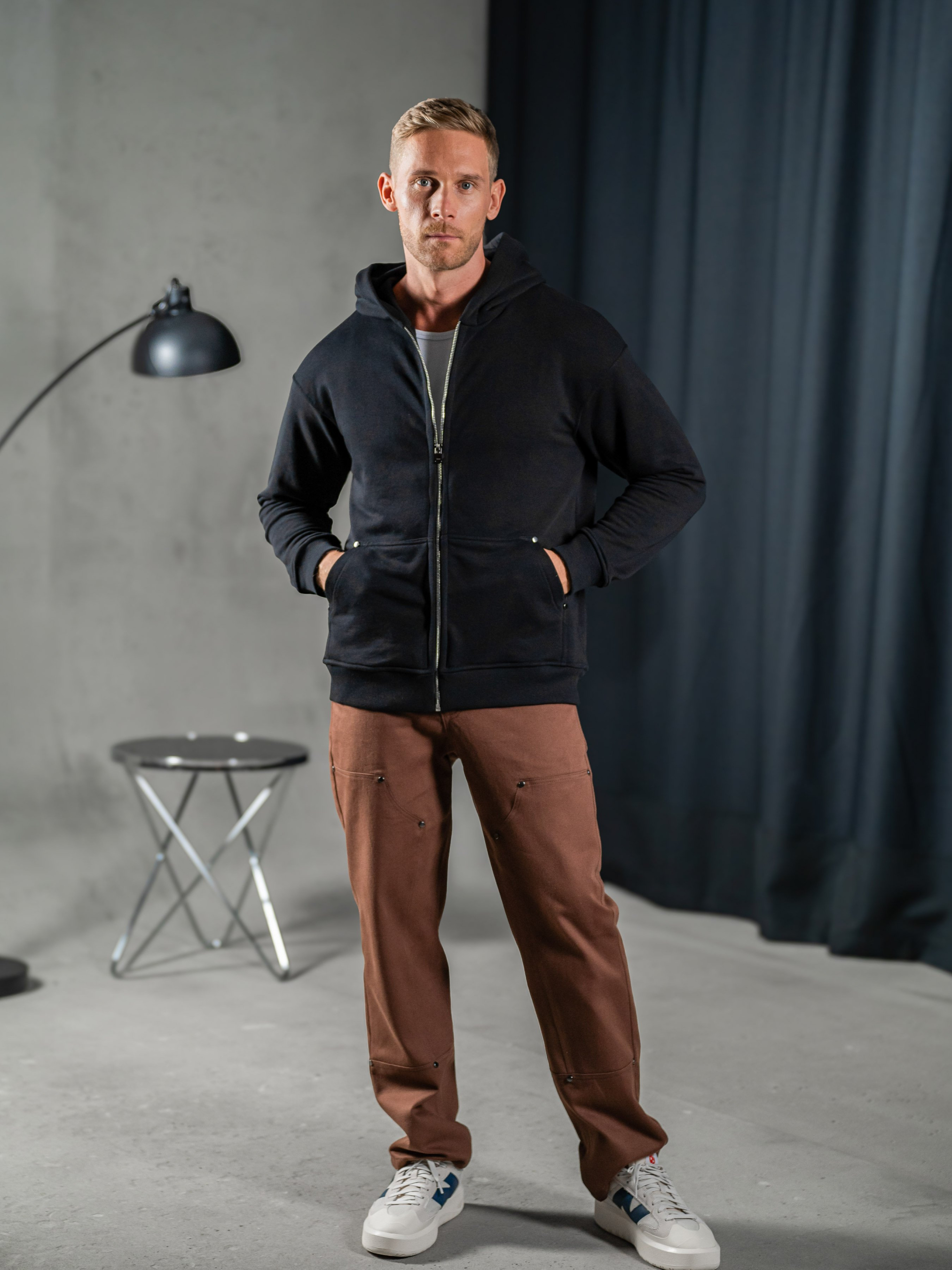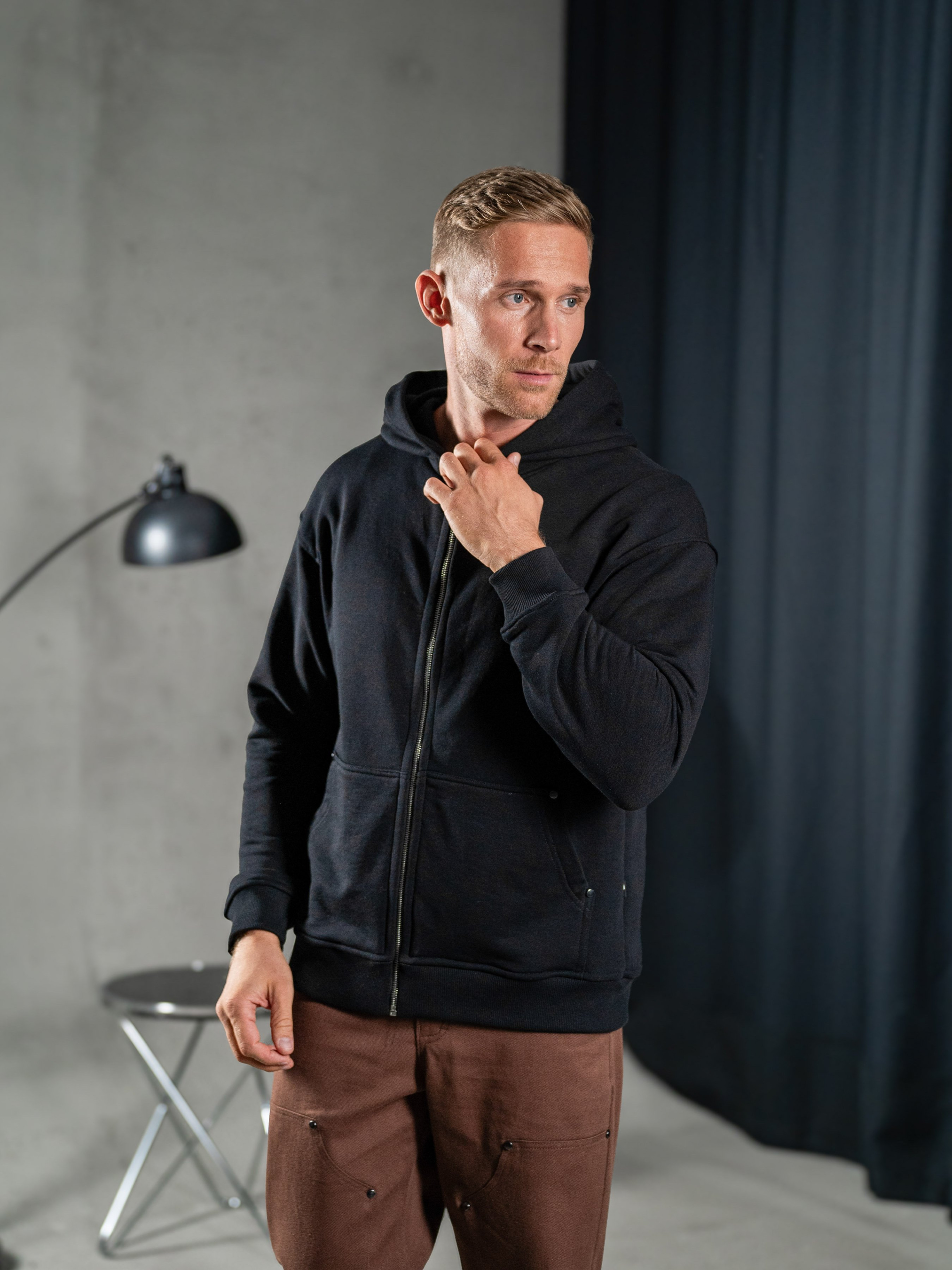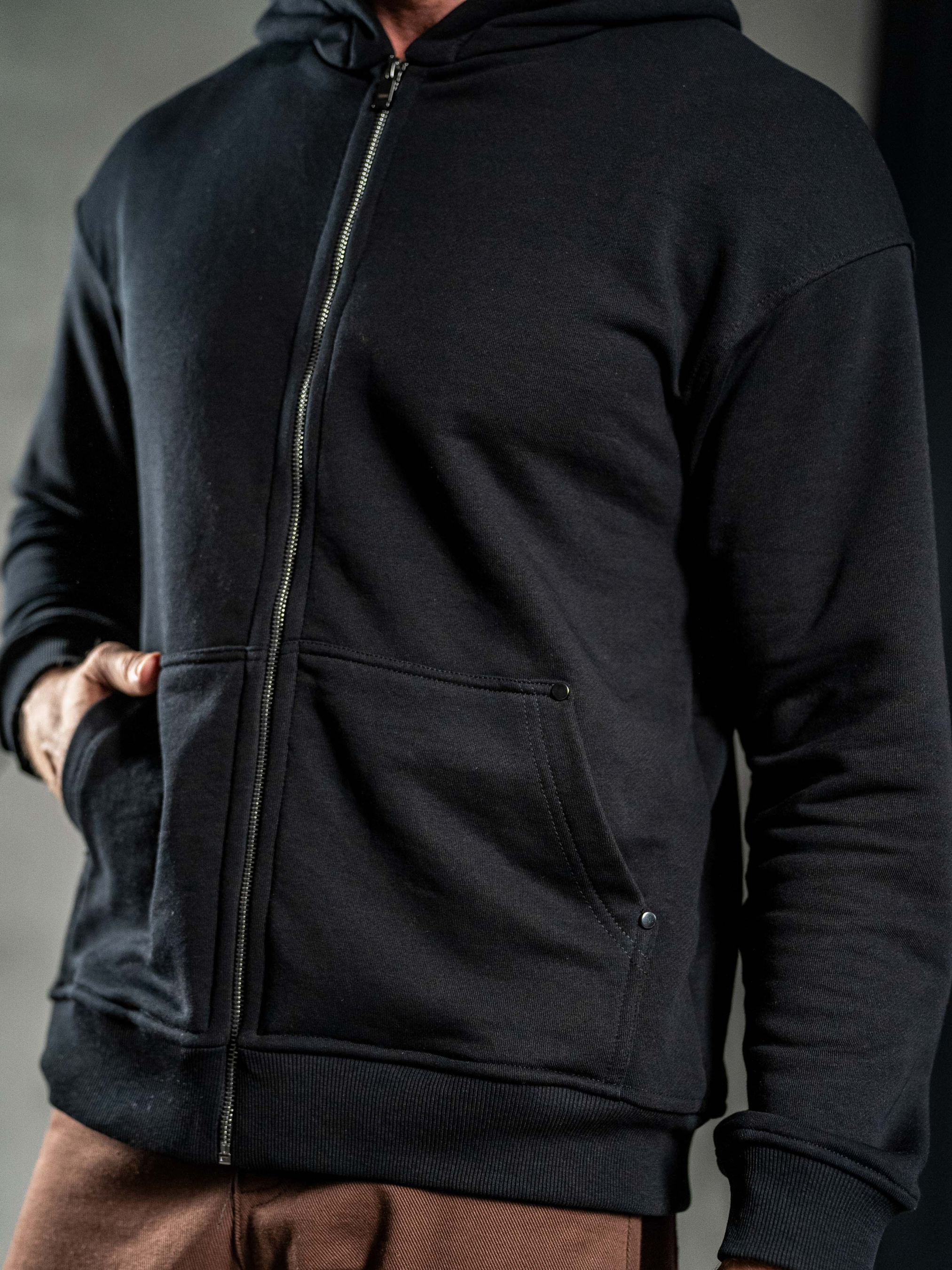 Мужская однотонная толстовка на молнии свободного кроя с эластичным поясом и манжетами, объемным капюшоном и боковыми карманами кенгуру. Выполнен из высококачественной ткани, Тринитка петля 320г/м², состав Хлопок 95%, Эластан 5%.