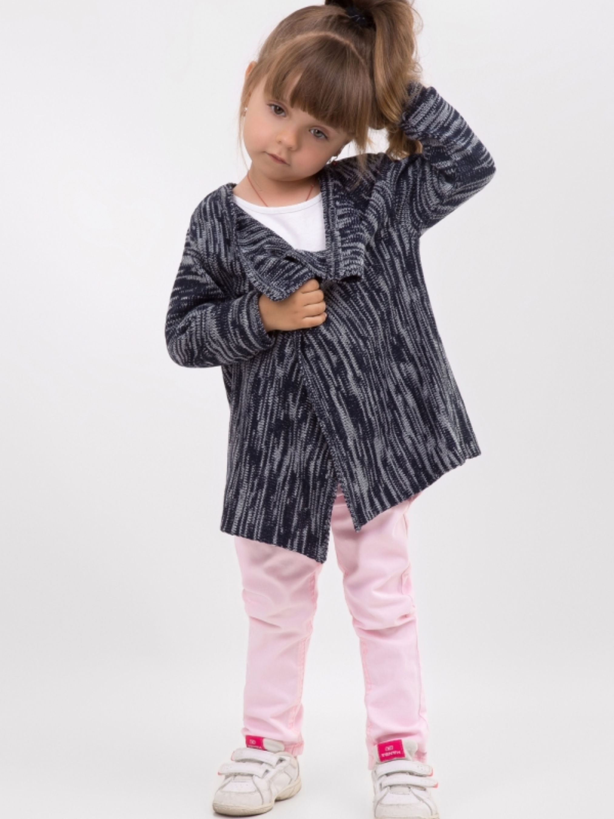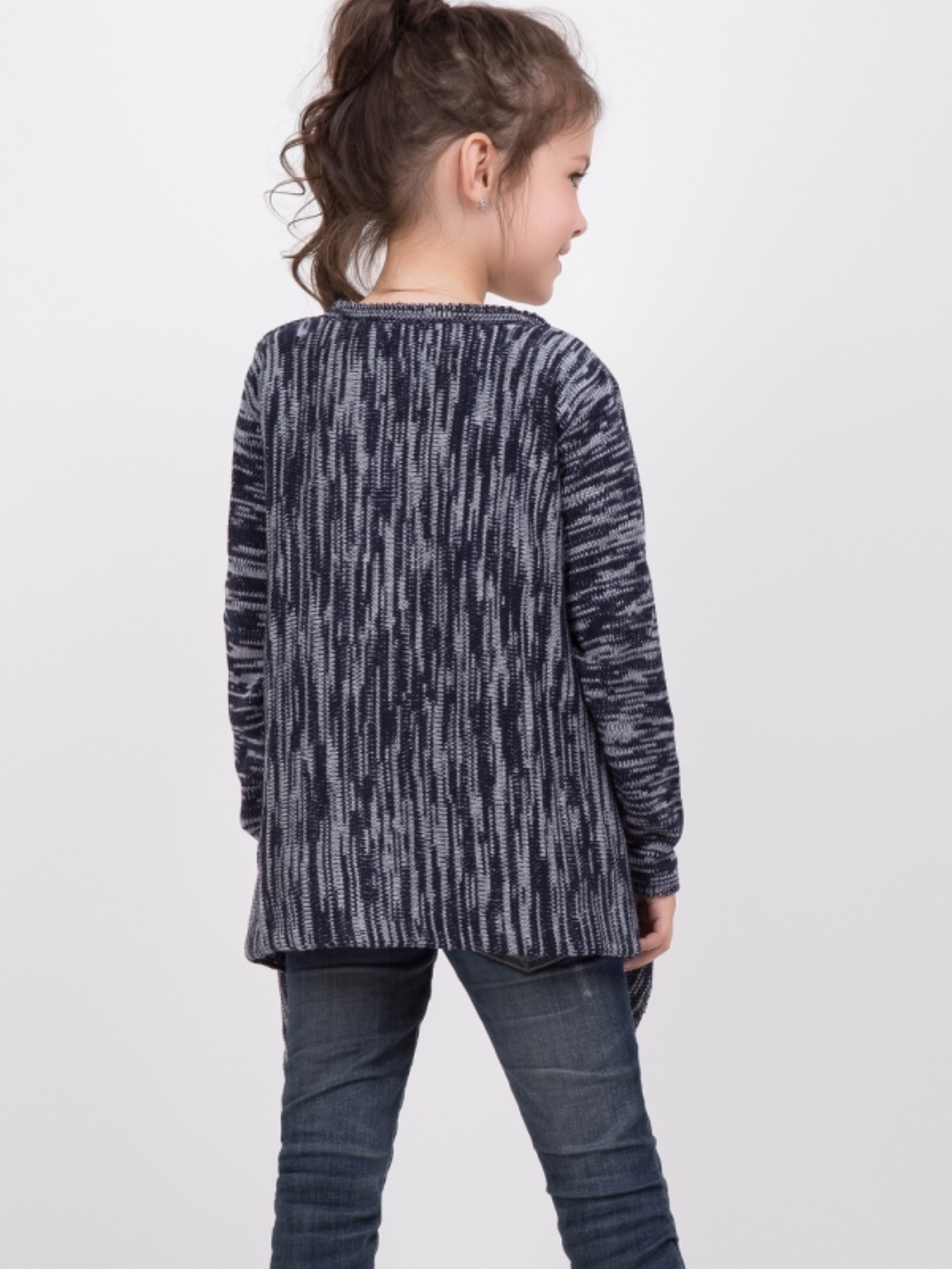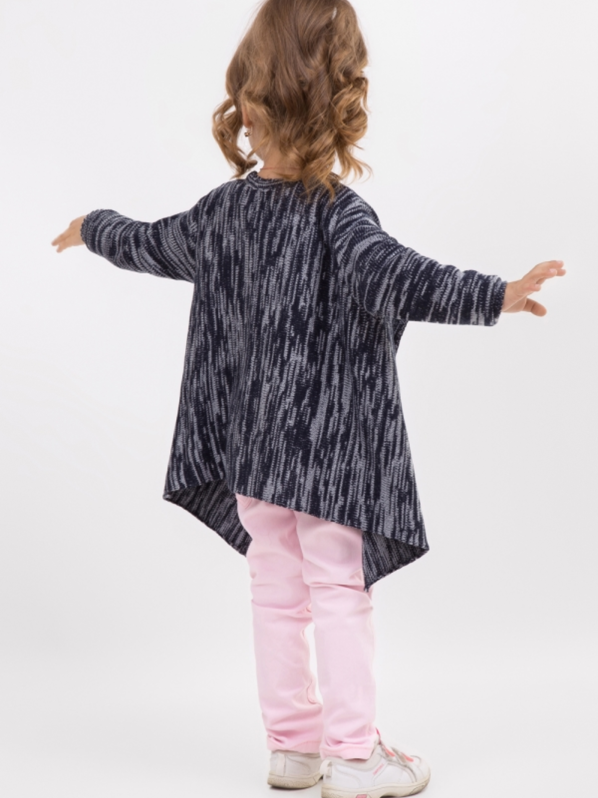 Цей стильний подовжений кардиган для дівчаток виконаний з м'якої та приємної пряжі з невеликим включенням вовни, що надає йому м'якості та тепла. Модель має ефектний меланж контрастних кольорів, що додає виробу оригінальності та стилю. Кардиган має вільний крій без застібки, що нагадує накидку, що робить його зручним для носіння та легким у вдяганні. Така модель стане незамінною в прохолодні дні або як верхній виріб на початку осіннього сезону. • Матеріал: м'яка пряжа з вовною • Довжина по спинці: 40–48 см (+- 2 см) • Довжина рукава (від плеча): 36–42 см (+- 2 см) Цей кардиган подарує комфорт та затишок у прохолодні дні, підкреслюючи стиль вашої маленької модниці.