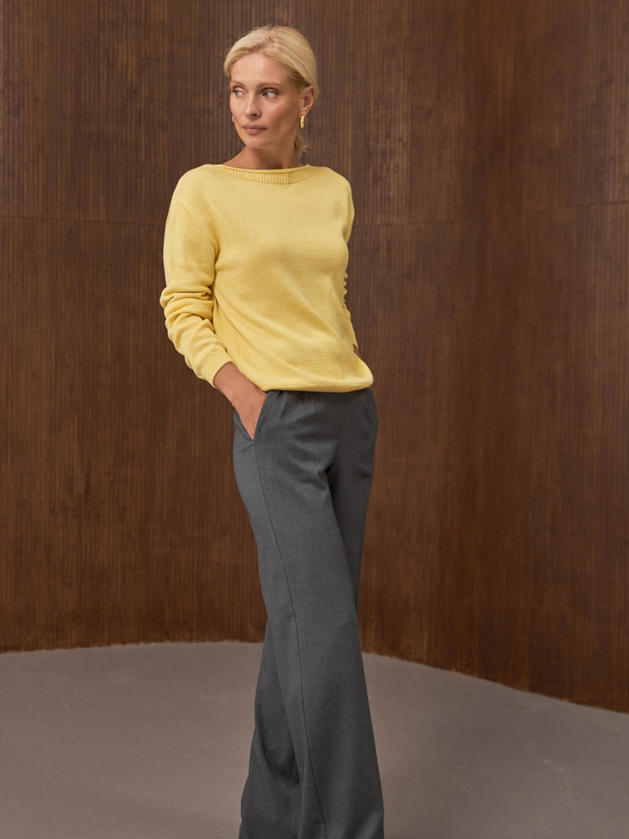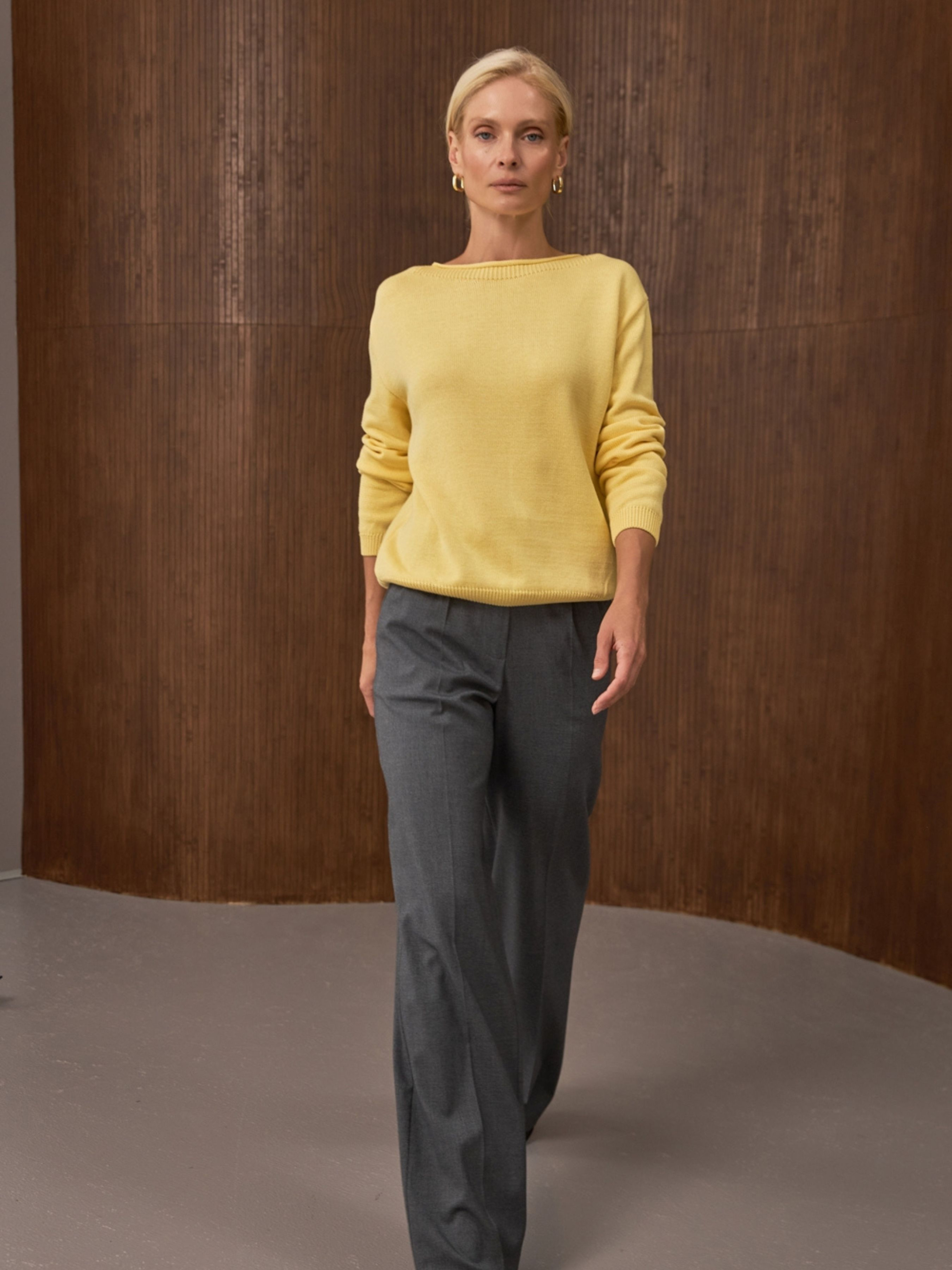 Стильний жіночий джемпер вільного силуету, виконаний із м’якої бавовняної пряжі гладкої та стабільної в’язки. Лаконічний дизайн підкреслений елегантною горловиною форми «човник», що додає образу жіночності та витонченості. Спущена лінія плеча створює невимушений, розслаблений стиль, а фіксуюча резинка на рукавах і по низу виробу забезпечує акуратний та завершений вигляд. Особливості моделі: Горловина форми «човник» Вільний комфортний силует Спущене плече Фіксуюча резинка на рукавах та по низу Матеріал: бавовняна пряжа Сезон: весна, осінь, зима Стиль: повсякденний / casual Ідеальний вибір як для поєднання з джинсами, так і для створення більш елегантних луків з класичними брюками чи спідницями.