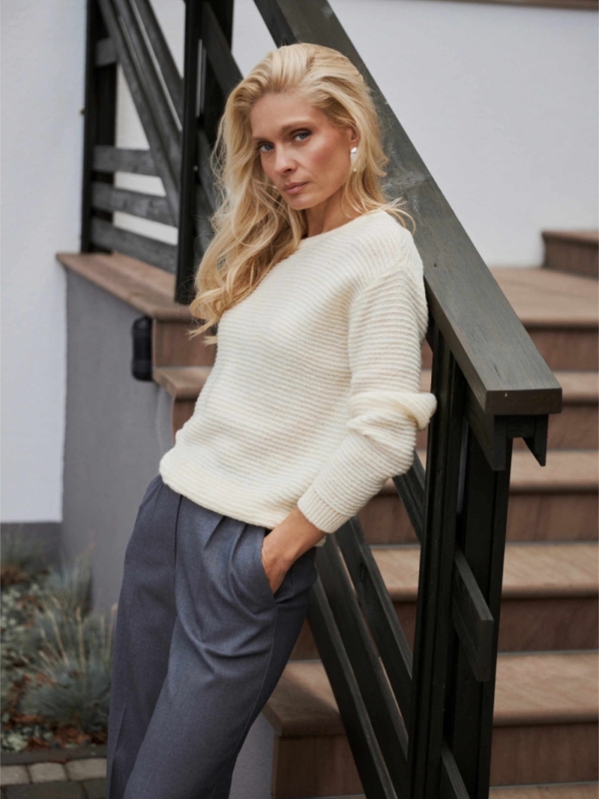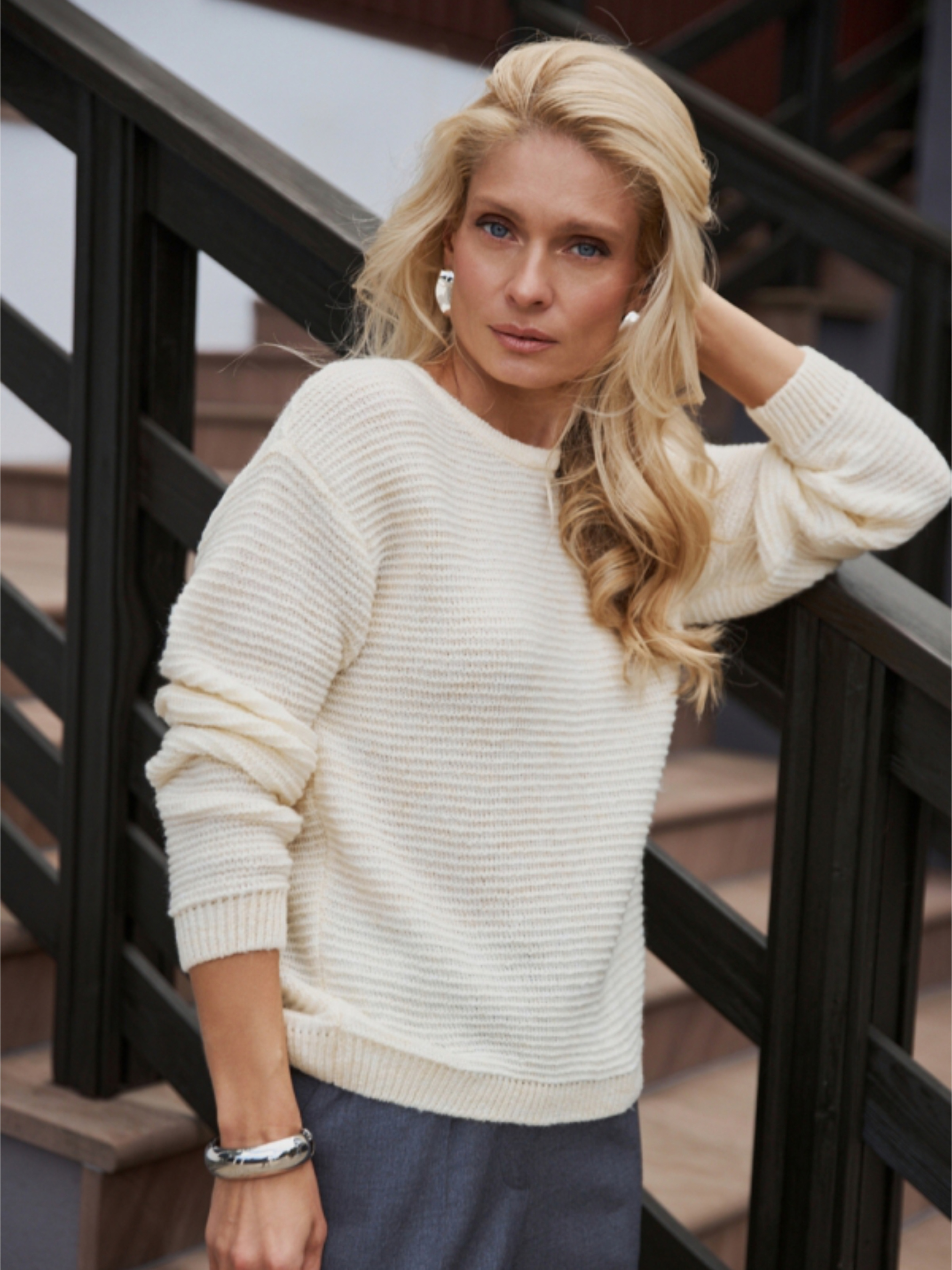 Легкий, повітряний та водночас теплий джемпер, виготовлений із м’якої натуральної вовняної пряжі. Делікатна напівпрозора в’язка додає образу вишуканості, а вільний силует і комфортна спущена лінія плеча забезпечують максимальний комфорт у повсякденному носінні. Чудово поєднується з джинсами, брюками чи спідницями — універсальна база для стильних демісезонних образів. Характеристики: Довжина виробу: 58–64 см (±2 см) Ширина: у спокійному стані: 49–55 см, у розтягнутому стані: 55–61 см Рукав: довжина 53 см + ширина плеча 13,5–15,5 см Склад: вовна мериноса — 60%, вовна альпаки — 15%, мохер — 10%, поліамід — 15% Матеріал: трикотаж Силует: вільний, легкий В’язка: делікатна, напівпрозора Горловина: класична кругла Переваги: натуральні теплі волокна: меринос + альпака + мохер дуже приємний до тіла, не колеться м’яко облягає, не сковує рухів стильний універсальний дизайн ідеальний для демісезону та прохолодних приміщень Догляд: ручне або дуже делікатне прання до 30 °C використовувати м’які засоби для вовни не викручувати, сушити горизонтально не відбілювати прасувати при низькій температурі (за потреби)