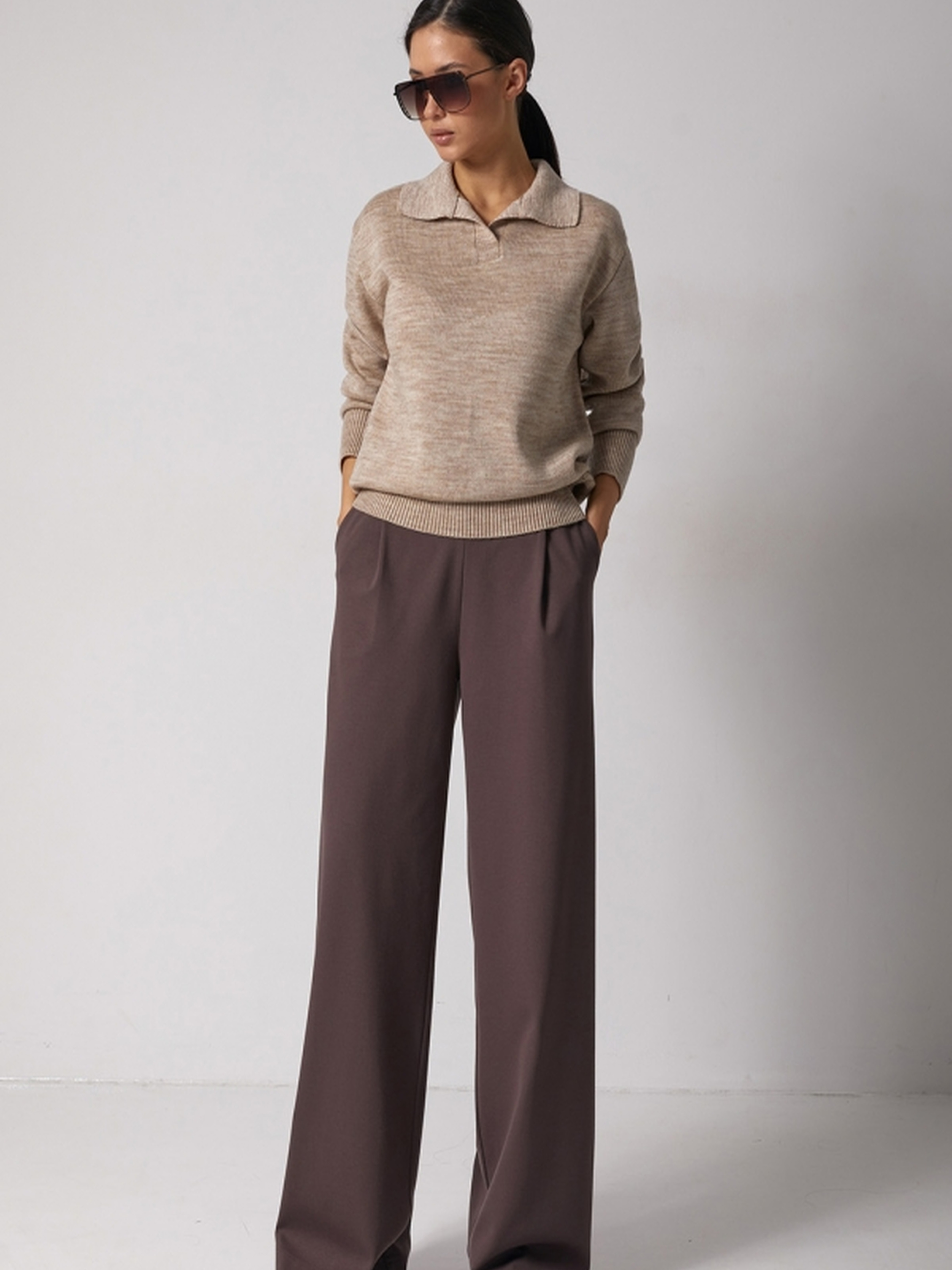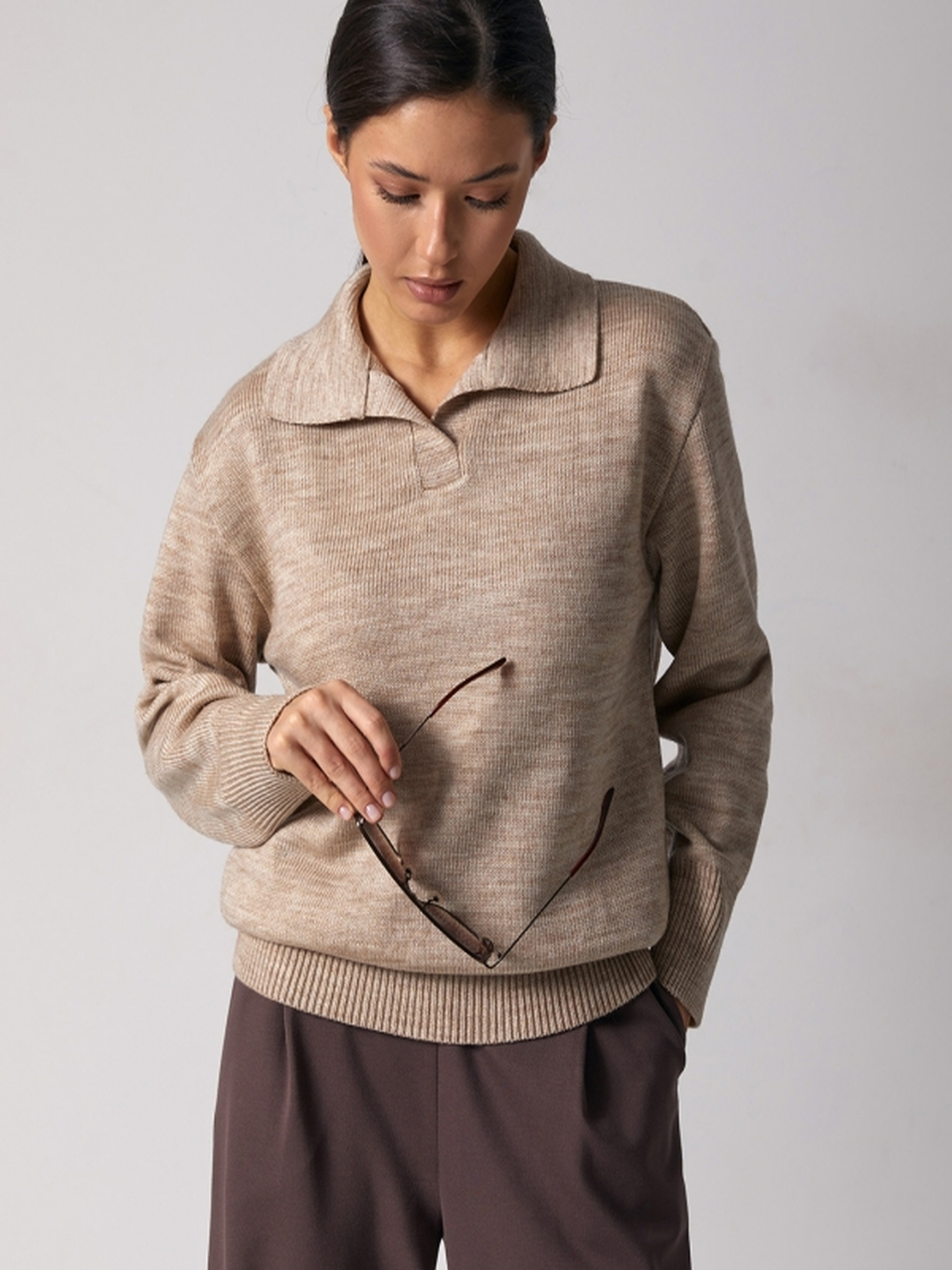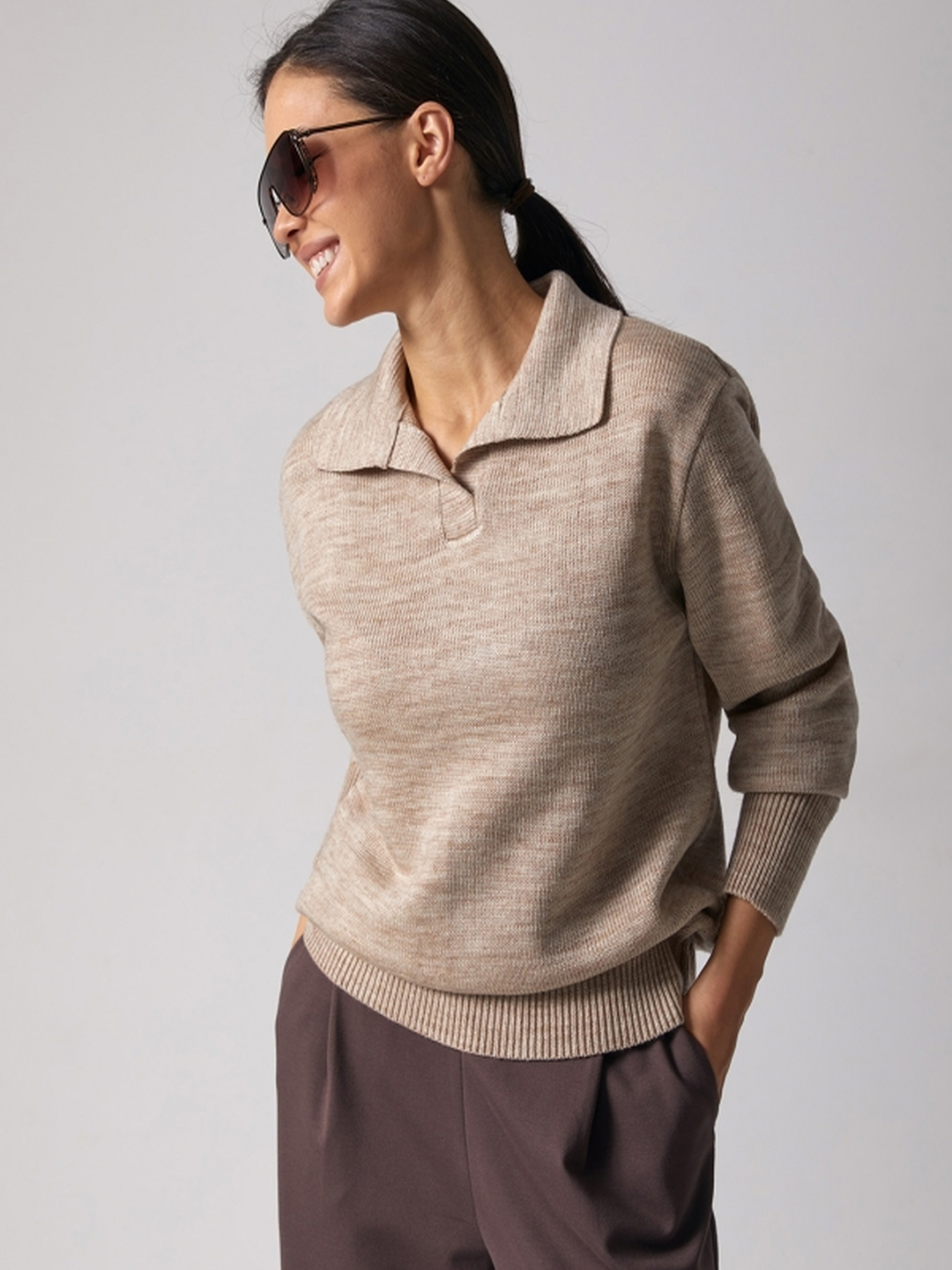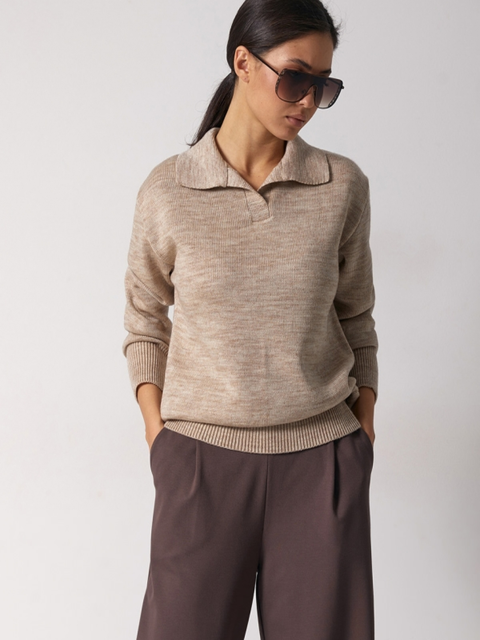 Стильний та комфортний светр-поло – це поєднання класики та сучасного дизайну. Виконаний із напіввовняної пряжі, він забезпечує тепло, м'якість та комфорт у носінні. Завдяки пластичному та стабільному переплетенню, виріб добре тримає форму і створює ідеальний силует. • Прямий силует підходить для різних типів фігури, даруючи свободу рухів.• Спущена лінія плеча додає розслабленості та елегантності.• Чисто вив'язаний V-подібний виріз доповнений стильним відкладним комірцем-поло. Розмірні параметри:• Довжина виробу: 65-68-71 см (+- 2 см).• Ширина під проймою та у талії: 49-52-55 см (у спокійному стані), 55-58-61 см (у розтягнутому).• Ширина по низу: 42-45-48 см (у спокійному стані), 48-51-54 см (у розтягнутому).• Довжина рукава: 53-54-55 см.• Ширина плеча: 14-15-16 см.• Висота пройми: 25-26-27 см.• Висота коміра: 9 см.• Висота манжети: 10 см.• Глибина вирізу: 12 см. Ідеально поєднується з класичними брюками, джинсами або спідницями, створюючи стильний образ для будь-якої нагоди. Замовляйте зараз та насолоджуйтеся якістю та комфортом!