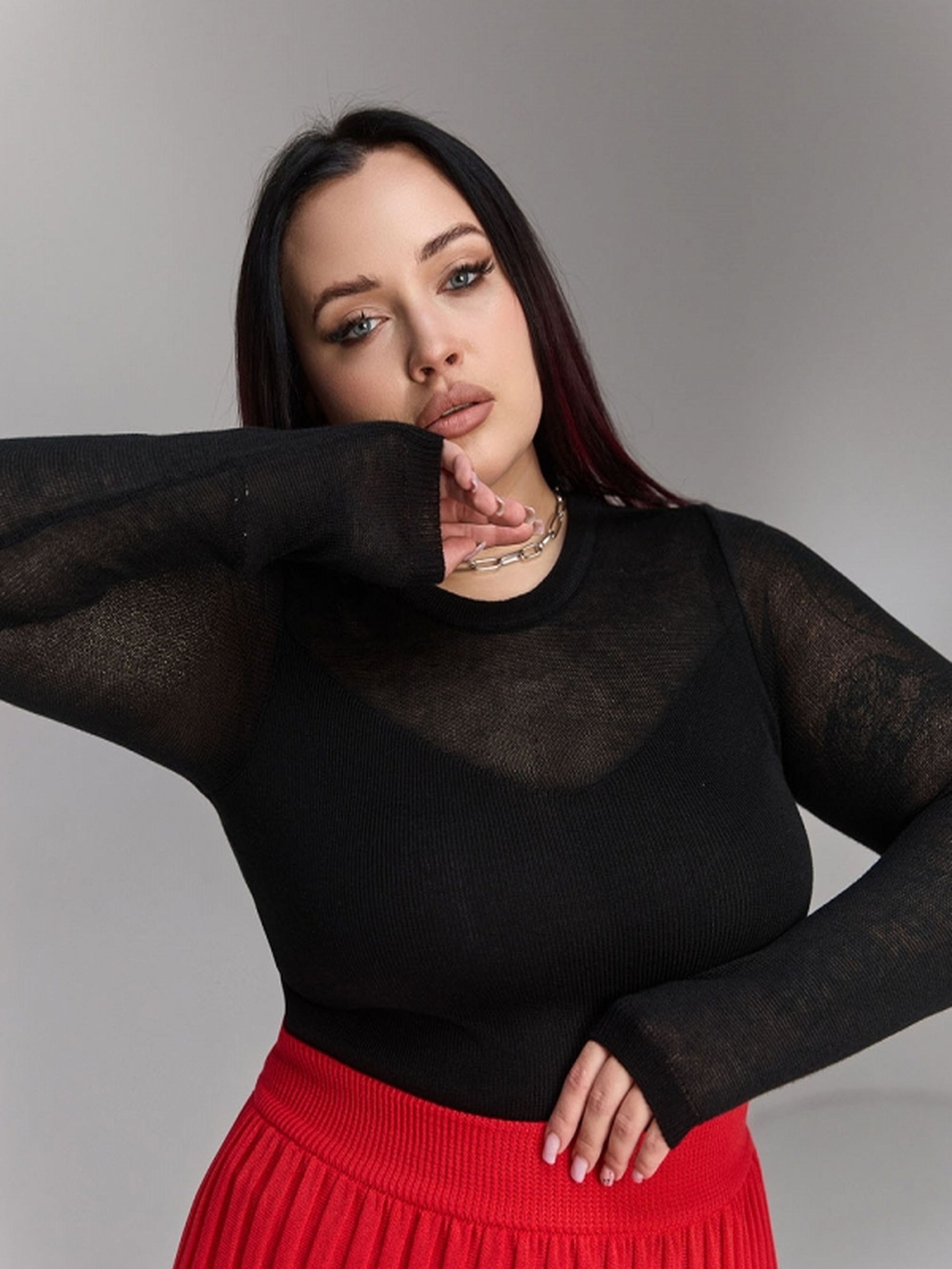 Цей елегантний лонгслів виготовлений з супертонкої пряжі високої якості, що включає віскозу та бавовну, що надає йому неймовірної легкості та приємного дотику до шкіри. Напівпрозорий лонгслів прямого силуету з гладким переплетенням має акцентне декольте у формі трикутника, яке додає виробу жіночності та витонченості. Особливості:• Матеріал: супертонка пряжа люксової якості з віскозою та бавовною.• Переплетення: гладке, напівпрозоре.• Довжина: близько 54-56-58 см (+- 2 см).• Ширина під проймою та у талії в спокійному нерозтягнутому стані: 33-35-37 см, в розтягнутому стані: 41-43-45 см.• Ширина по низу в спокійному нерозтягнутому стані: 29-31-34 см, в розтягнутому стані: 41-43-45 см.• Довжина рукава: 66 см.• Ширина плеча: 6-7 см. Цей лонгслів є ідеальним вибором для створення легких і витончених образів, додаючи елегантності та повітряності будь-якому комплекту.