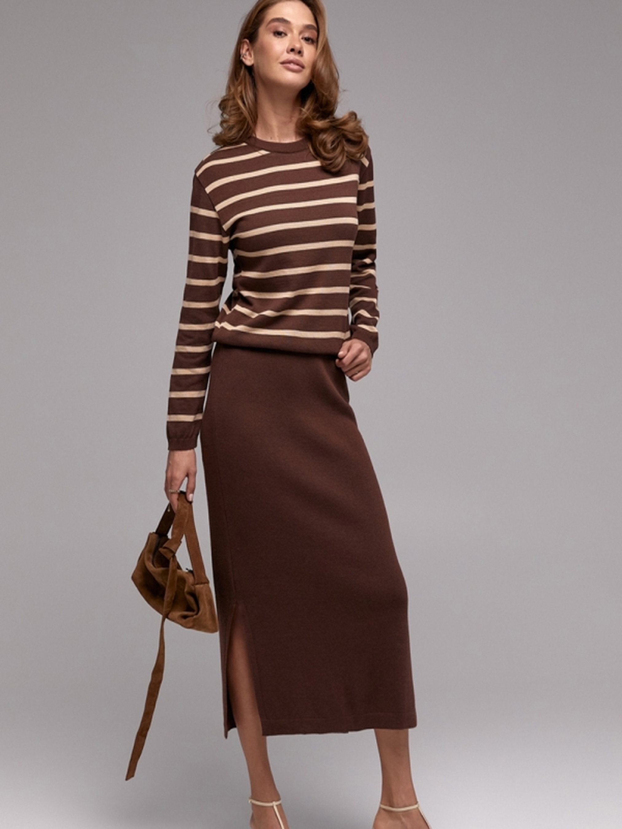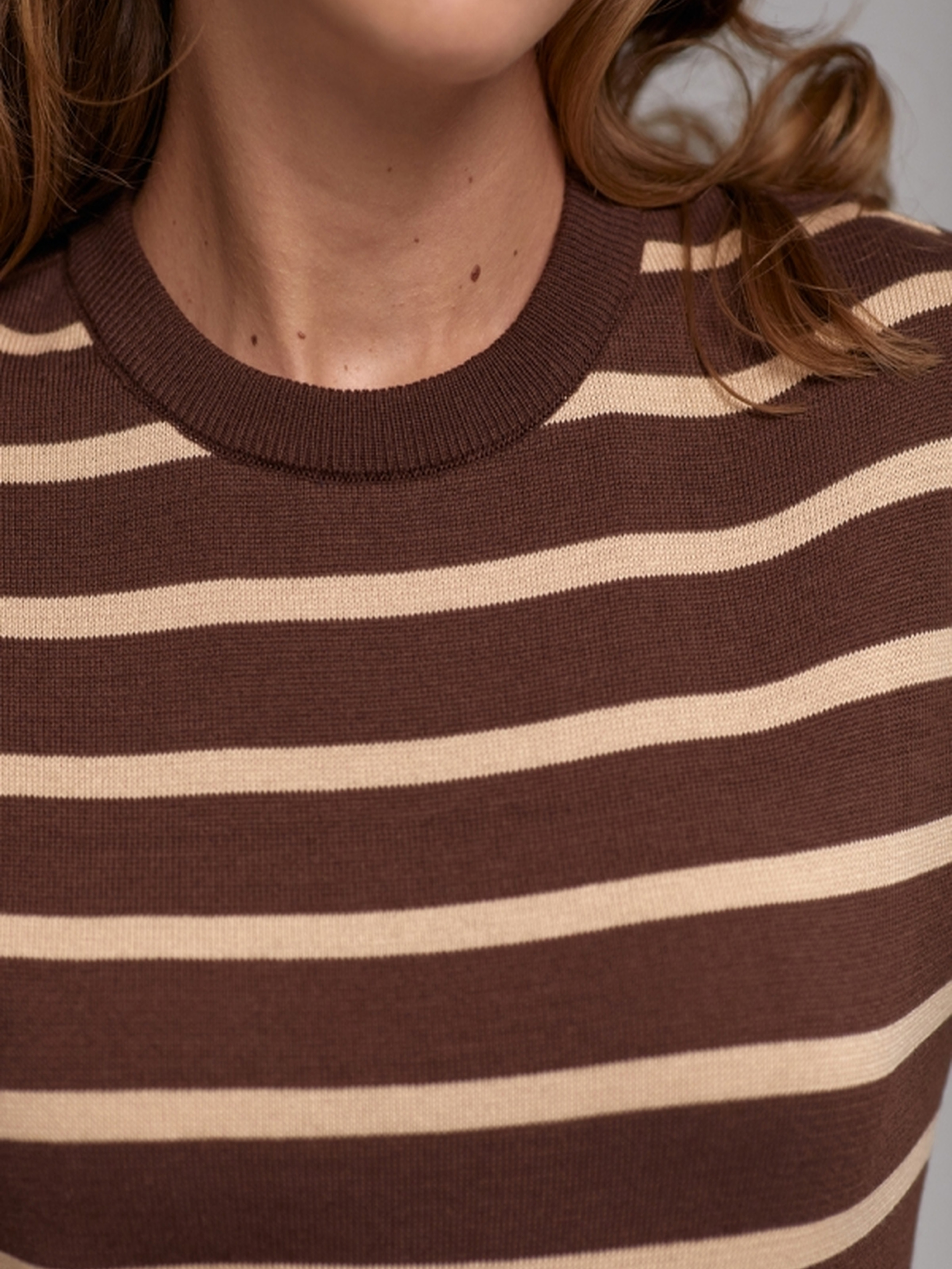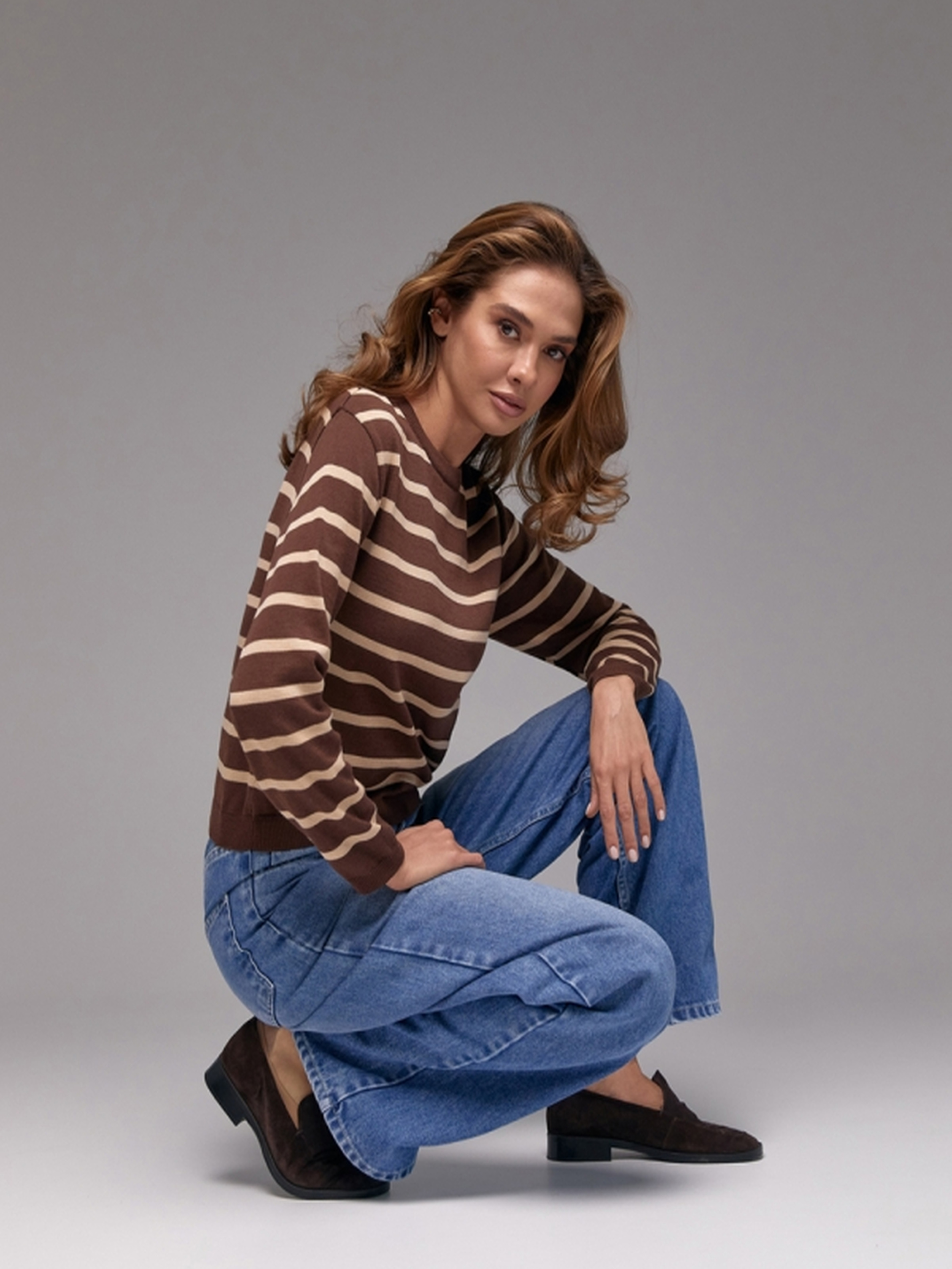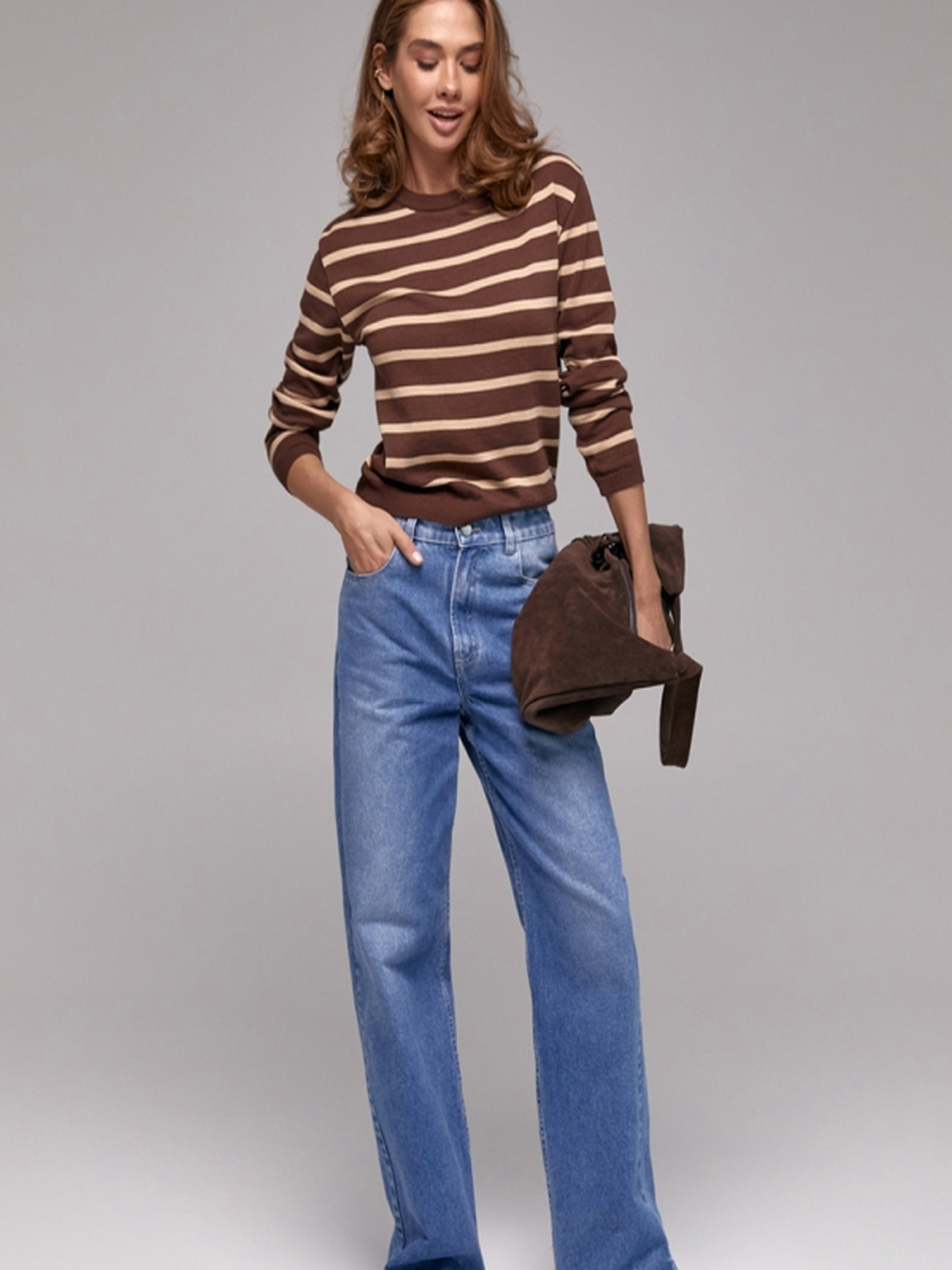 Стильний джемпер у смужку – вдале поєднання трендовості, комфорту та якості. Виконаний із шовковистої віскозної пряжі з включенням бамбукових волокон, він забезпечує приємні тактильні відчуття, гарно дихає та дарує комфорт протягом усього дня. • Тонка стабільна в’язка забезпечує зносостійкість і гарну посадку.• Прямий крій підходить для різних типів фігури.• Охайна кругла горловина додає універсальності та елегантності.• Комфортний рукав та акцентні смужки створюють стильний образ. Розмірні параметри:• Довжина виробу: 57-61-64 см (+- 2 см).• Ширина по проймі та у талії: 46-51-55 см (у спокійному стані), 52-57-61 см (у розтягнутому).• Ширина по низу: 37-42-46 см (у спокійному стані), 43-48-52 см (у розтягнутому).• Довжина рукава: 57 см.• Ширина рукава по низу: 9-10 см.• Висота манжети: 4 см.• Ширина плеча: 13-14-15 см.• Висота коміра: 2,5 см. Створюйте модні поєднання з брюками, джинсами чи спідницями, доповнюючи як діловий, так і casual-образ. Замовляйте зараз і додайте до гардеробу стильний акцент!